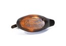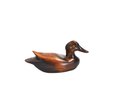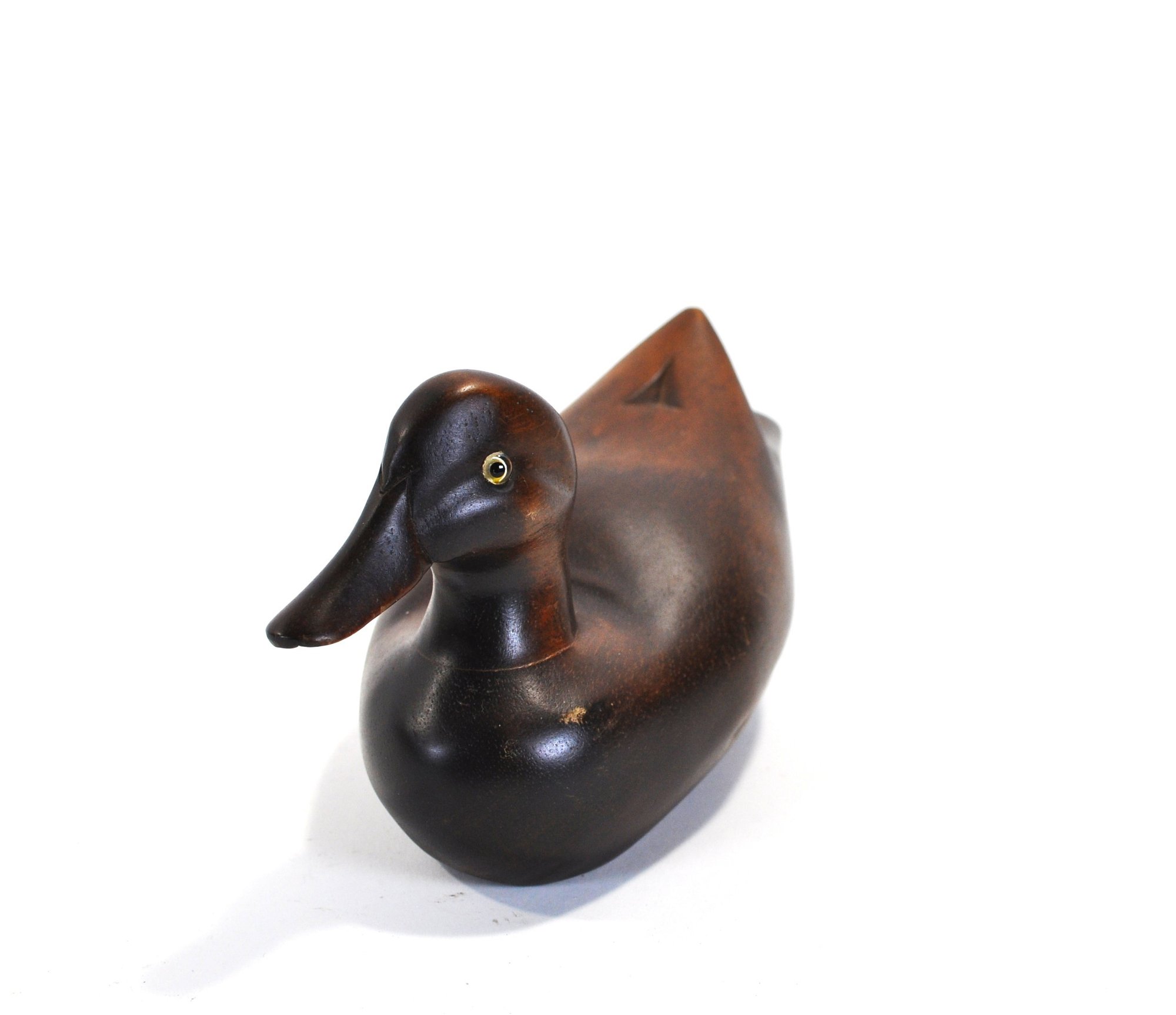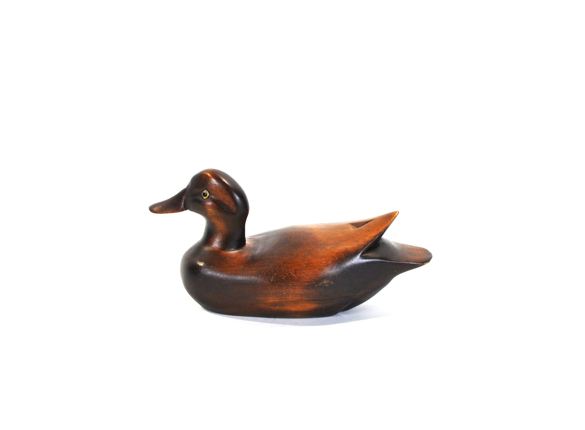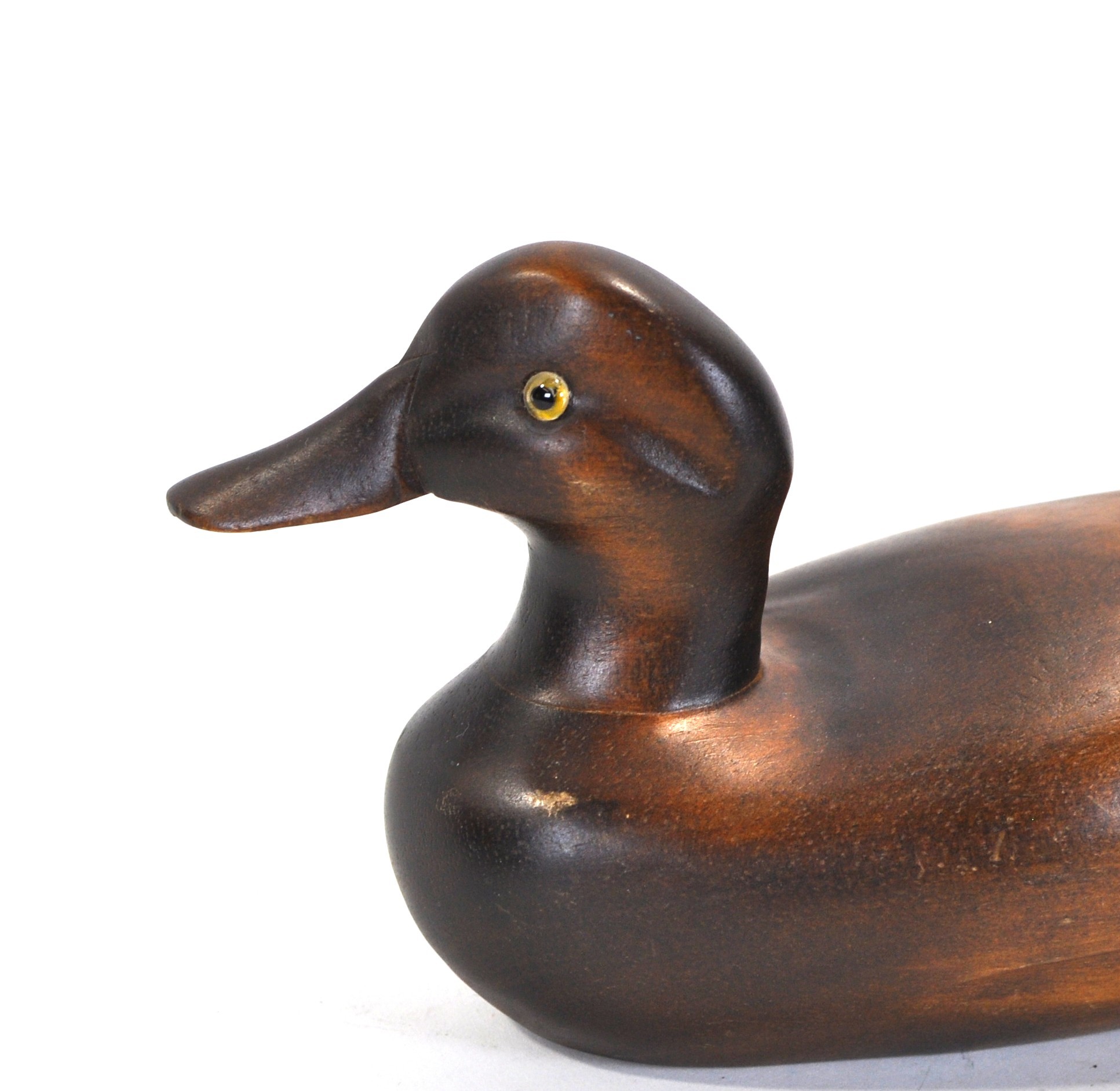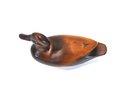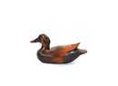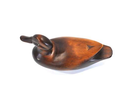 Hand-carved wooden duck decoy with a smooth sculptural form and rich brown finish highlighting the natural grain of the wood. The decoy features a gently rounded body, carved wing detail at the tail, and inset glass eyes, giving it an elegant folk-art presence.