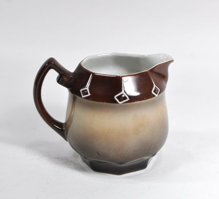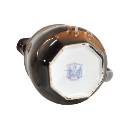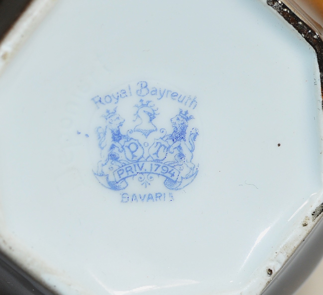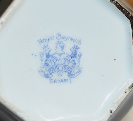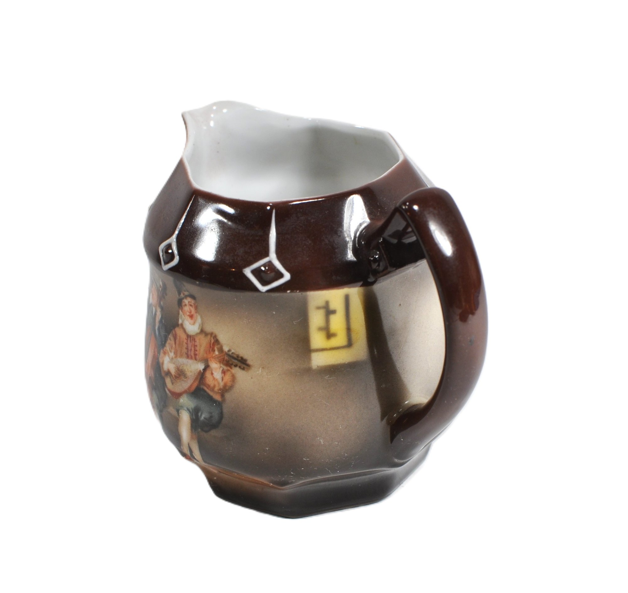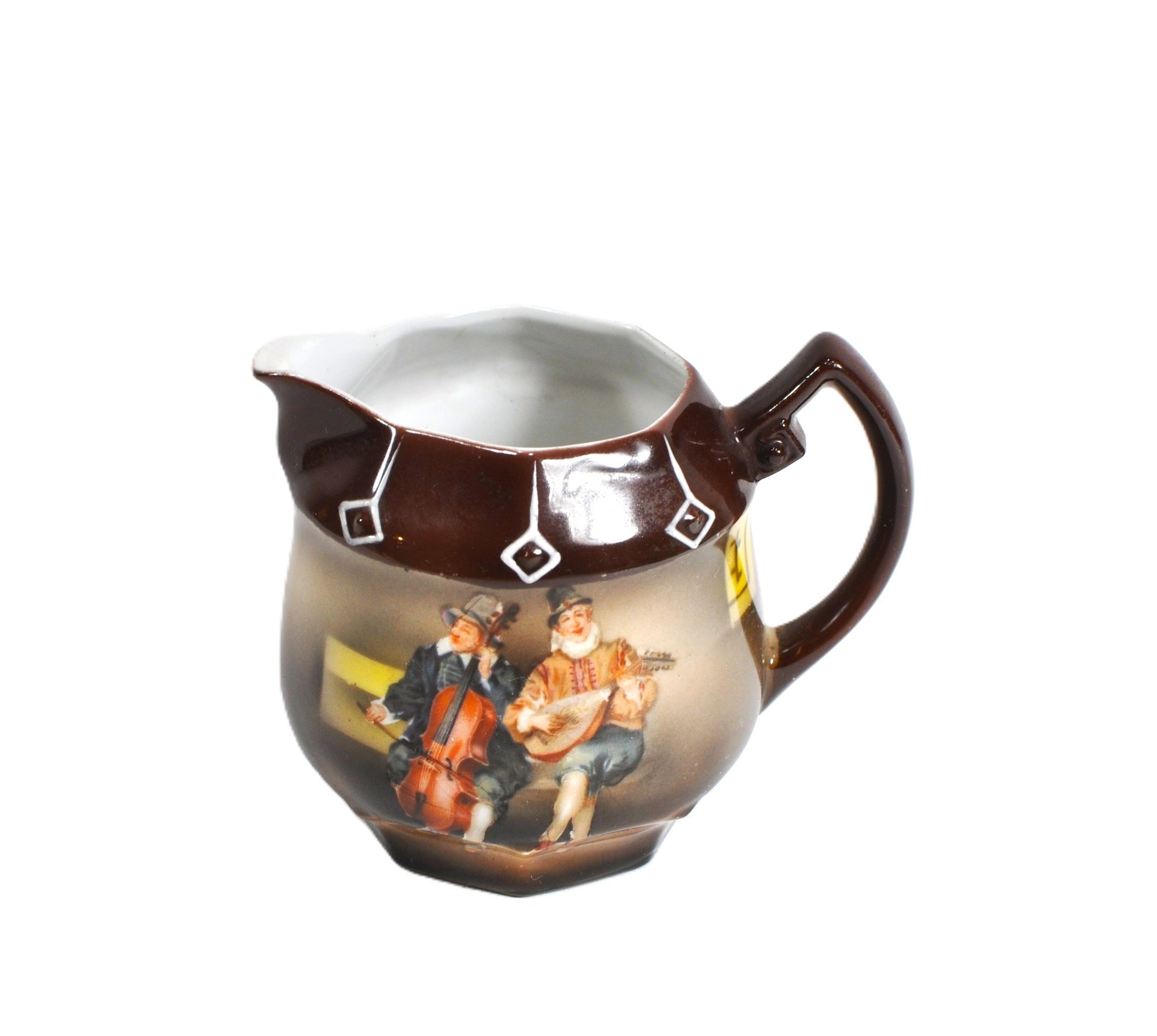 Vintage Royal Bayreuth porcelain creamer, Bavaria, featuring a hand-painted musical scene with figures playing string instruments. Faceted body with brown glazed rim and handle; marked Royal Bayreuth / Bavaria on the base.