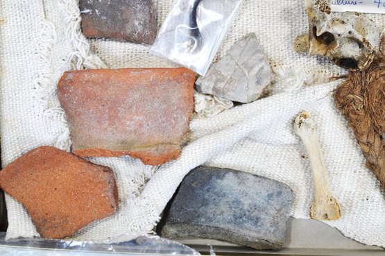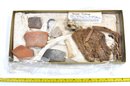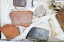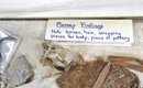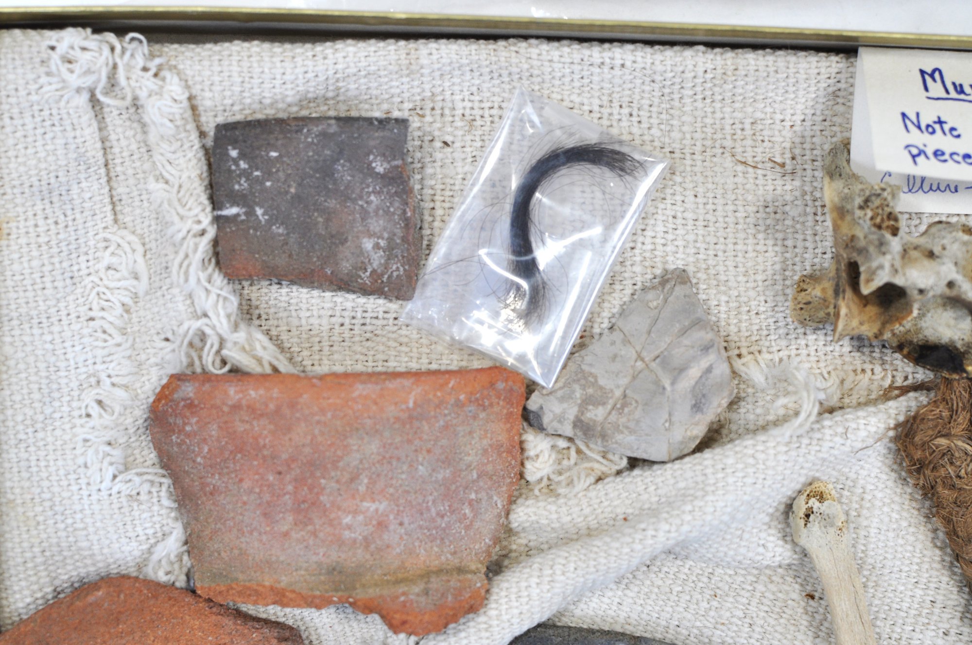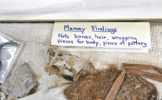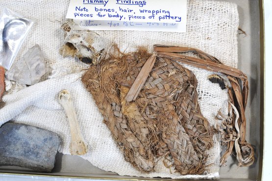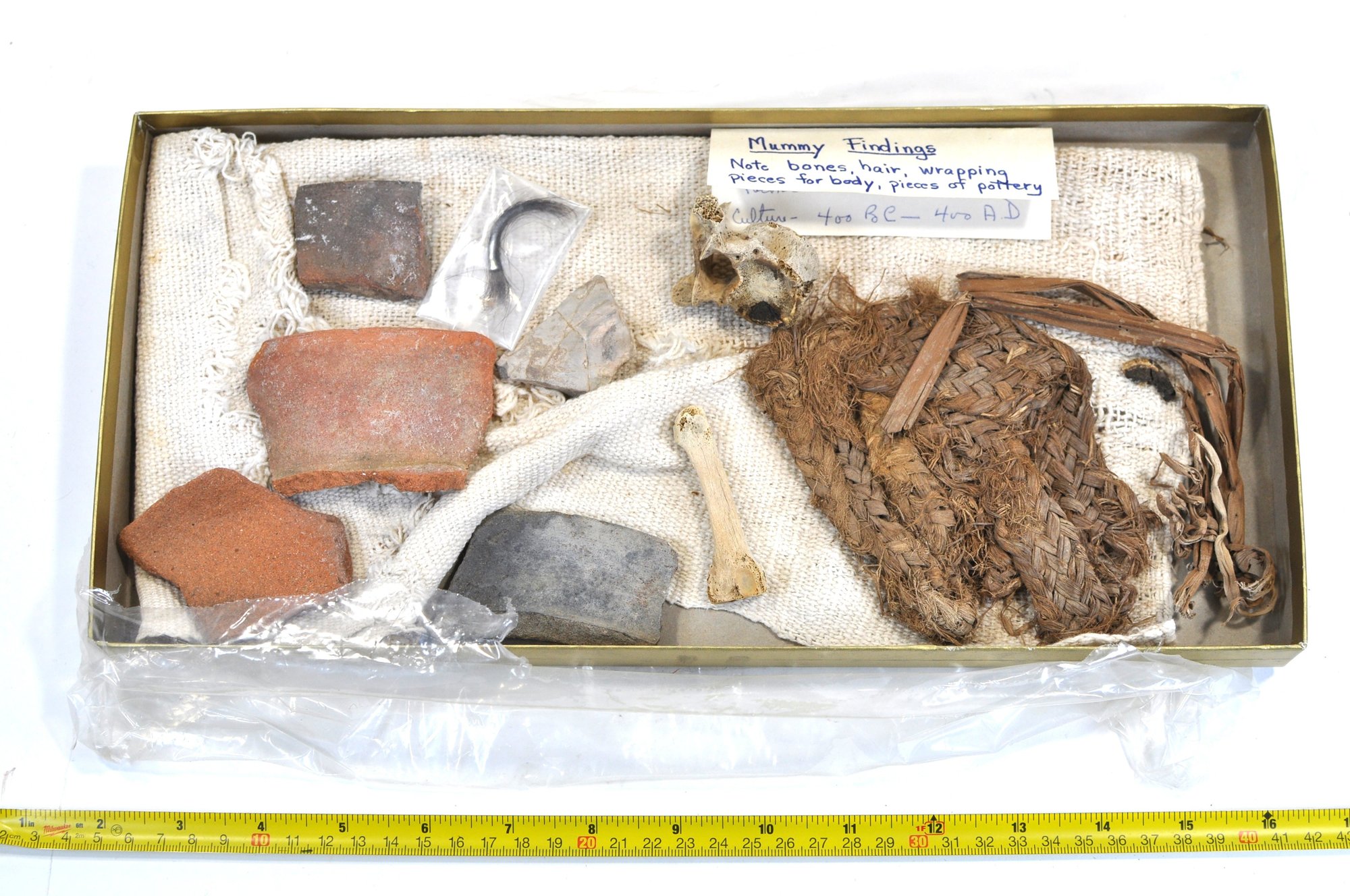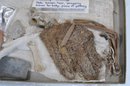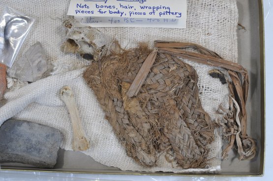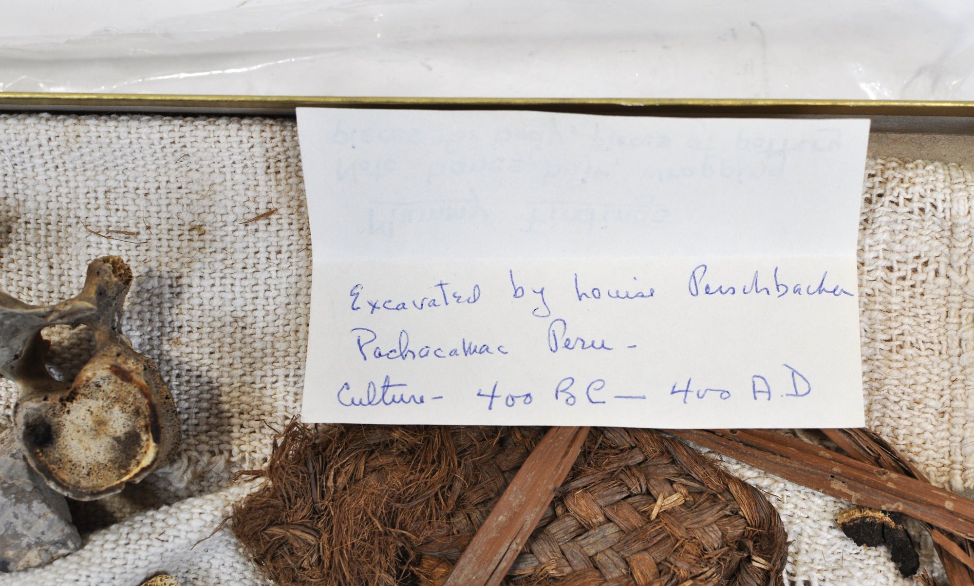 Small archaeological study group consisting of textile and fiber fragments, pottery shards, hair sample (bagged), and bone fragments, presented together with handwritten provenance notes referencing Pachacamac, Peru and a broad cultural date range (c. 400 BC–400 AD). Items are offered as found, for educational, research, or cabinet-of-curiosities display.