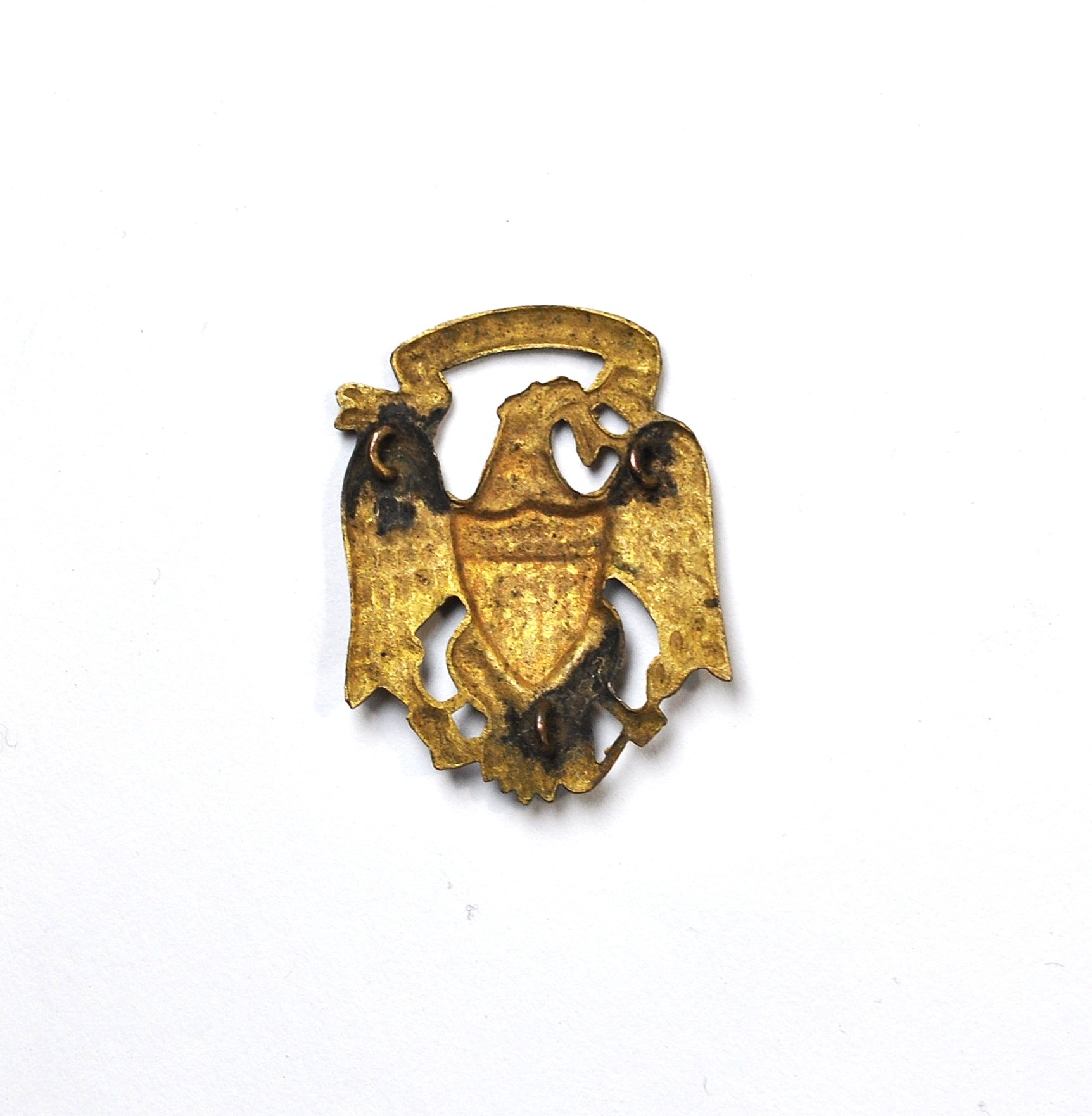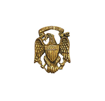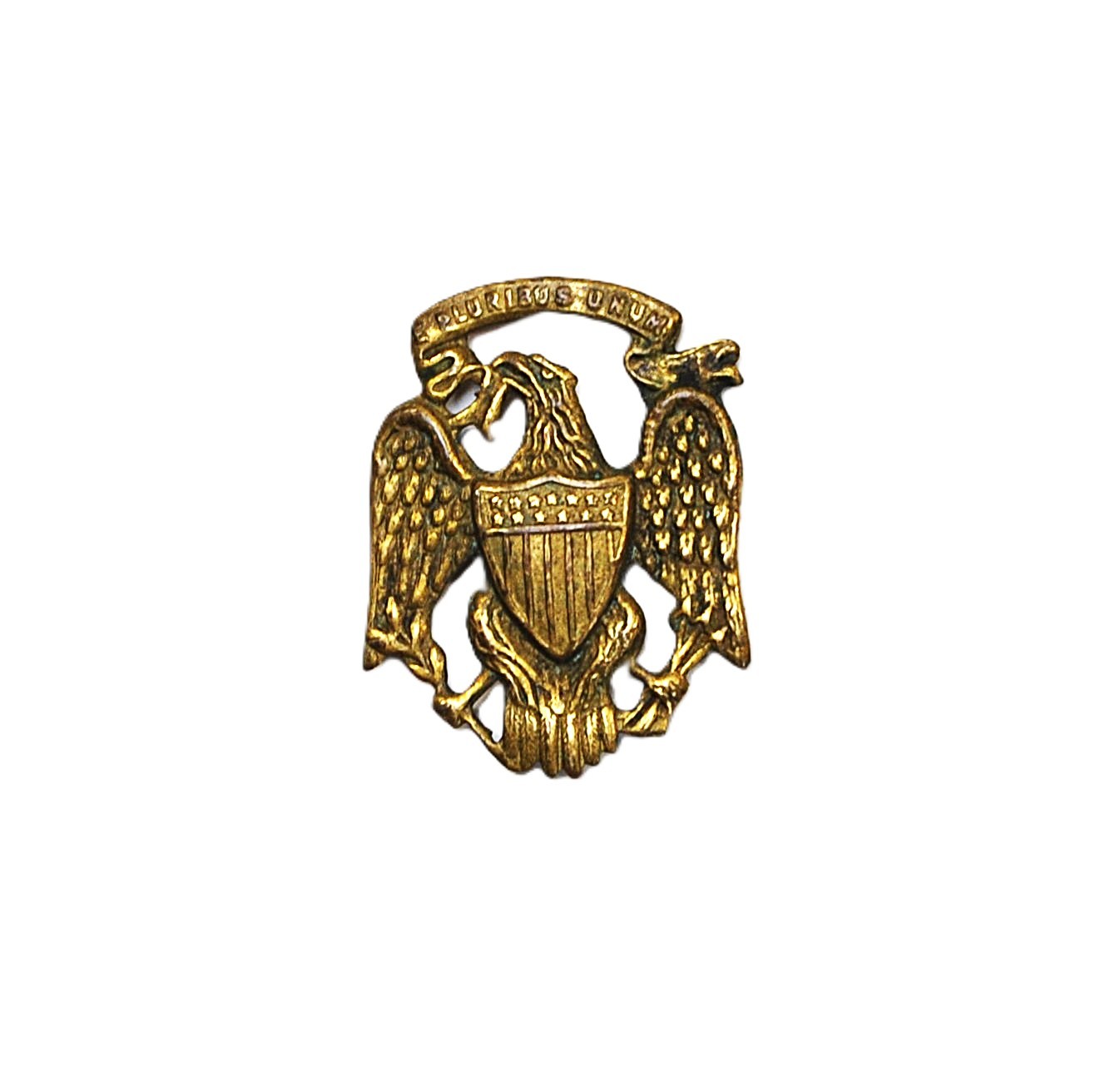Stamped brass gilded patriotic eagle with shield and “E Pluribus Unum” in a banner held in its beak.