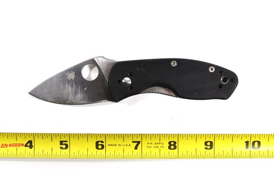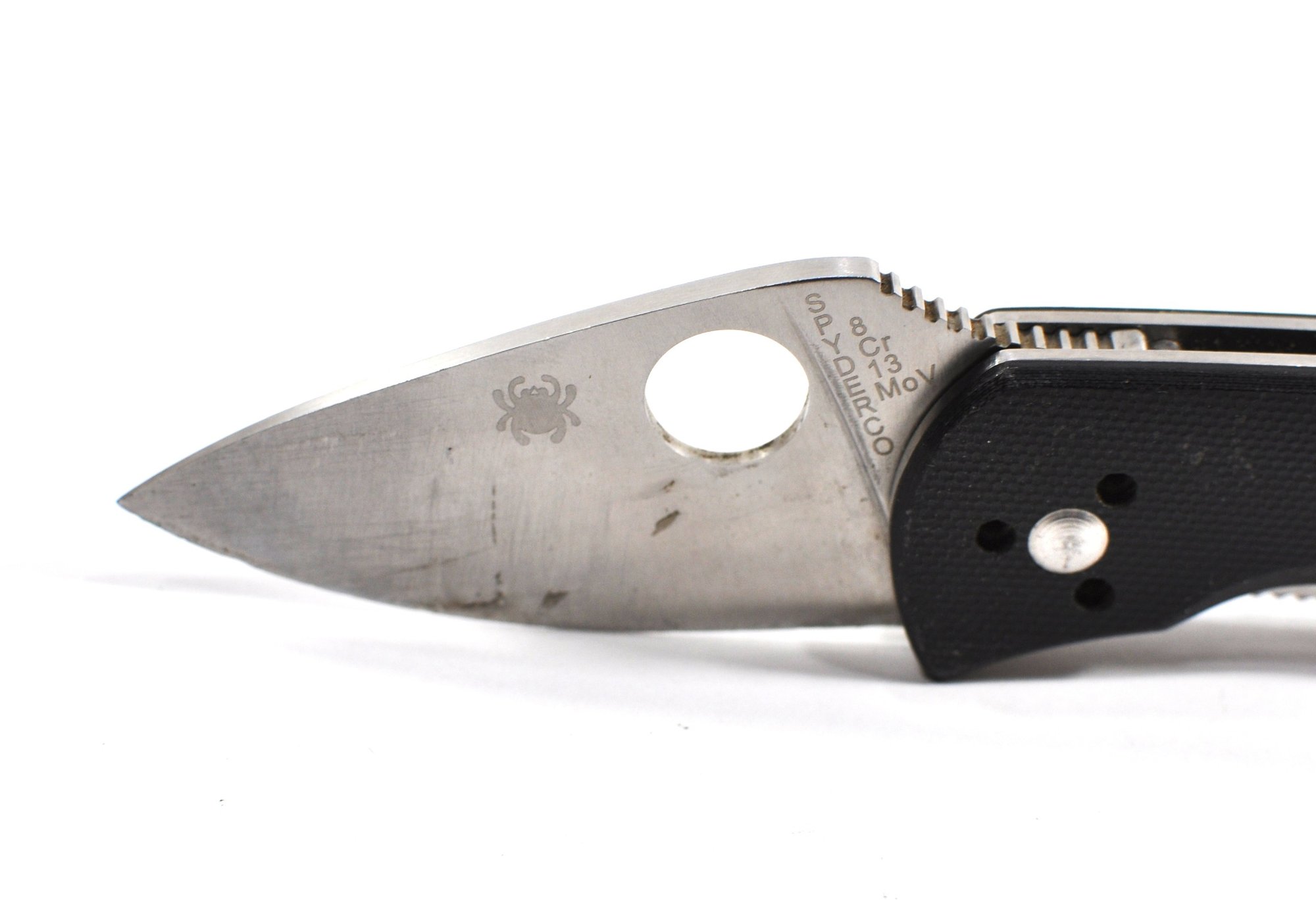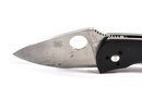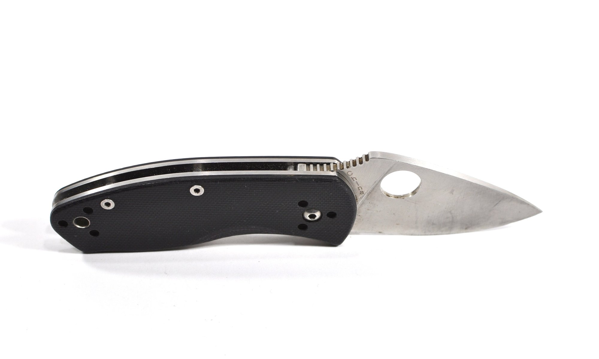 Spyderco folding pocket knife featuring a leaf-shaped stainless steel blade with signature round thumb hole, marked SPYDERCO / S / CPM S30V / USA. Black textured G-10 handle with stainless liners, thumb ramp and pocket clip (mounting holes present). Smooth manual opening.