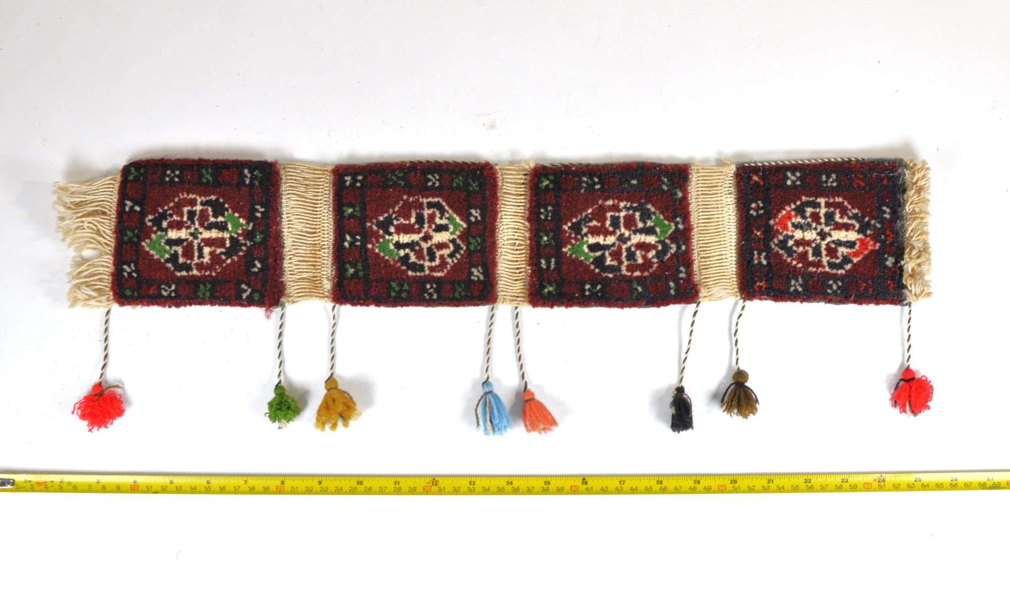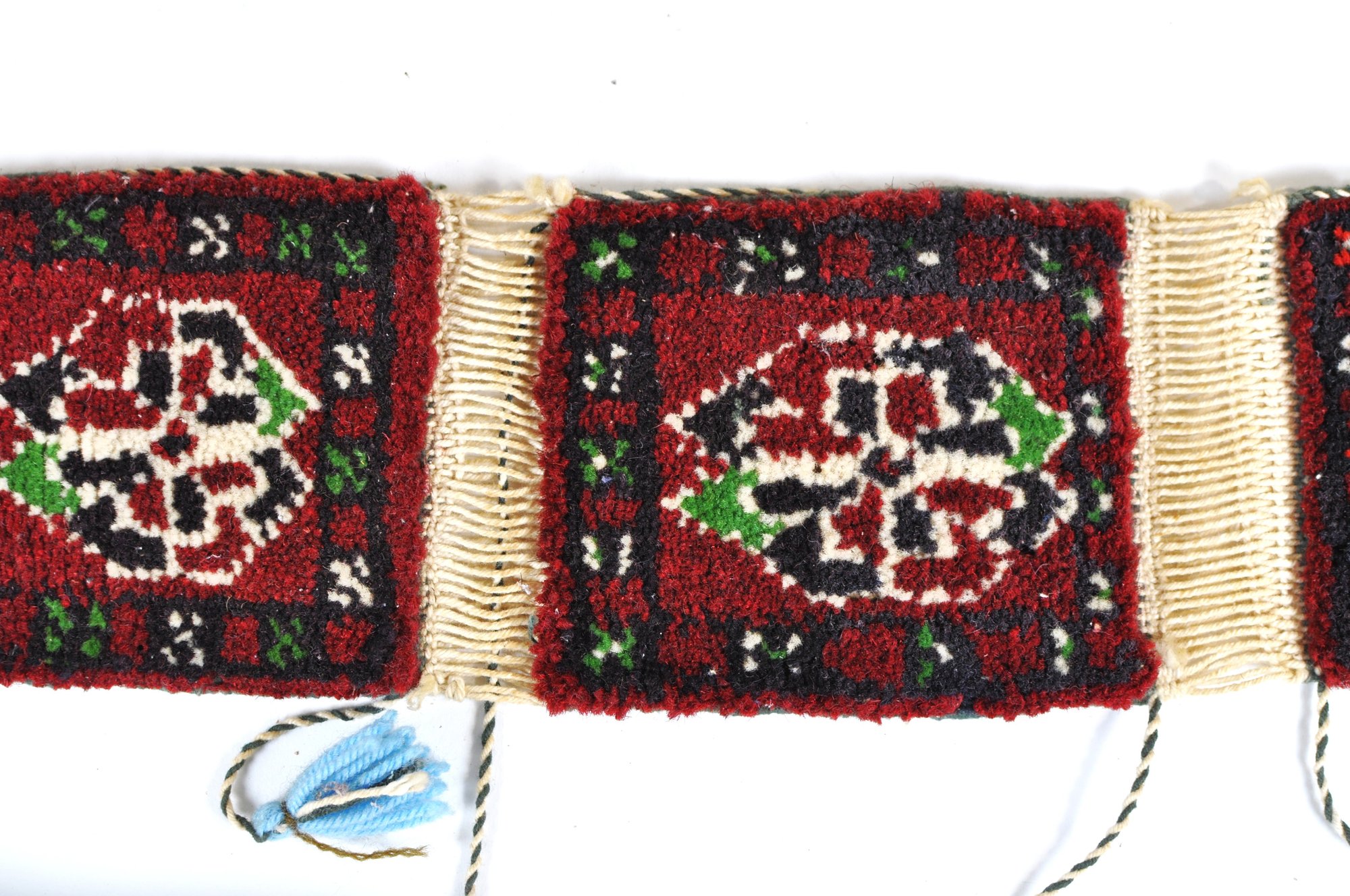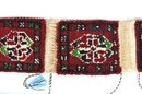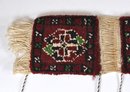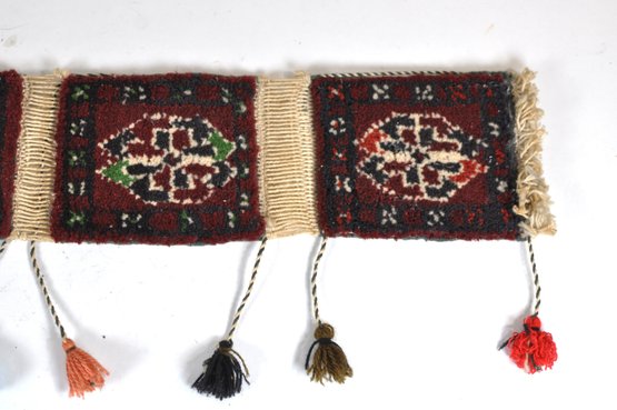 Hand-woven strip featuring four connected miniature wool rugs with geometric medallion designs in deep red, cream, and black tones. Each small rug is bordered by fringe and joined by woven panels, forming a decorative belt-like textile.