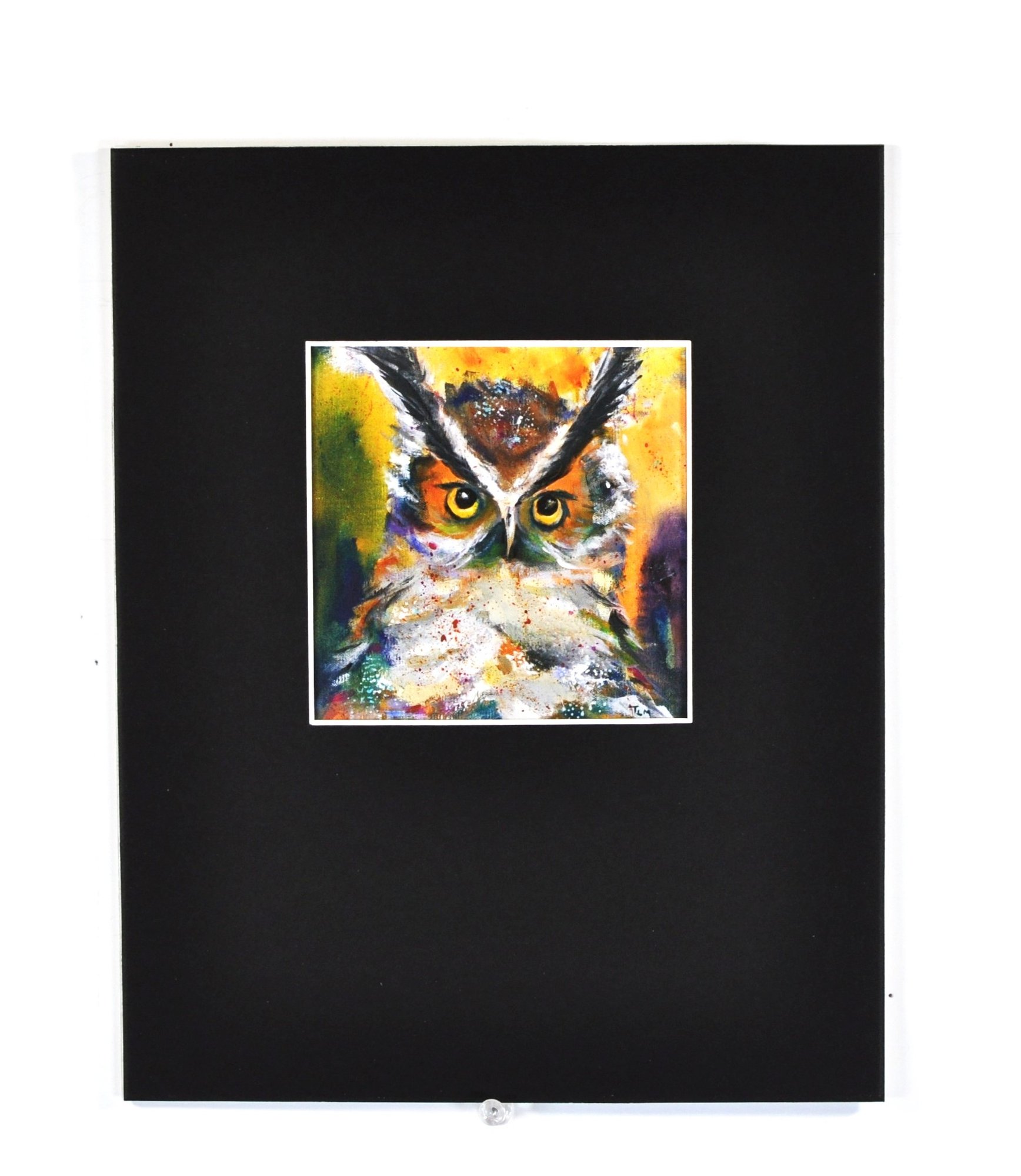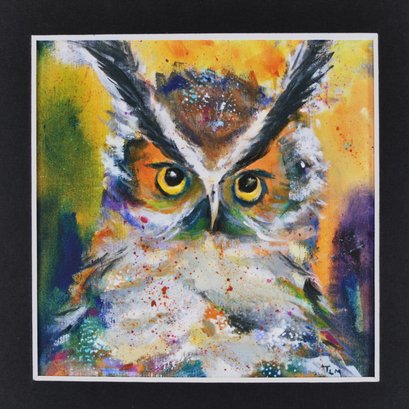Vibrant contemporary artwork print depicting an expressive owl with striking yellow eyes, rendered in bold, layered colors with energetic brushwork and splatter effects.