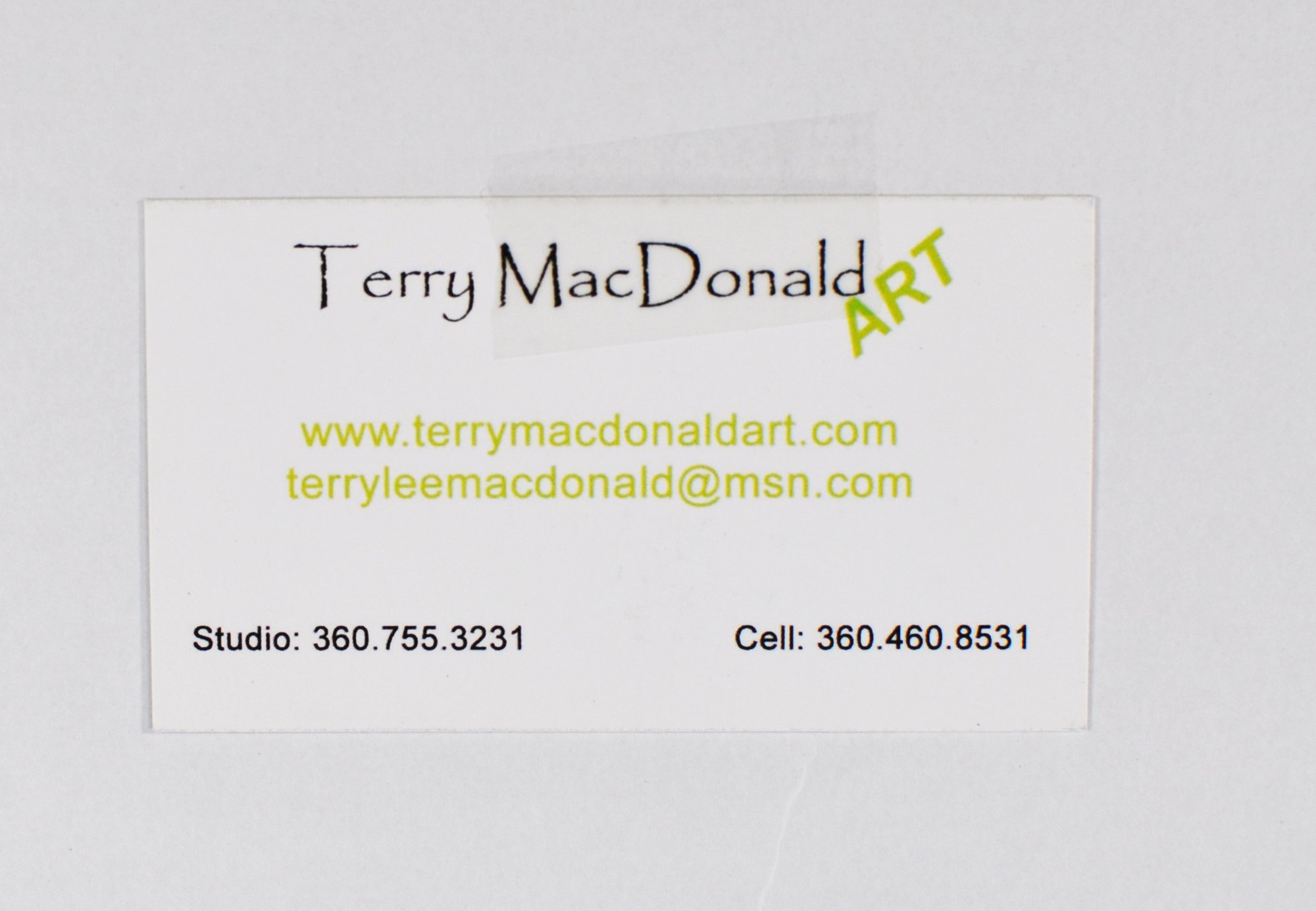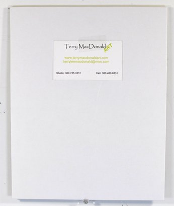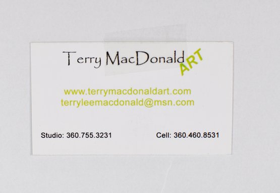 Verso retains original Terry MacDonald Art label with artist contact information.