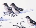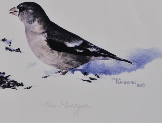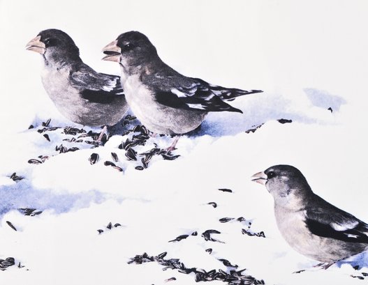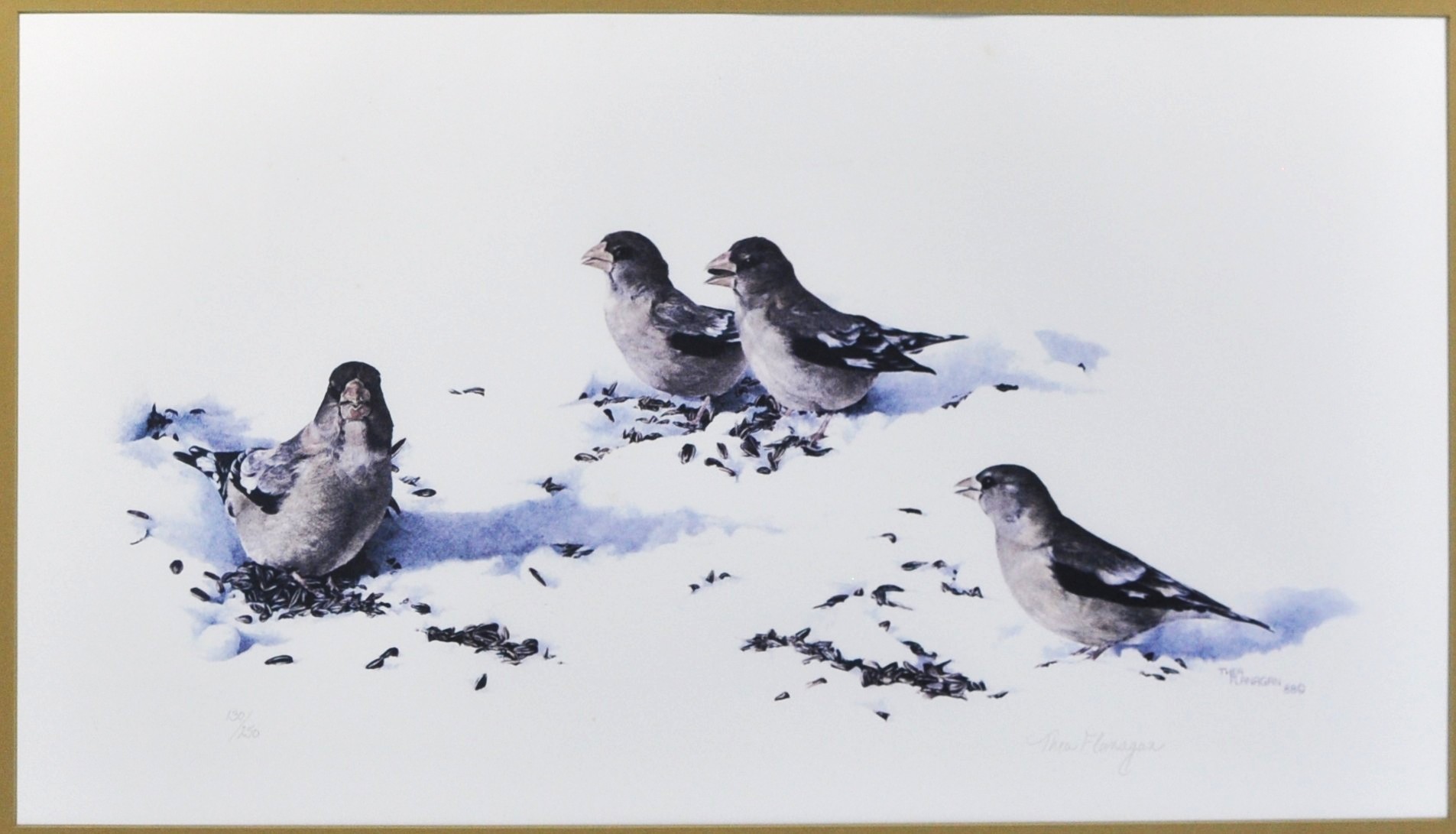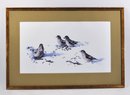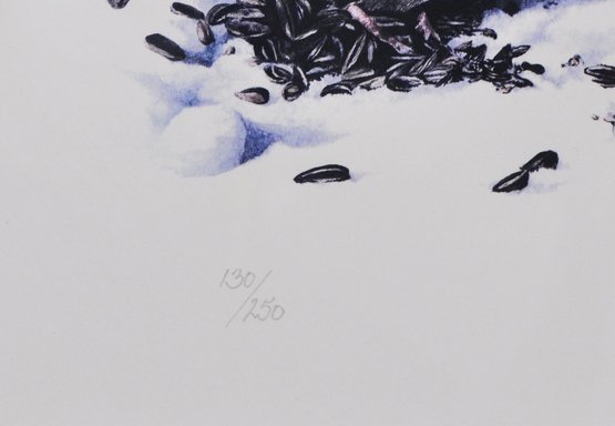Limited edition wildlife print depicting four birds feeding in snow. Signed in pencil by the artist and numbered 130/250, dated 1980. Presented under glass, matted and framed.