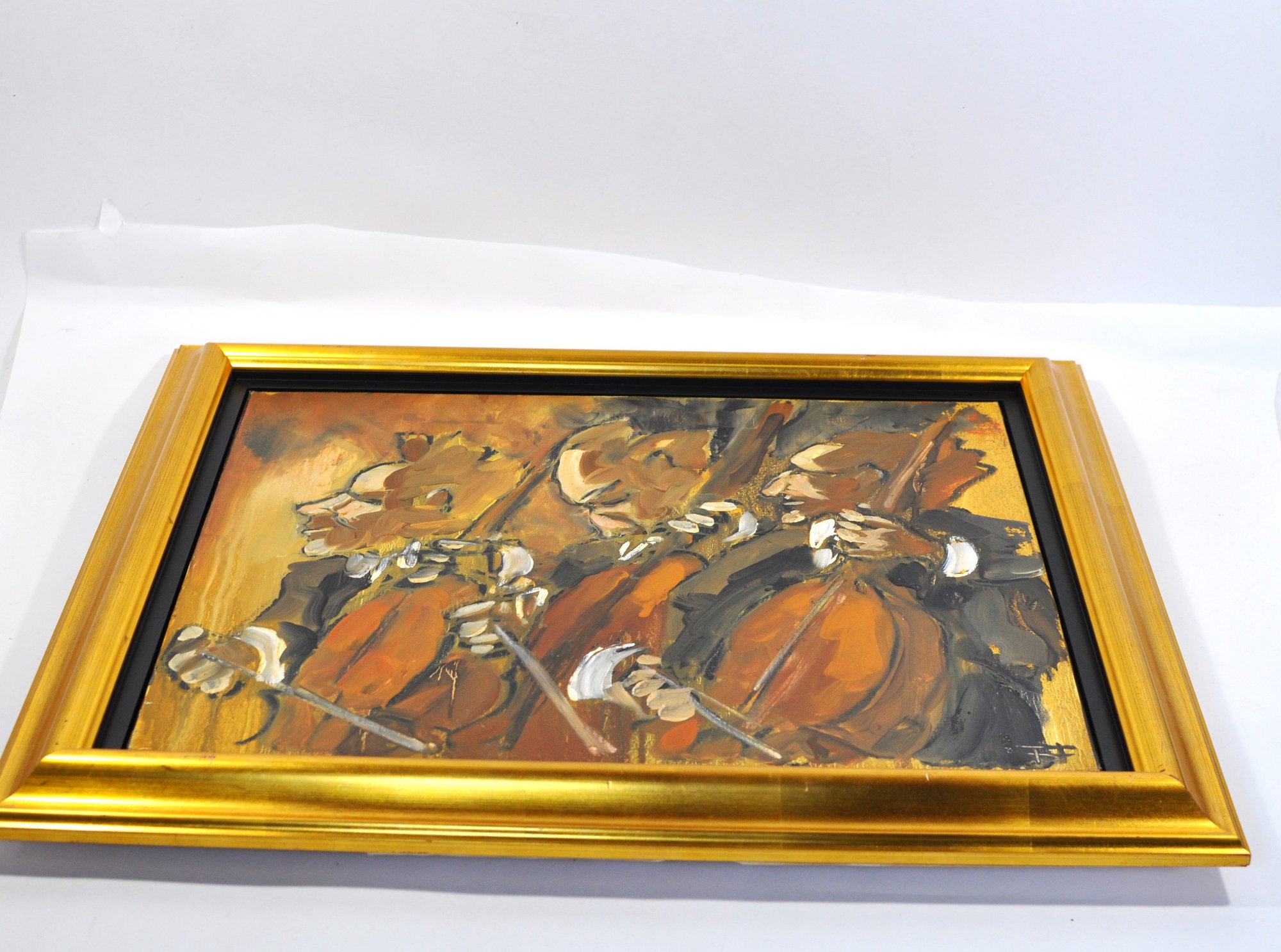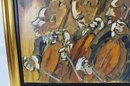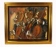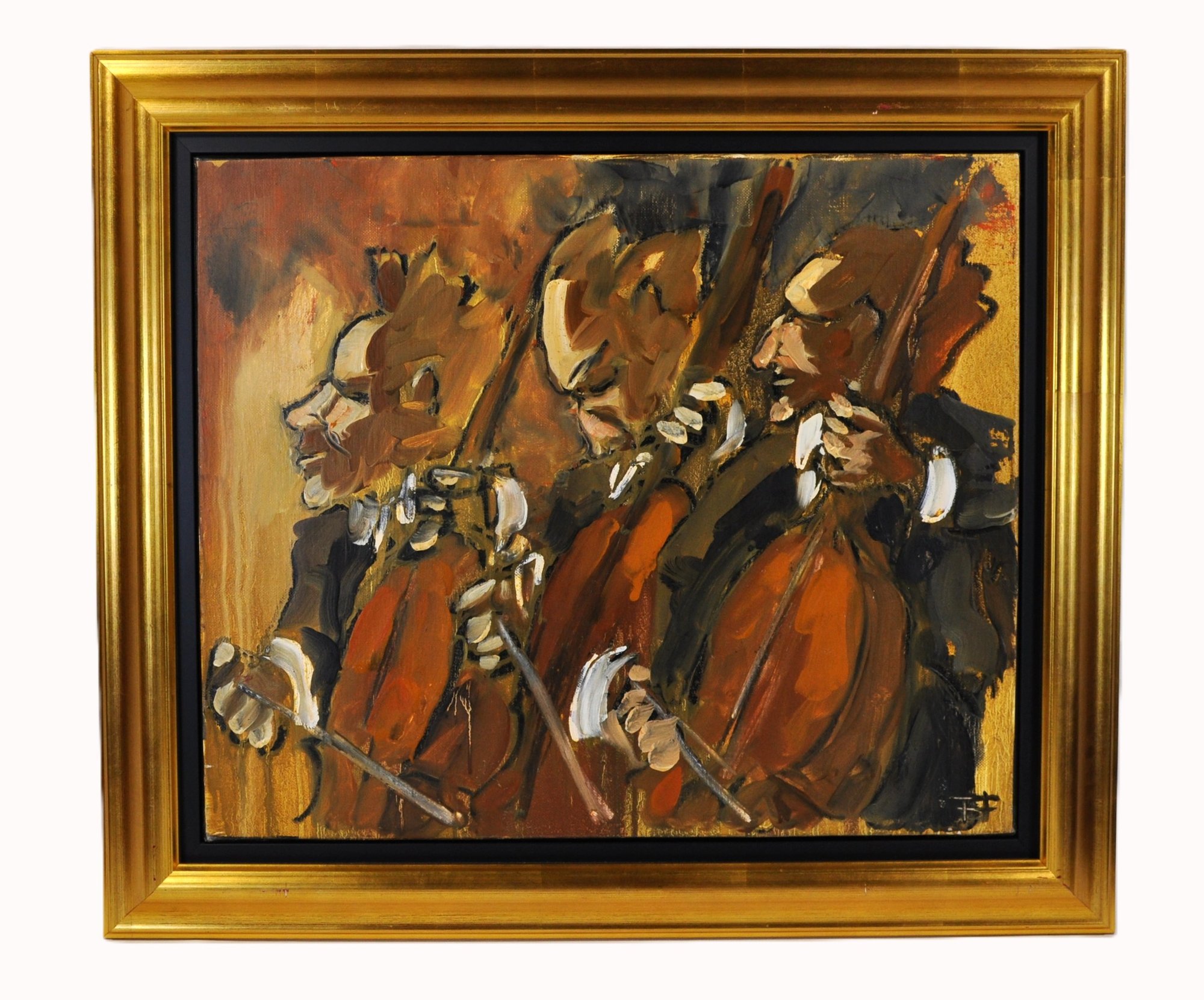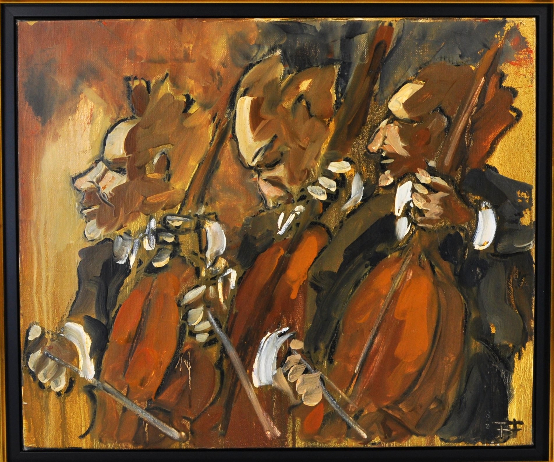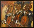 Dynamic and expressive original oil painting by Thierry Faure (born 1944, France), depicting three musicians passionately playing stringed instruments—likely cellists—executed in Faure’s signature bold, gestural brushwork. The composition showcases a powerful sense of rhythm and movement, with exaggerated forms, dramatic contrasts, and a warm, earthy palette dominated by ochres, umbers, and blacks.