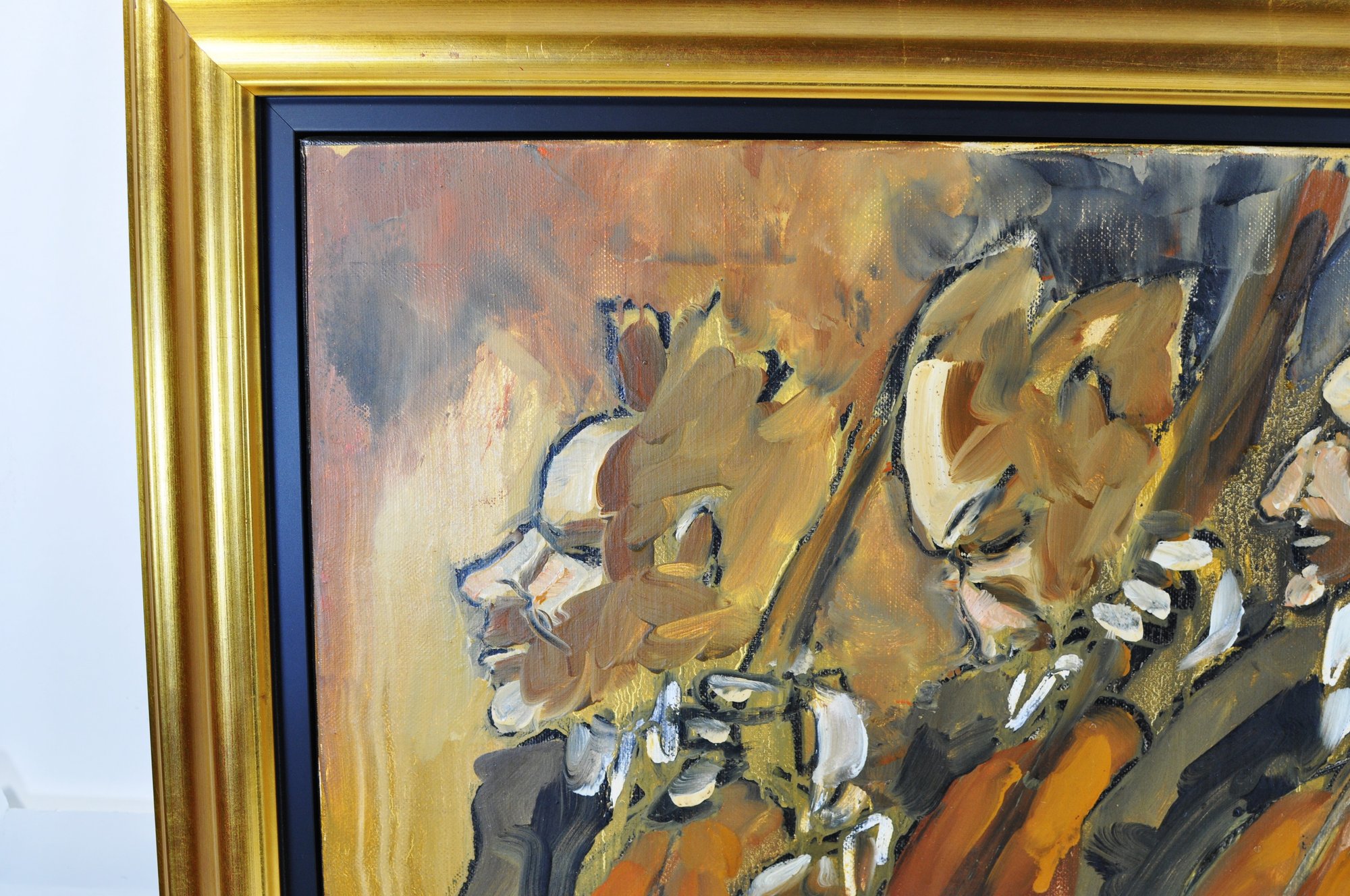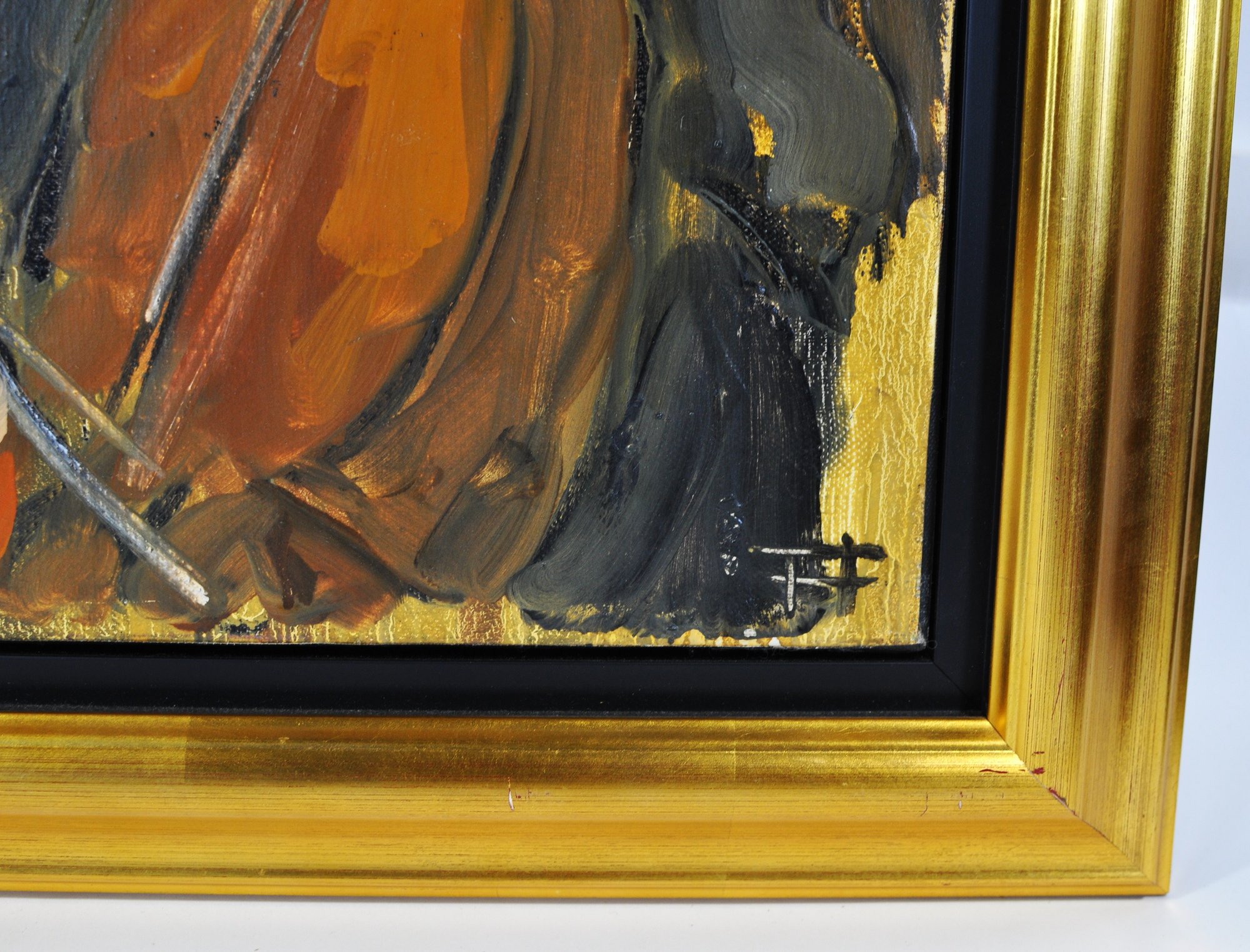 Presented in a substantial gilt frame with a black inner liner, which complements and elevates the dramatic composition. Ready to hang.