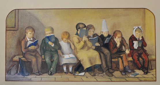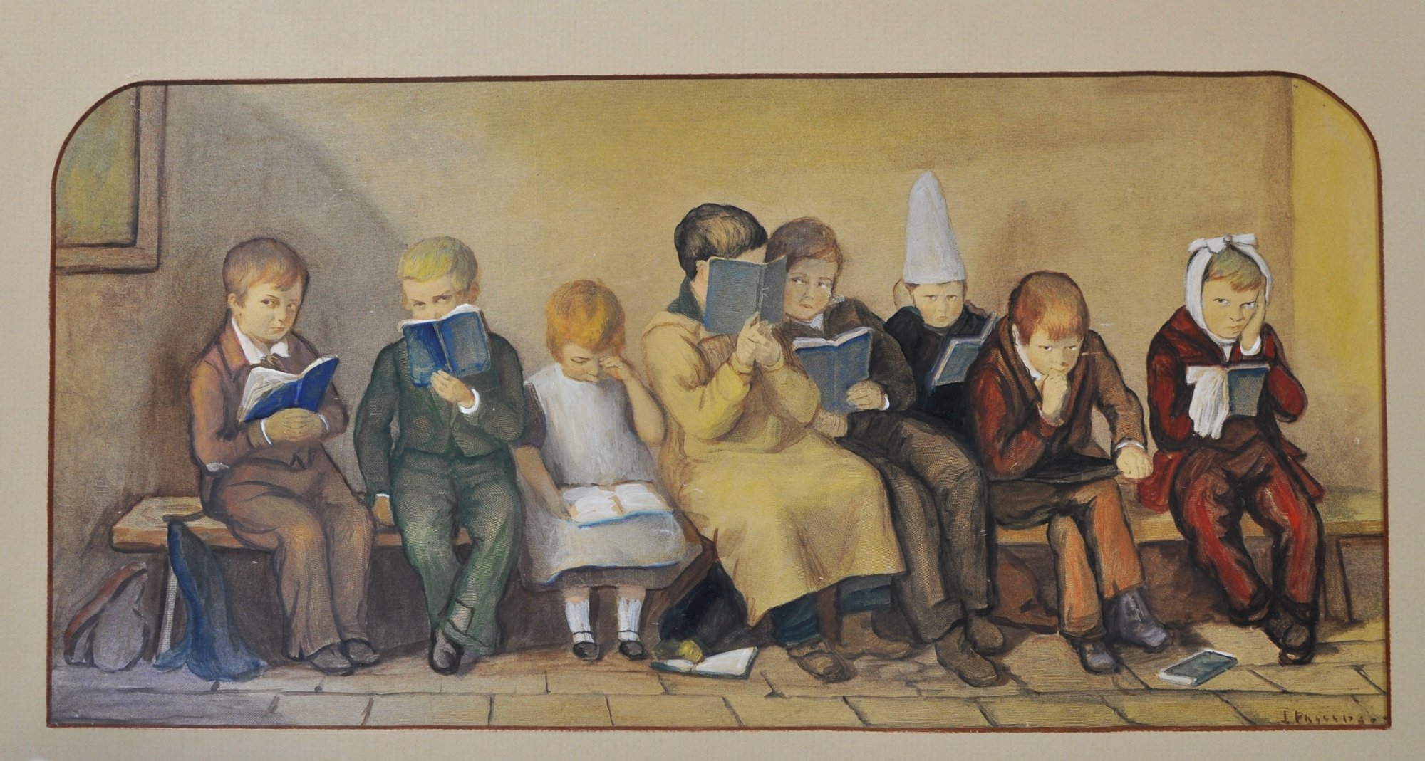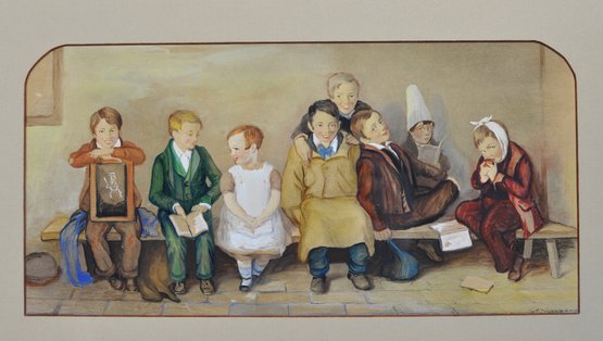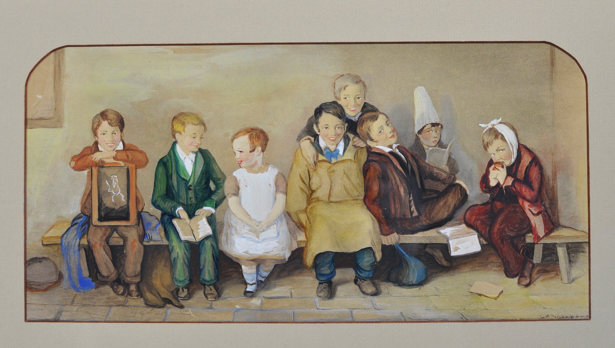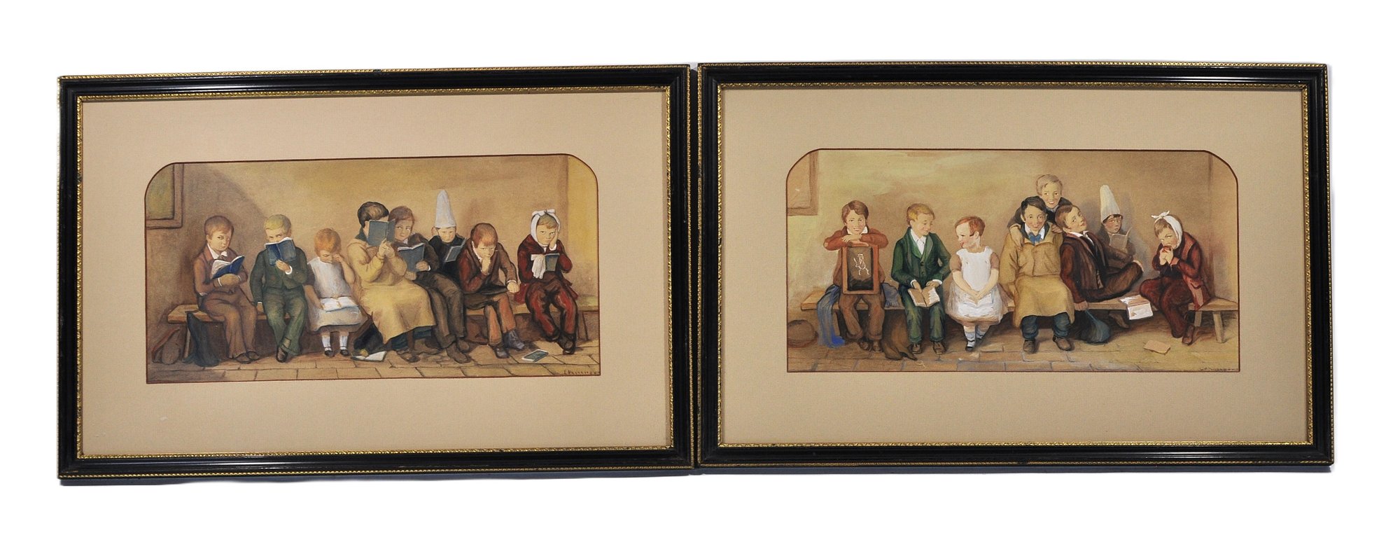 Charming matched pair of antique color prints after Thomas Webster, titled The Frown and The Smile. These well-known Victorian genre scenes depict schoolchildren seated on a bench, contrasting moods and expressions with gentle humor and narrative detail typical of Webster’s work.