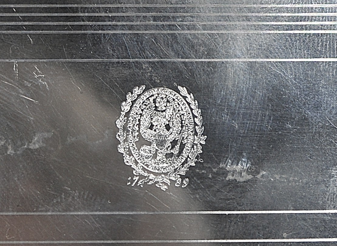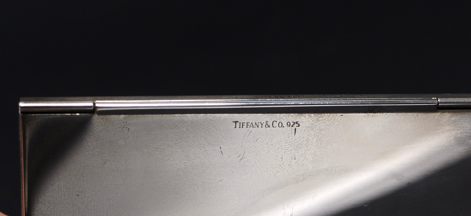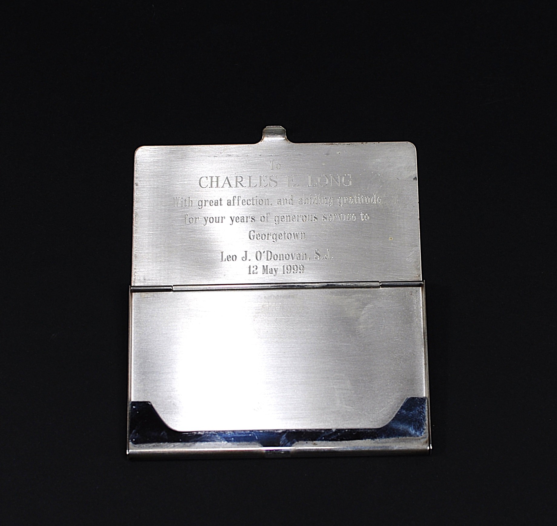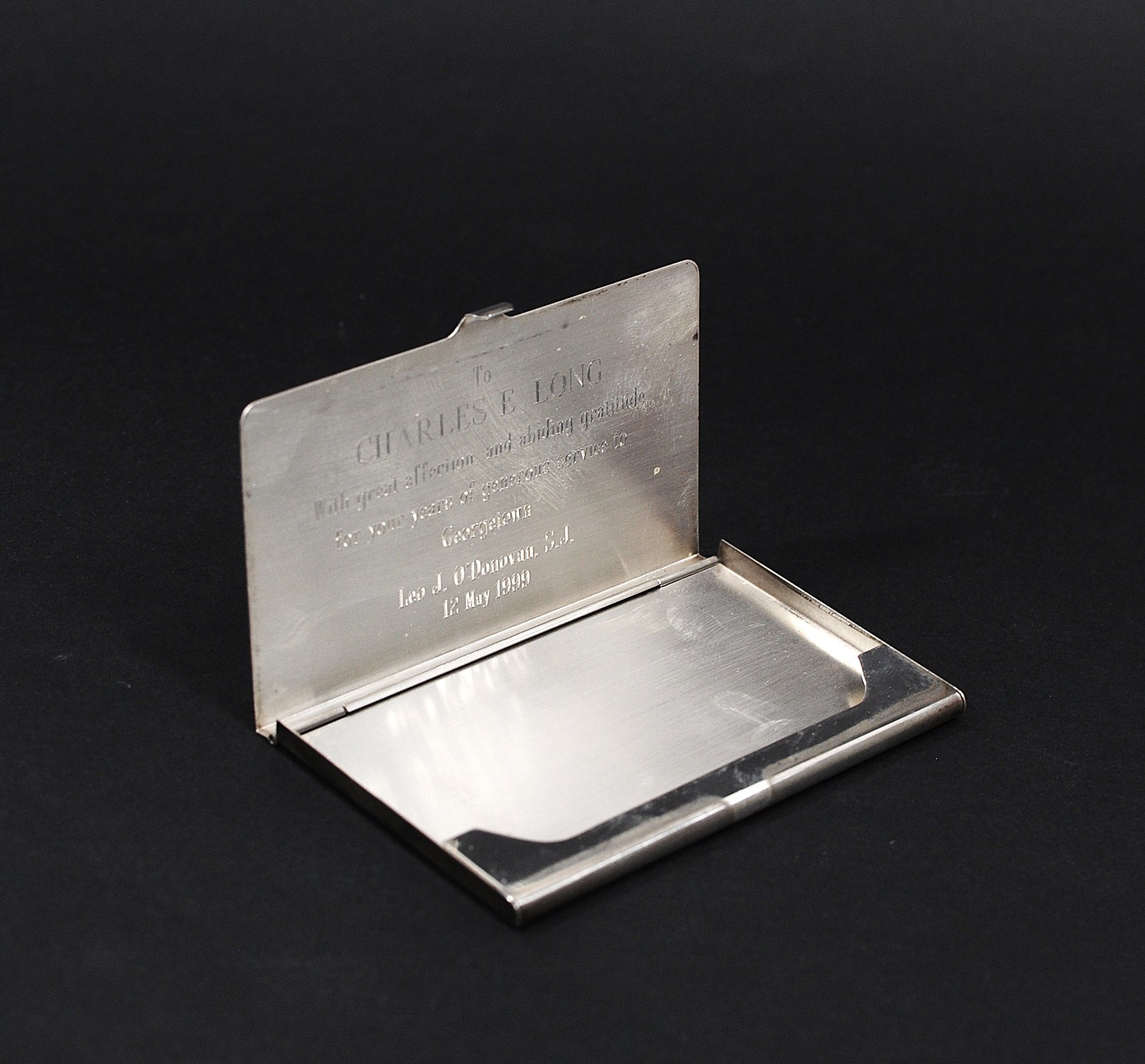 Original Tiffany & Co. sterling silver business card case with refined engine-turned decoration and central US crest motif. Interior marked “Tiffany & Co. 925.” Hinged form with thumb-tab opening and fitted compartment for cards. Engraved inside. This inscription ties the piece directly to Georgetown University and its 47th President, Leo J. O’Donovan, S.J. (served 1989–2001), adding strong historical and institutional significance.