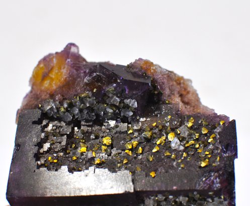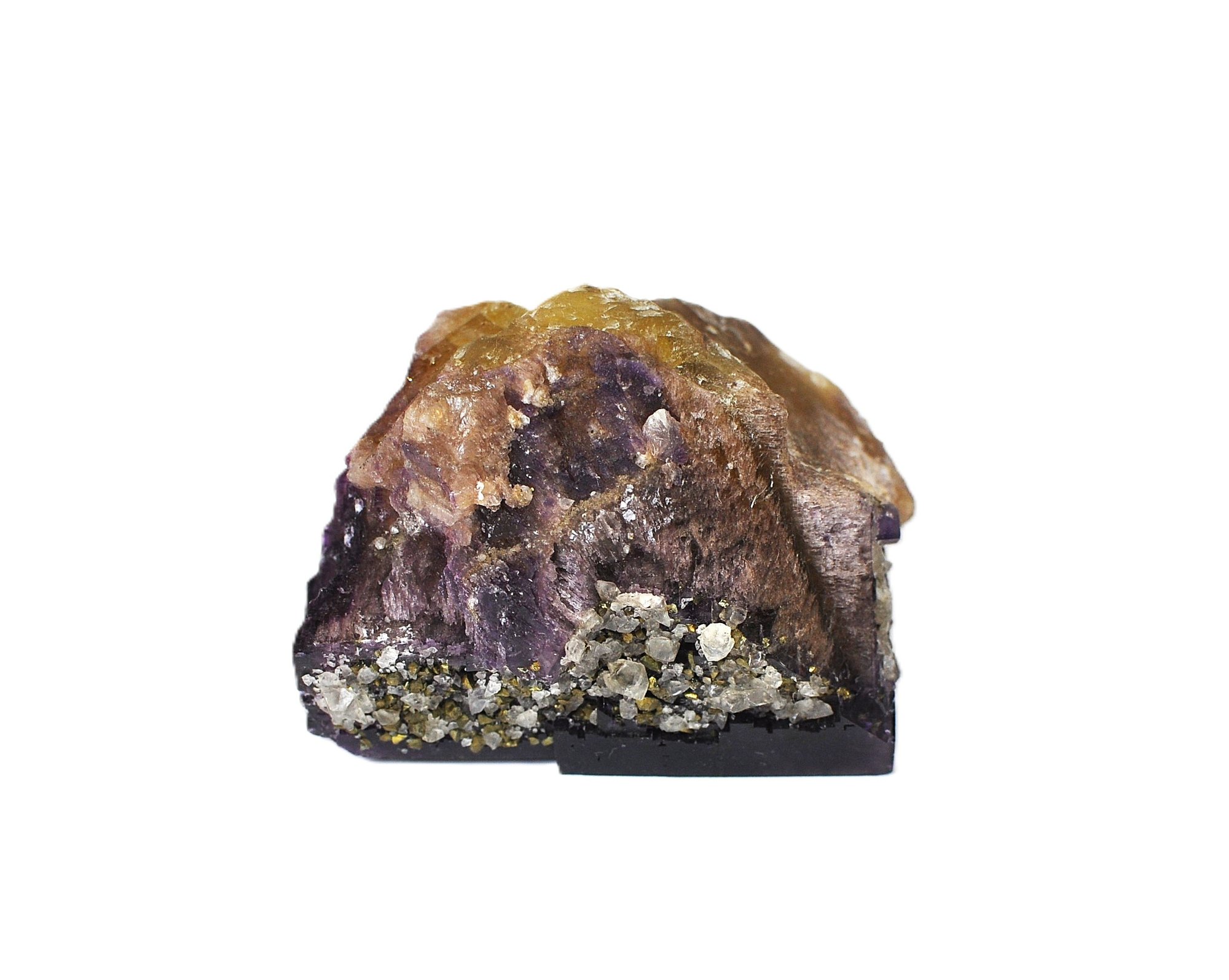 Natural mineral specimen featuring deep purple cubic fluorite crystals on matrix, associated with honey-amber calcite and scattered brassy pyrite crystals. The fluorite displays classic cubic crystal habit with strong color saturation, while the calcite adds warm contrast and the pyrite provides metallic sparkle. Presented on a cut base for display.