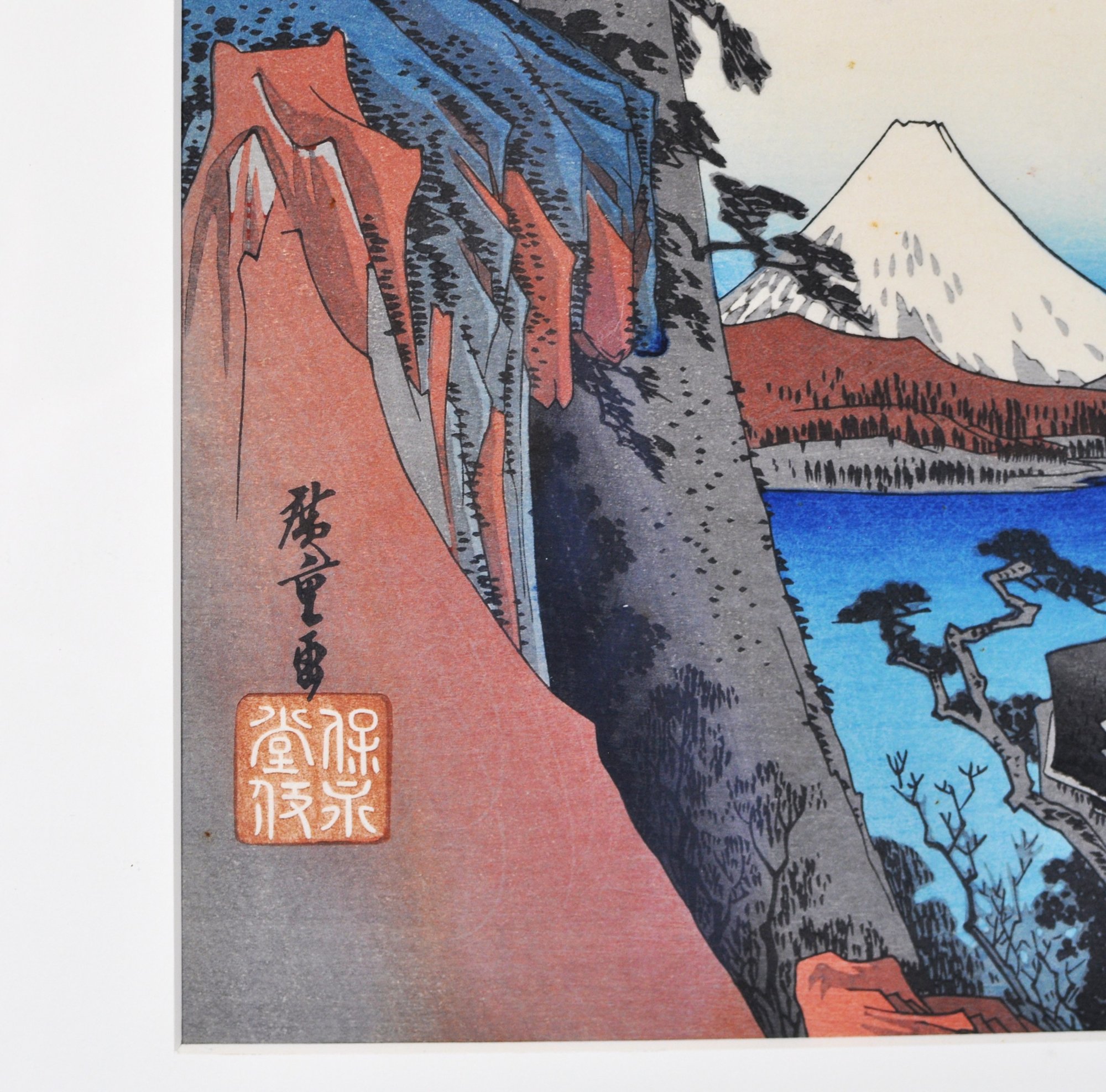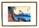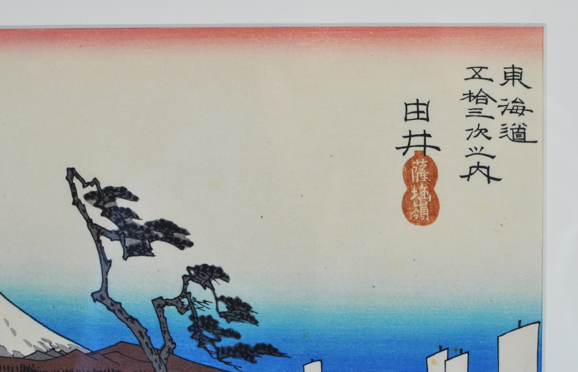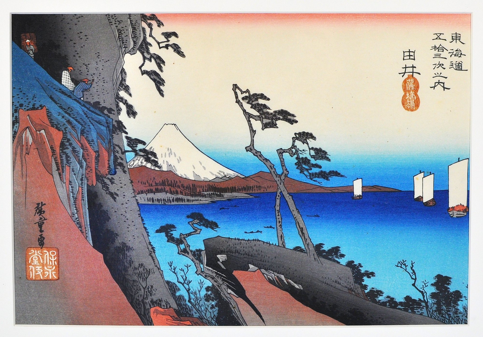 Colorful Japanese woodblock print after Utagawa Hiroshige, depicting “Yui” (Tōkaidō Station) with Mount Fuji and coastal boats—one of the famous scenes from the Fifty-Three Stations of the Tōkaidō. Nicely printed with vibrant colors and traditional seals and script in the margin.
