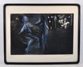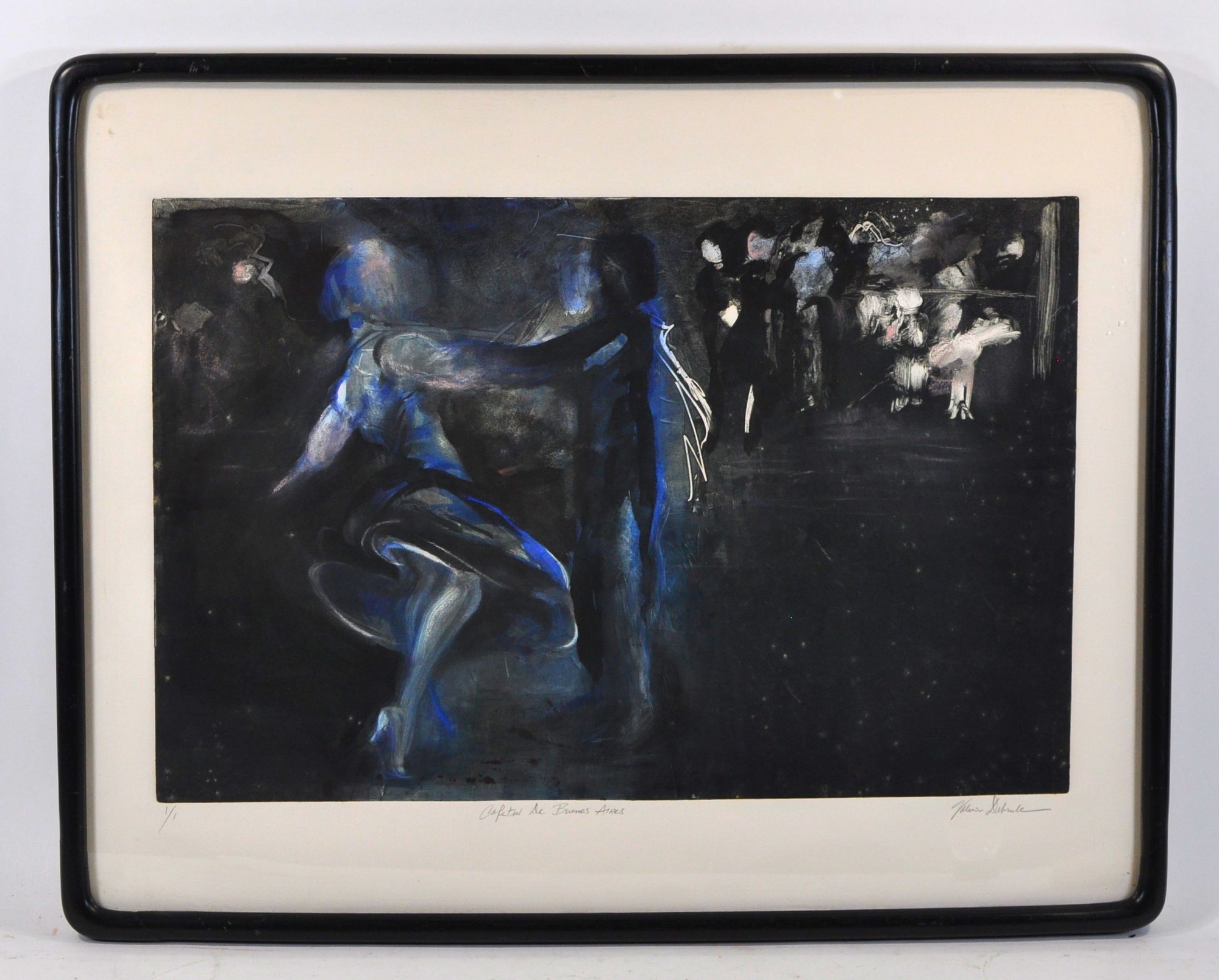 Expressive monotype with ink by Valerie Debrule, titled “Cafetín de Buenos Aires” from her Tango Series. The piece captures the fluid motion and emotional energy of an Argentine tango in deep tones of blue and black. Hand-signed lower right, titled at center, and numbered 1/1, indicating a unique impression.