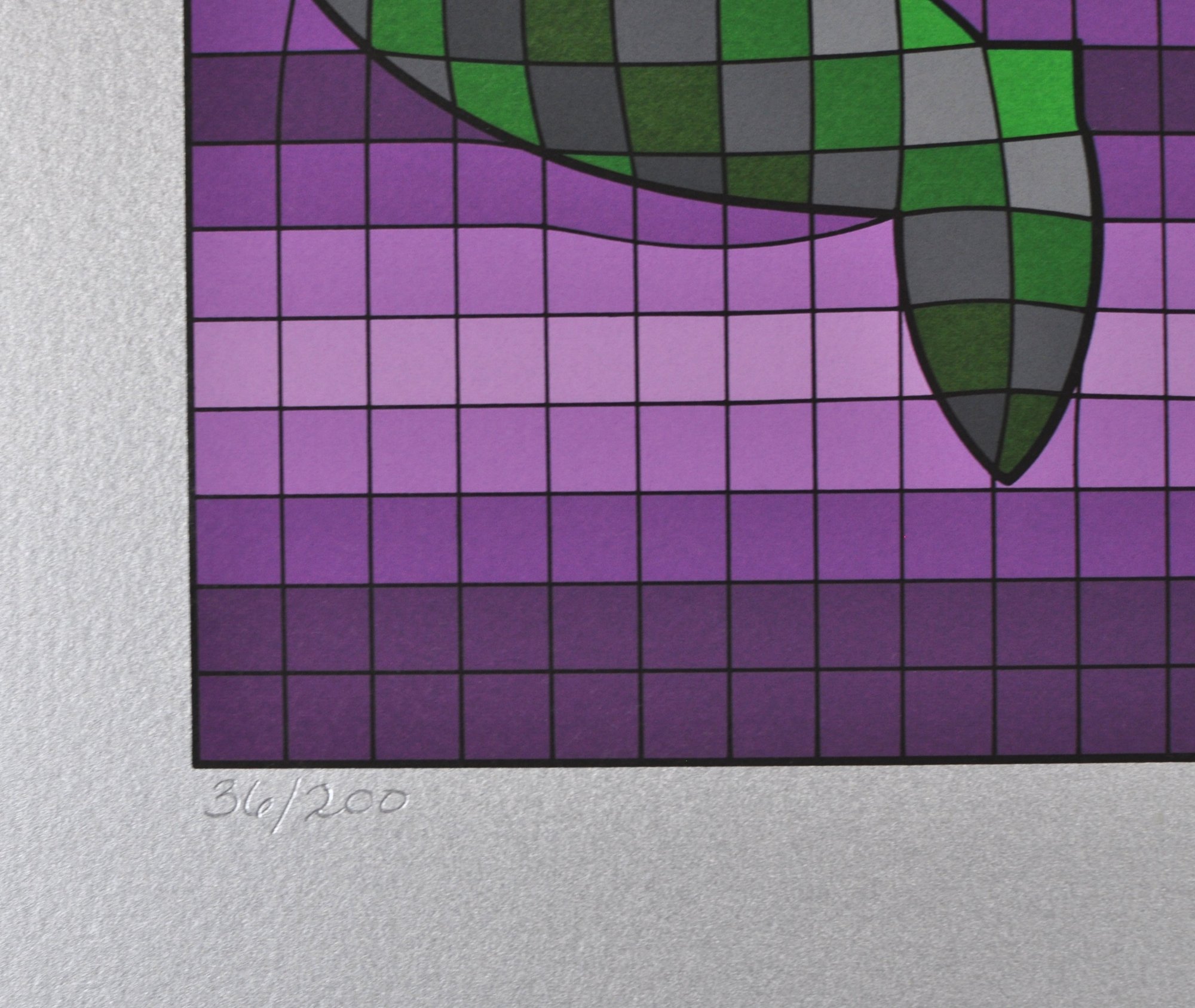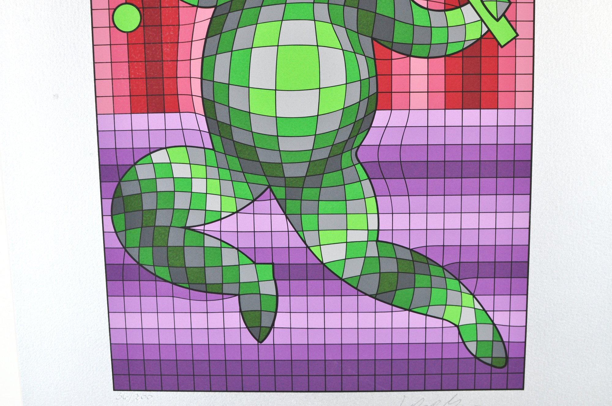 Printed on textured art paper, the piece is pencil-signed by Vasarely at lower right and numbered 36/200 at lower left, confirming it as part of a limited edition of 200 impressions.