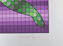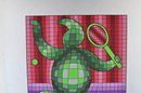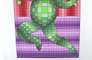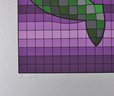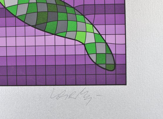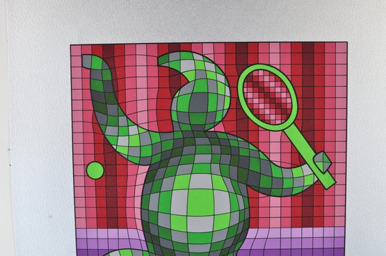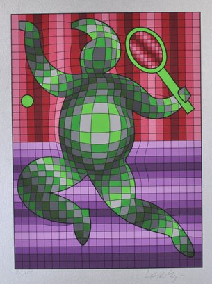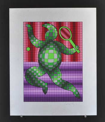 Vibrant geometric serigraph titled “The Tennis Player” by renowned Hungarian-French Op Art pioneer Victor Vasarely (1906–1997). Known as the father of the Op Art movement, Vasarely explored perception, movement, and dimensionality through precise color patterns and optical forms. This work features a stylized golfer composed of interlocking squares in bold, shifting tones, creating a dynamic sense of motion and spatial distortion.