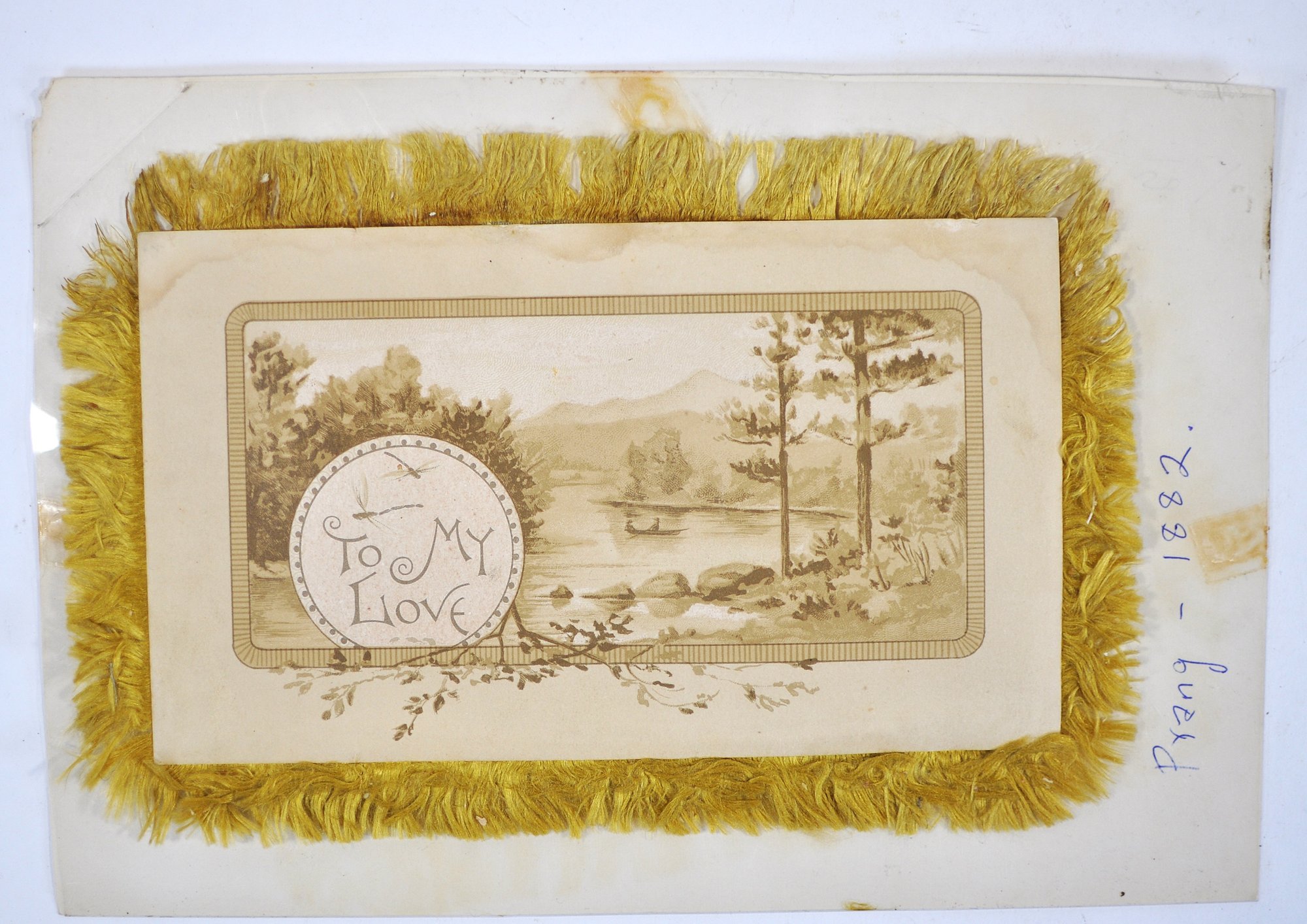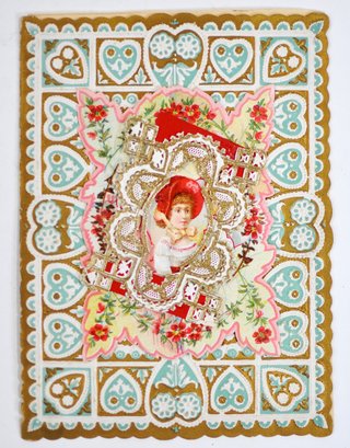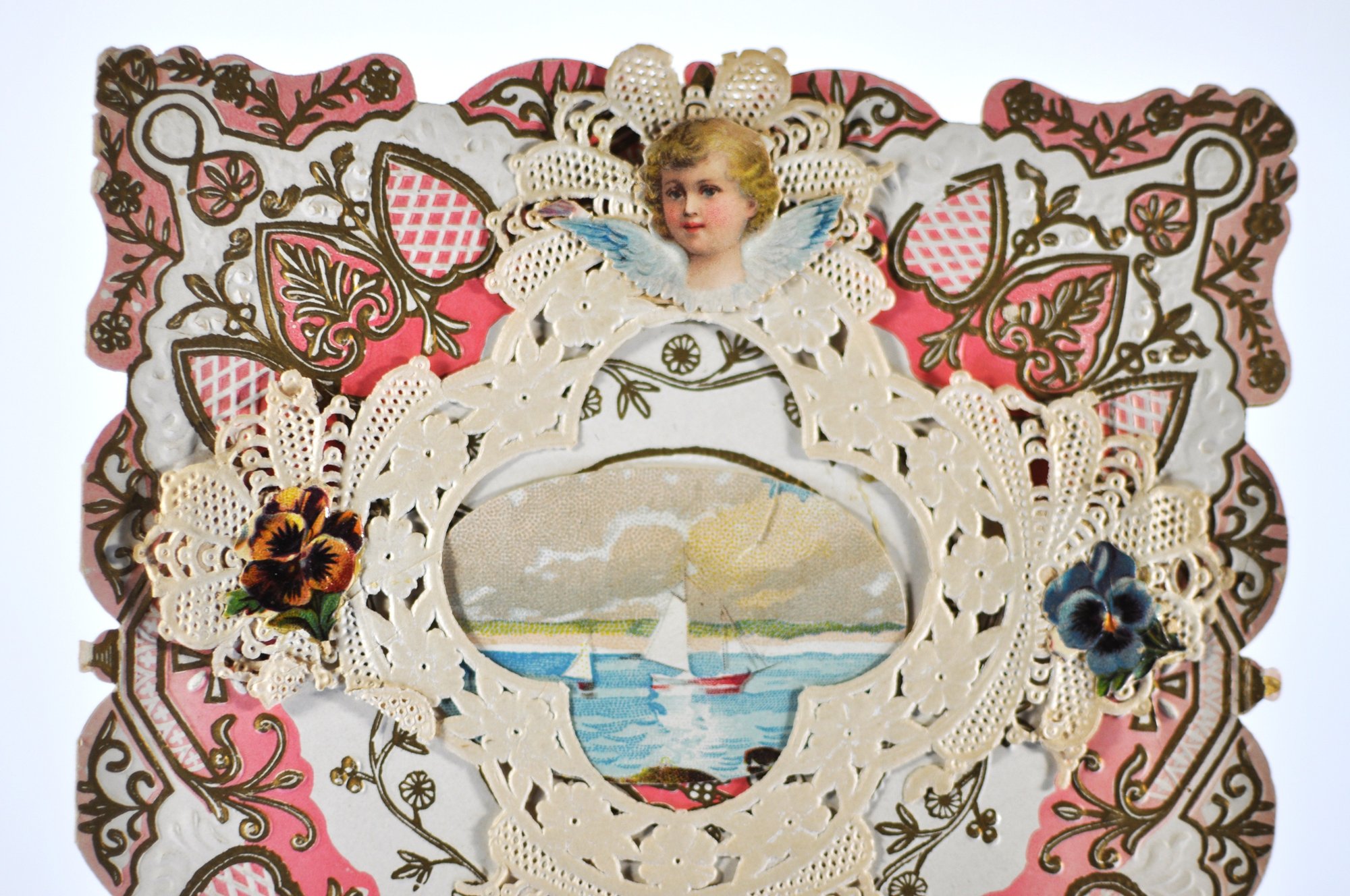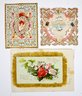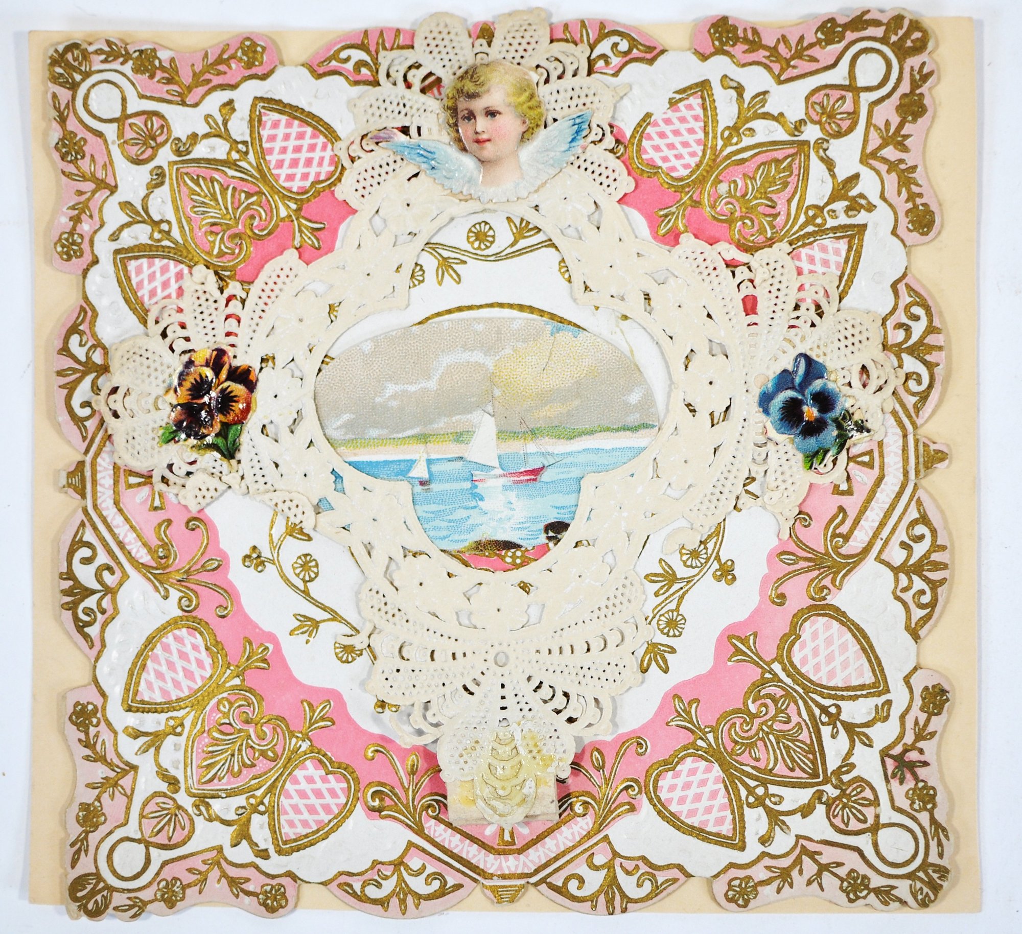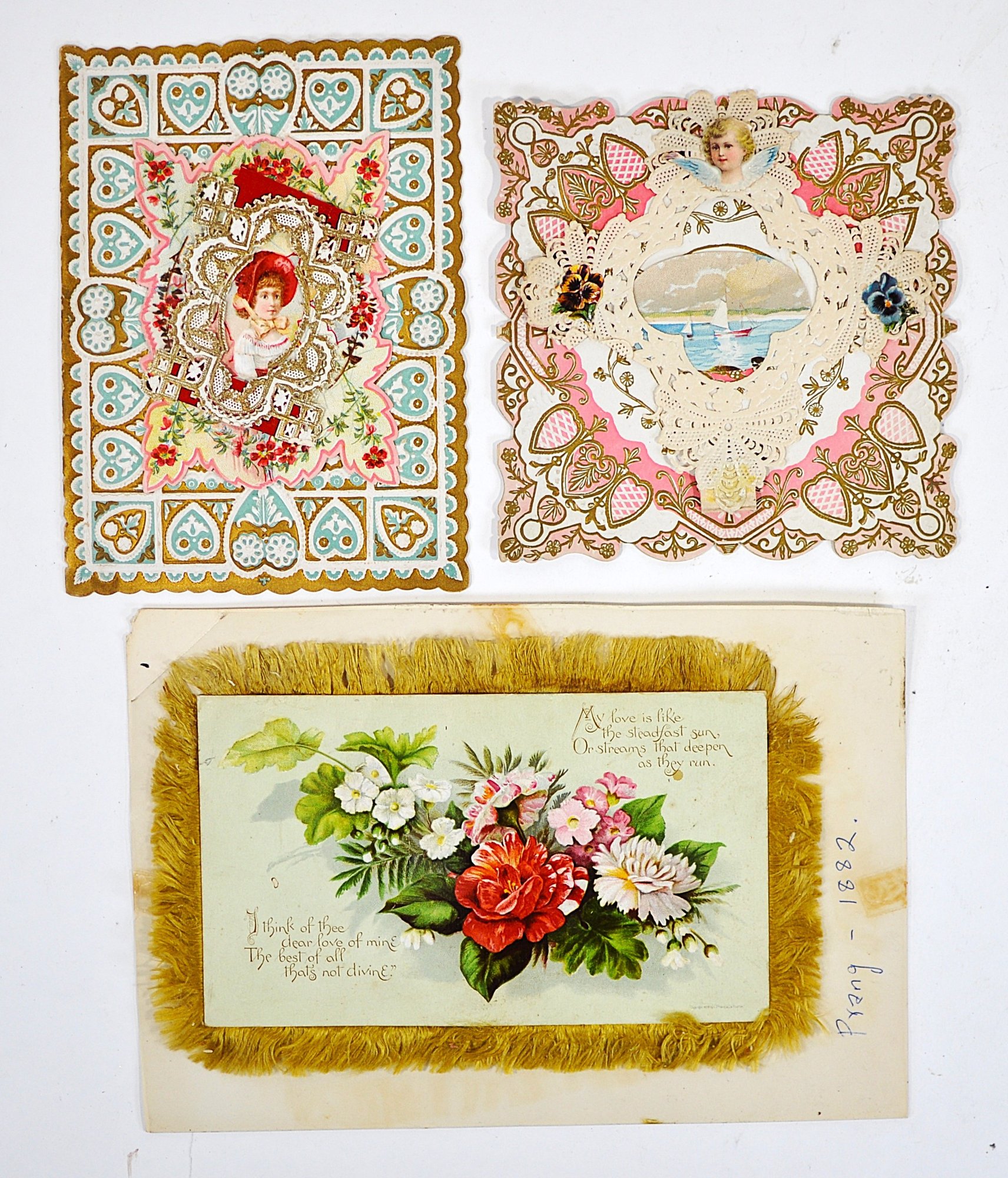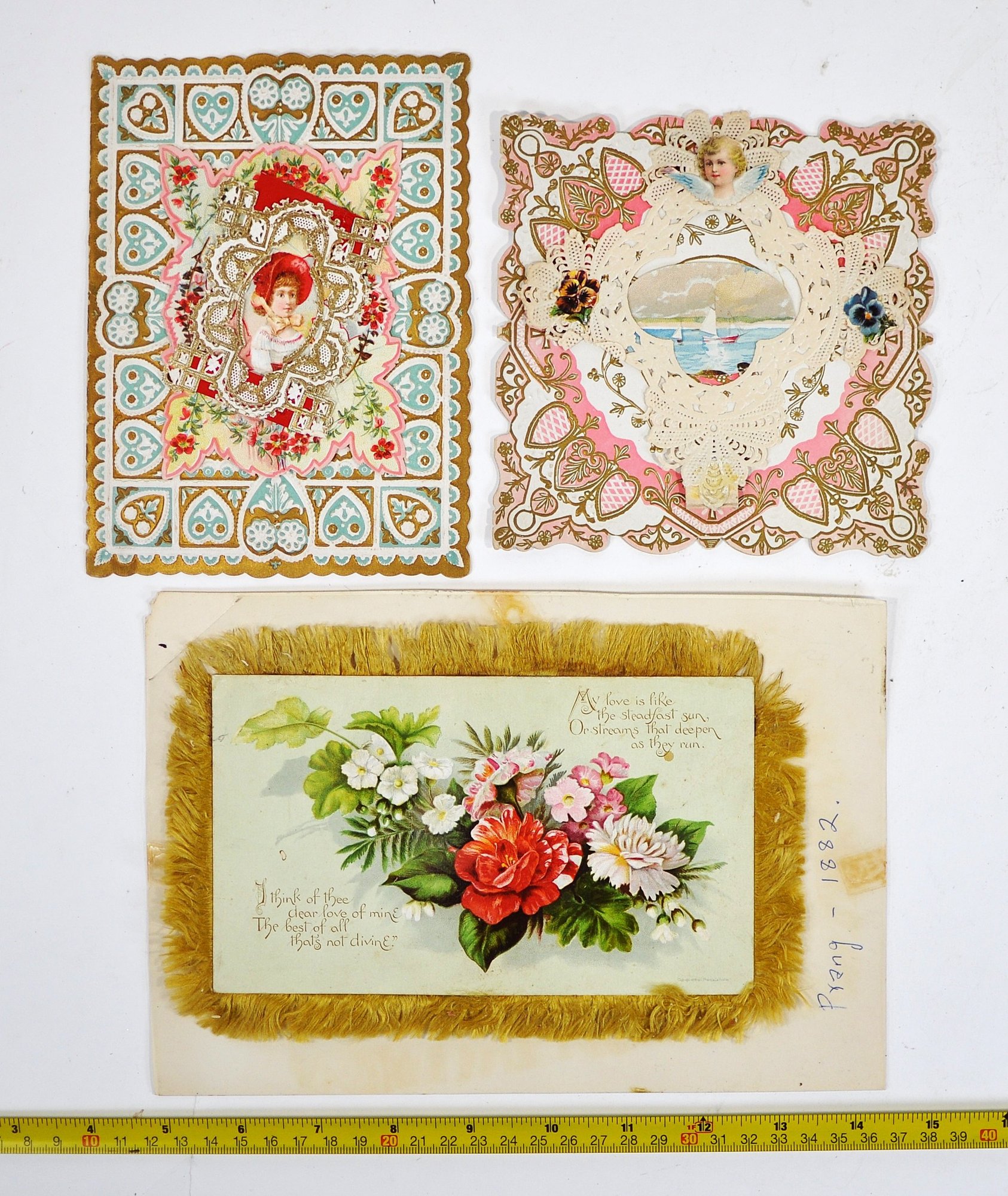 Offered is a decorative group of Victorian-era Valentine cards, dating to the late 19th century. The lot includes finely die-cut and embossed examples with chromolithographed imagery, lace-style paperwork, gilt highlights, and romantic motifs such as cherubs, hearts, florals, and pastoral scenes. One card features an applied lace surround with dimensional elements; another includes a fringed textile border with a floral centerpiece.