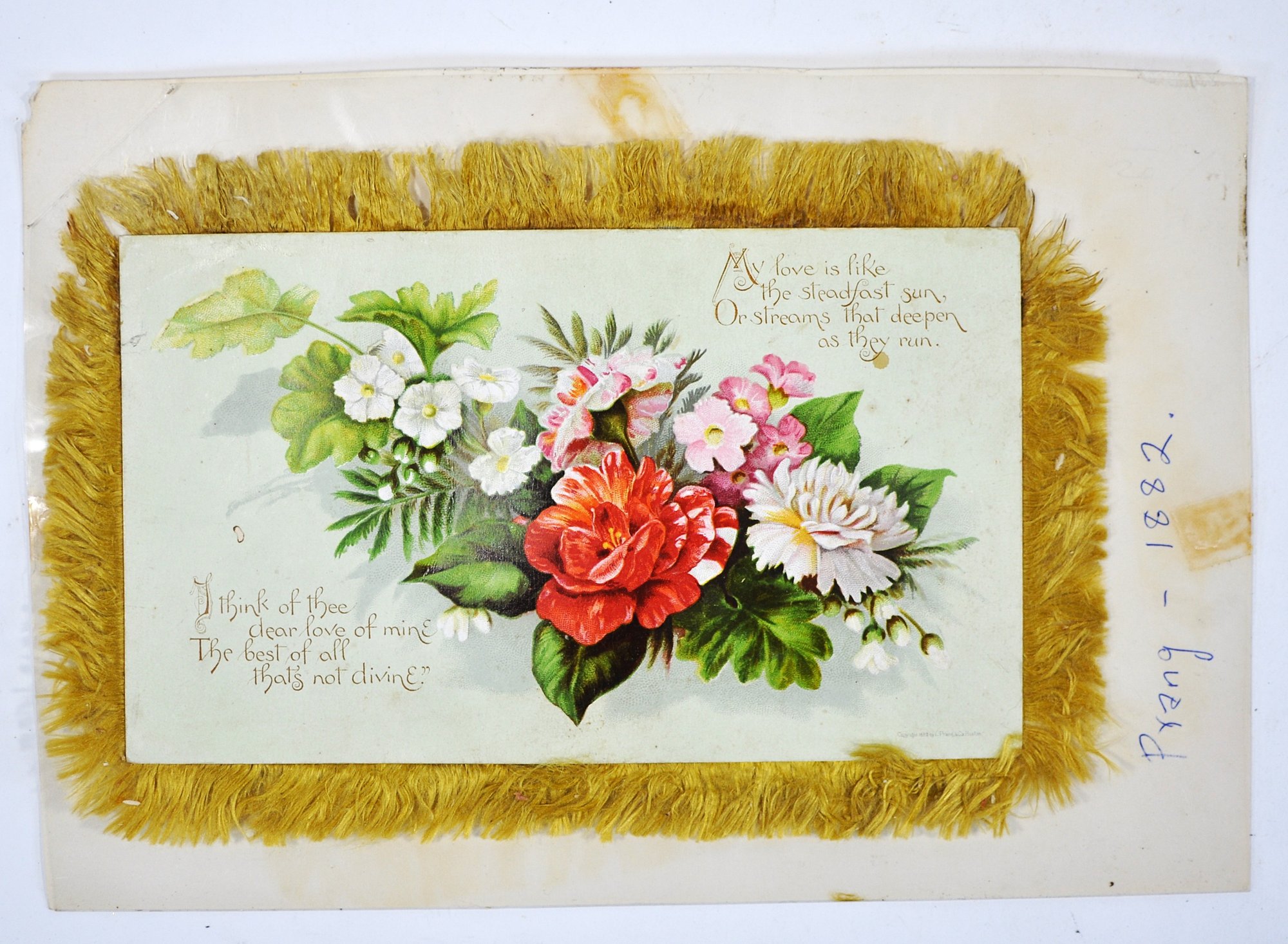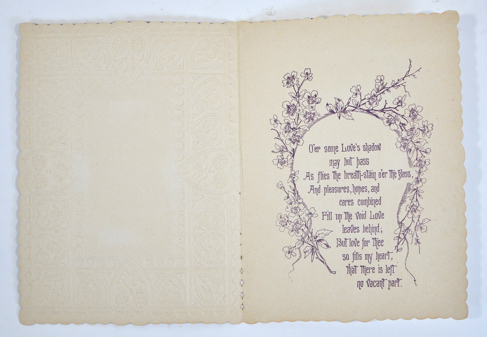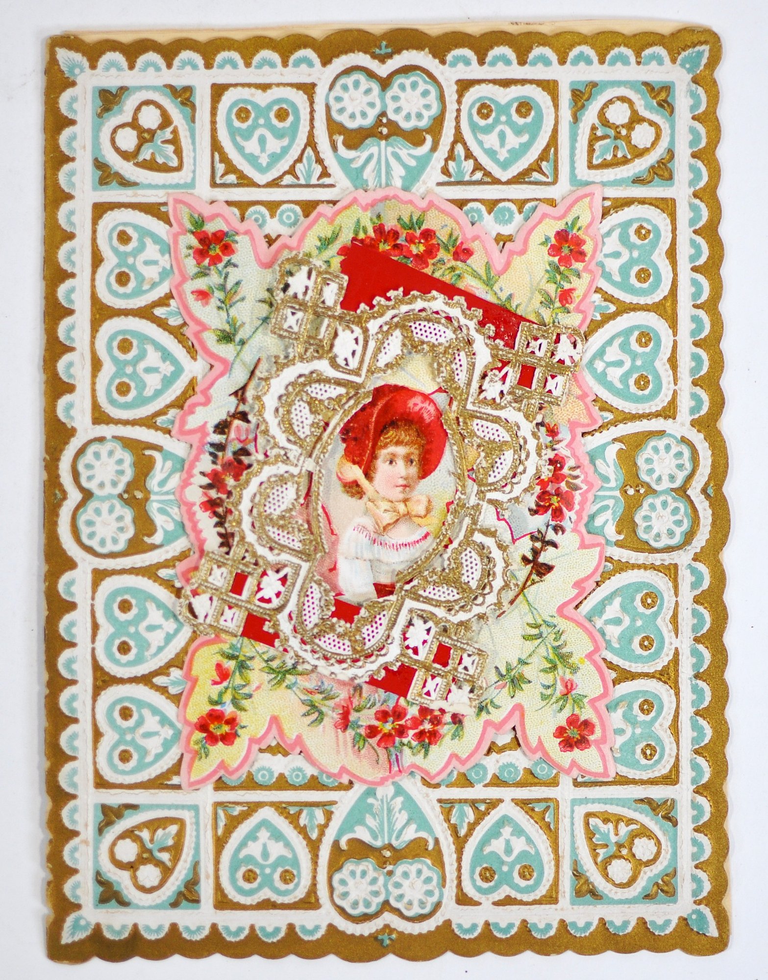 Several cards retain interior verse panels with period poetry. These are classic examples of Victorian sentimental paper ephemera, produced during the golden age of Valentine card making.