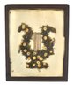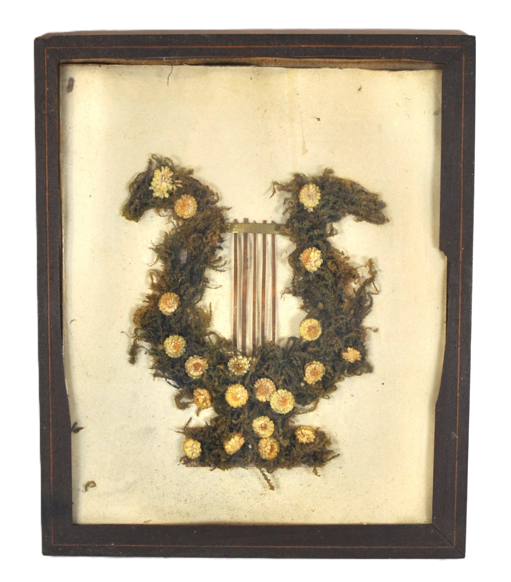 Antique Victorian mourning artwork featuring a lyre flanked by a wreath of preserved moss and dried flowers, displayed under original glass in a period wooden frame. A delicate 19th-century memorial piece with aged toning, scattered debris inside glass, and frame wear with losses.