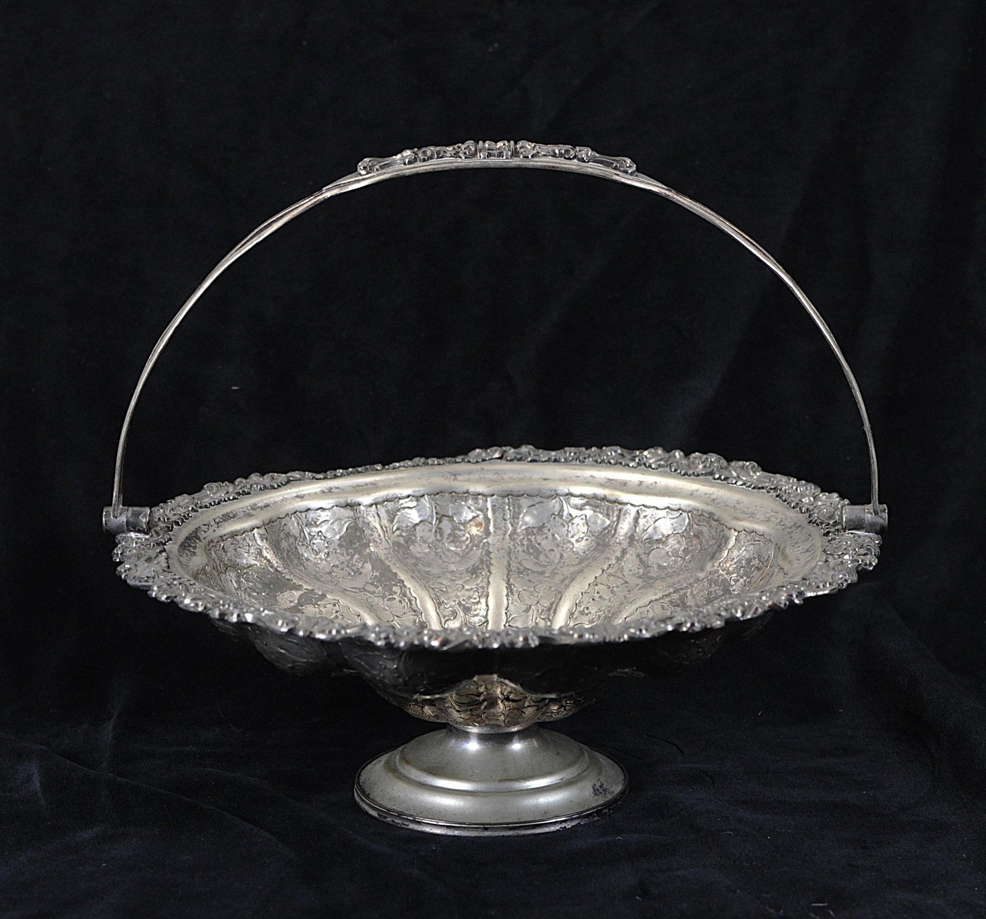 Elegant 19th-century silverplate brides basket featuring a deeply scalloped bowl with ornate repoussé floral panels and a decorative swing handle. The rim is richly embellished with scrolling rococo-style motifs, adding beautiful texture and shine. Stands on a round pedestal base.