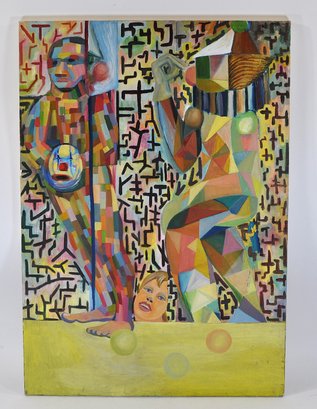 Colorful abstract figurative oil painting in a geometric, mosaic-like style. The composition features two stylized figures against a patterned background, with bold block colors, angular forms, and expressive faces.