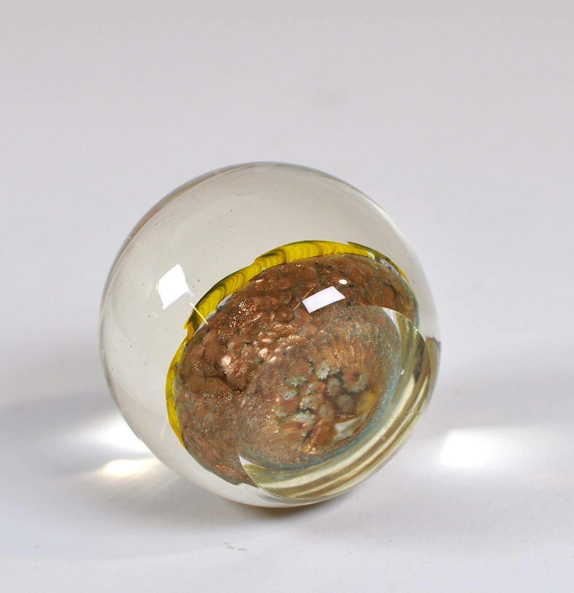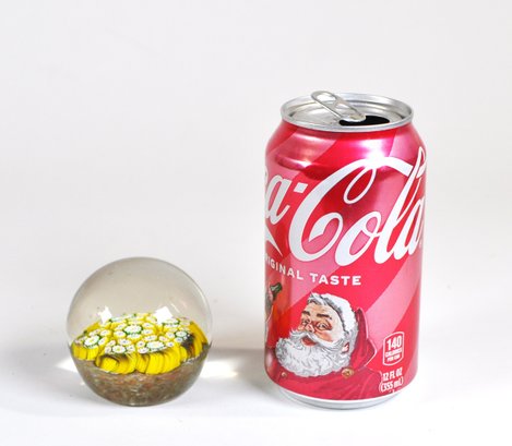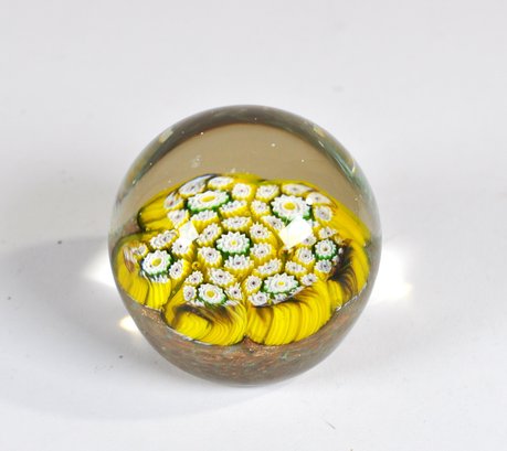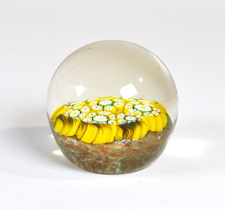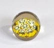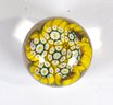 Vintage art glass paperweight featuring a dense millefiori cane design in bright yellow, white, and green tones. The interior displays tightly packed floral/starburst canes arranged in a circular bouquet, encased beneath a clear domed glass top. The base shows a textured, mottled ground with warm brown and amber hues. Measures approx. 2.5".