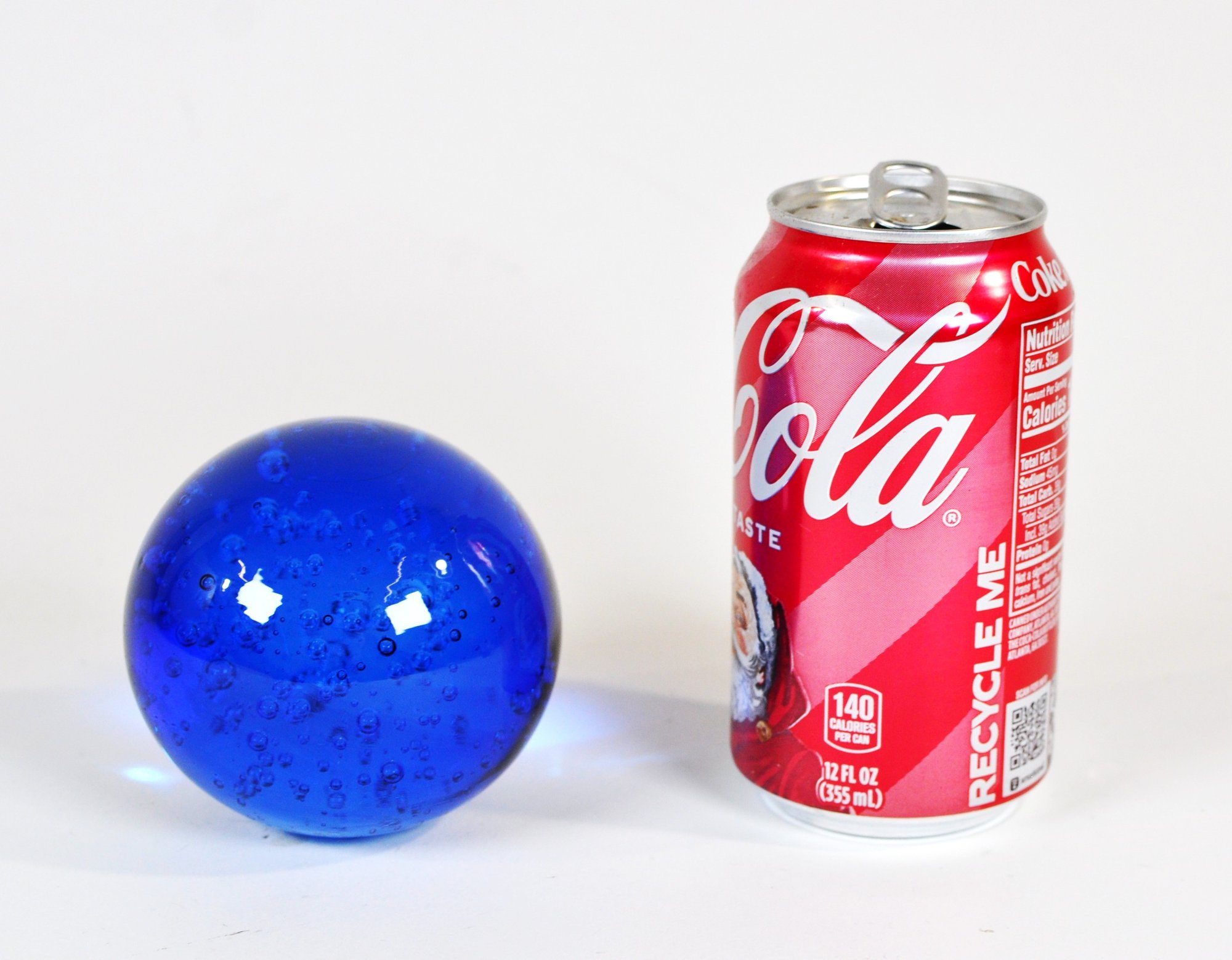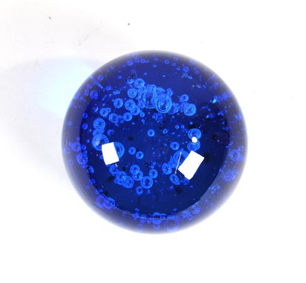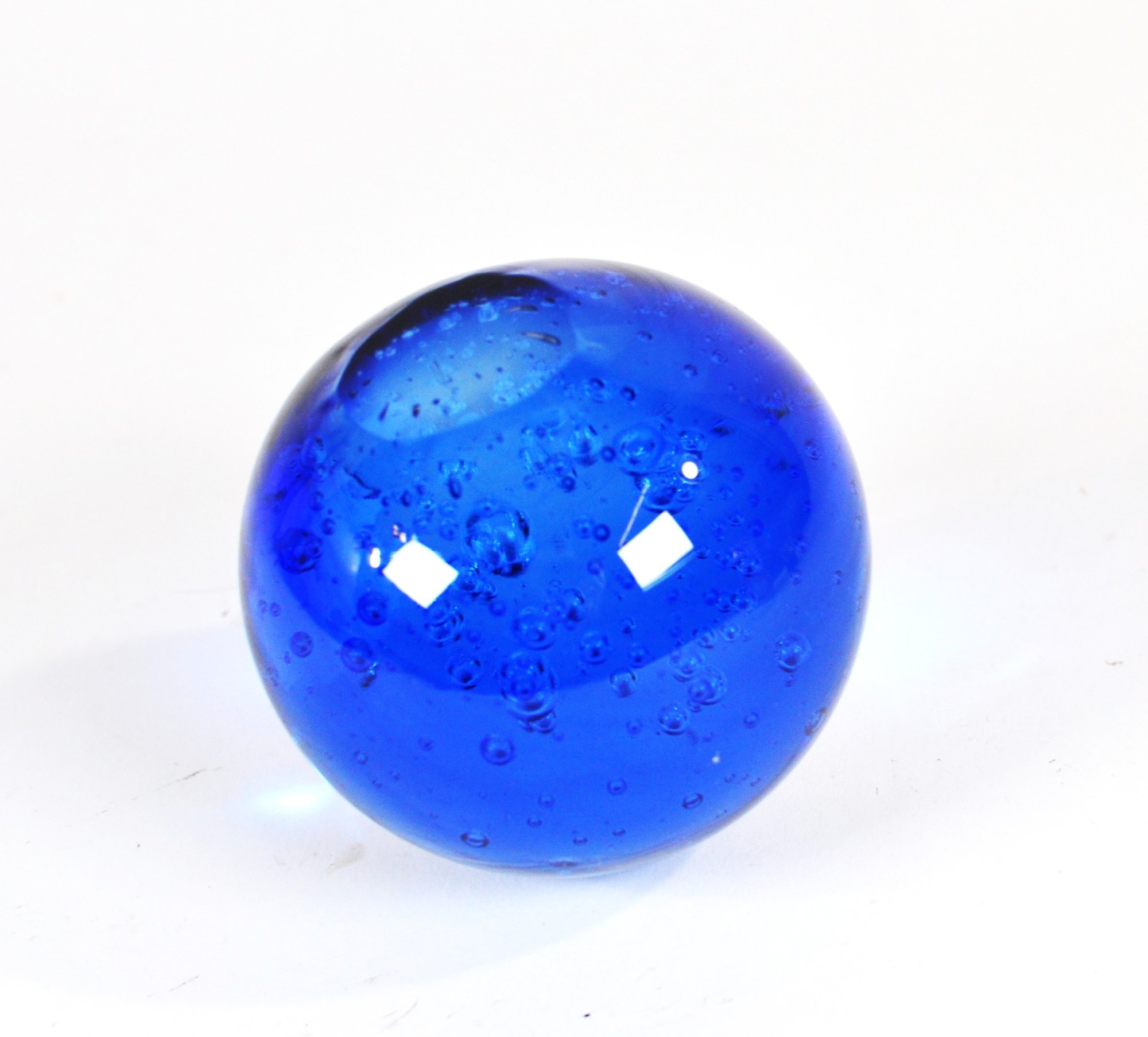 Decorative art glass paperweight , featuring a rich blue glass body with suspended controlled air bubbles throughout.