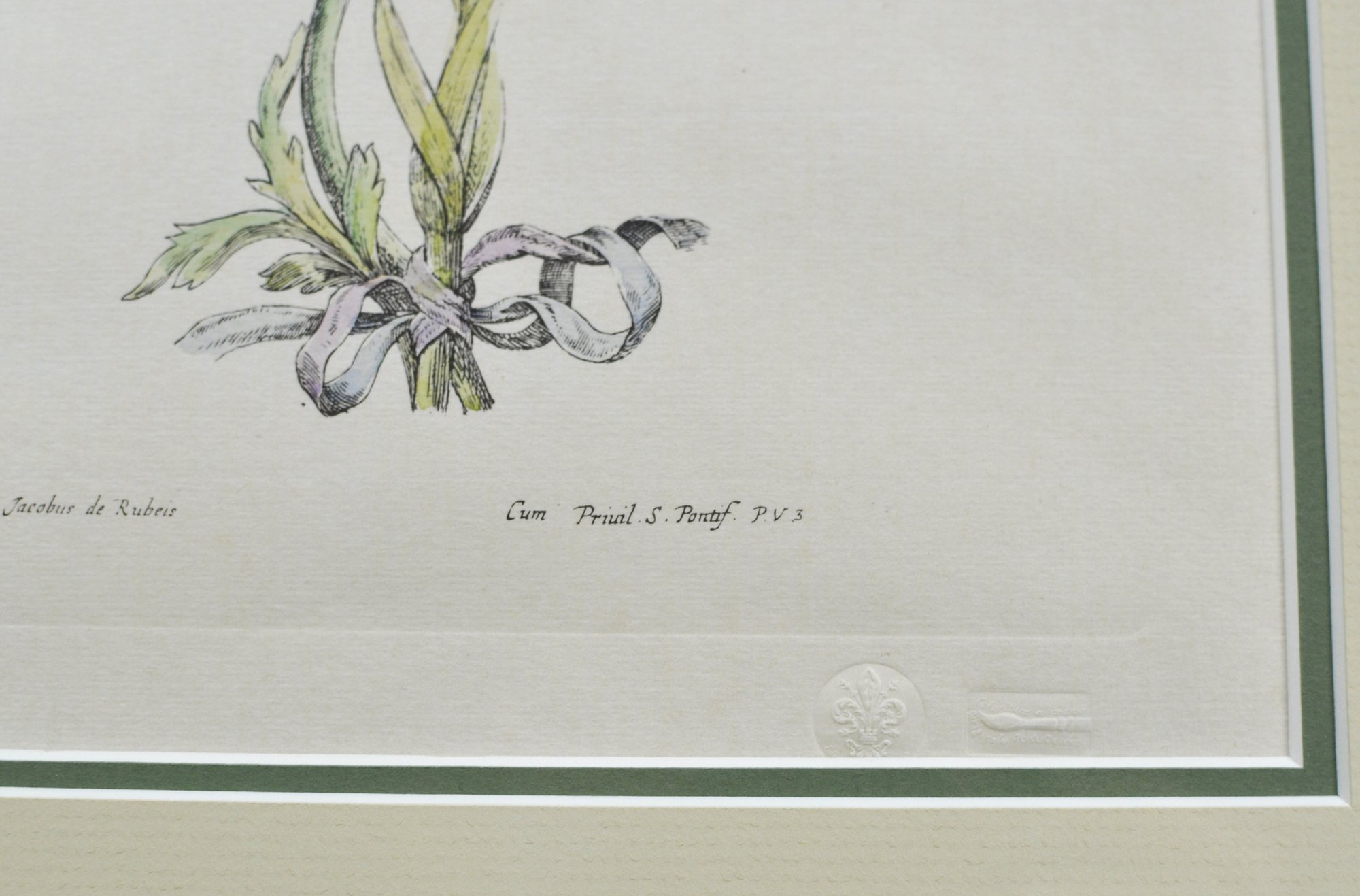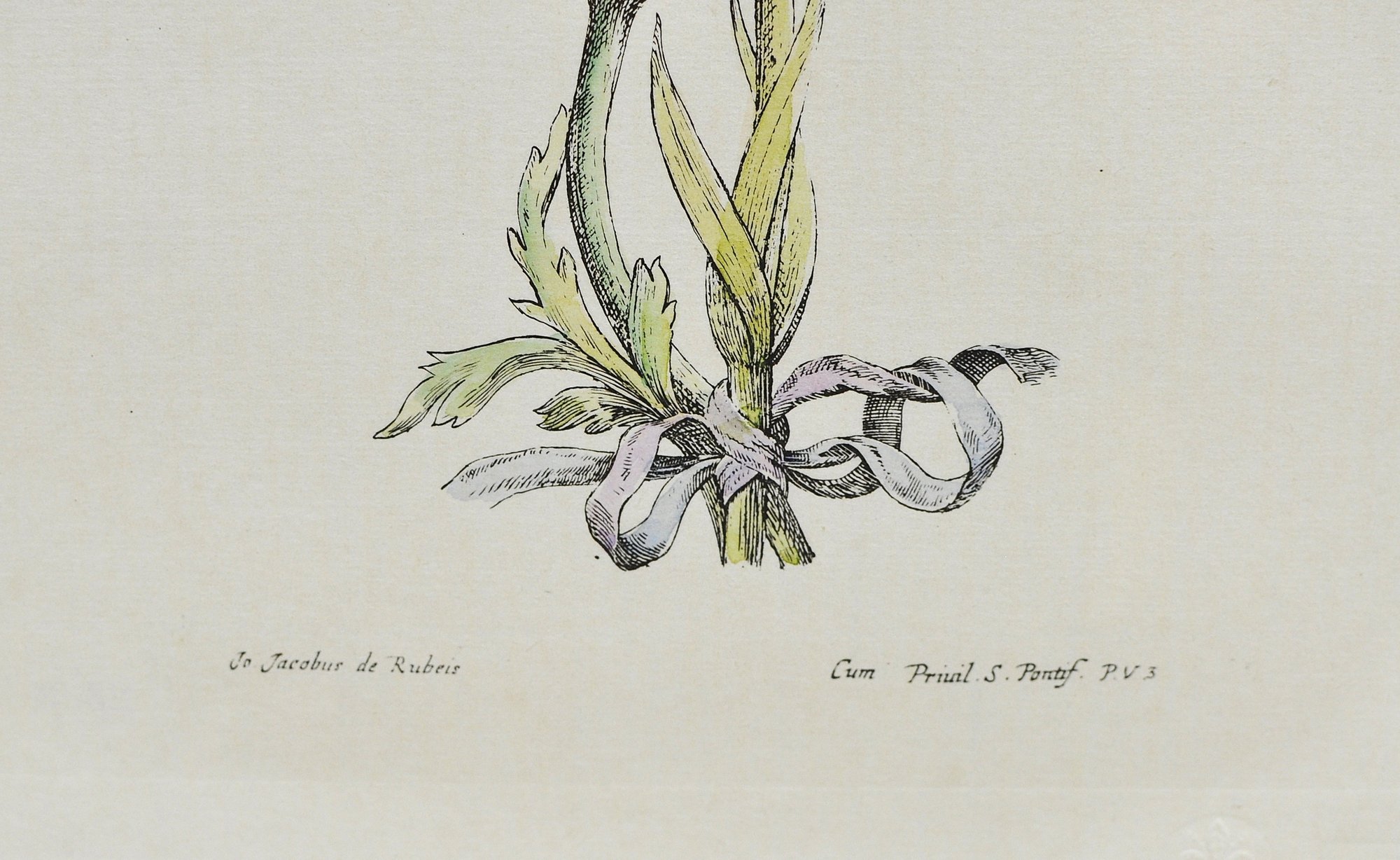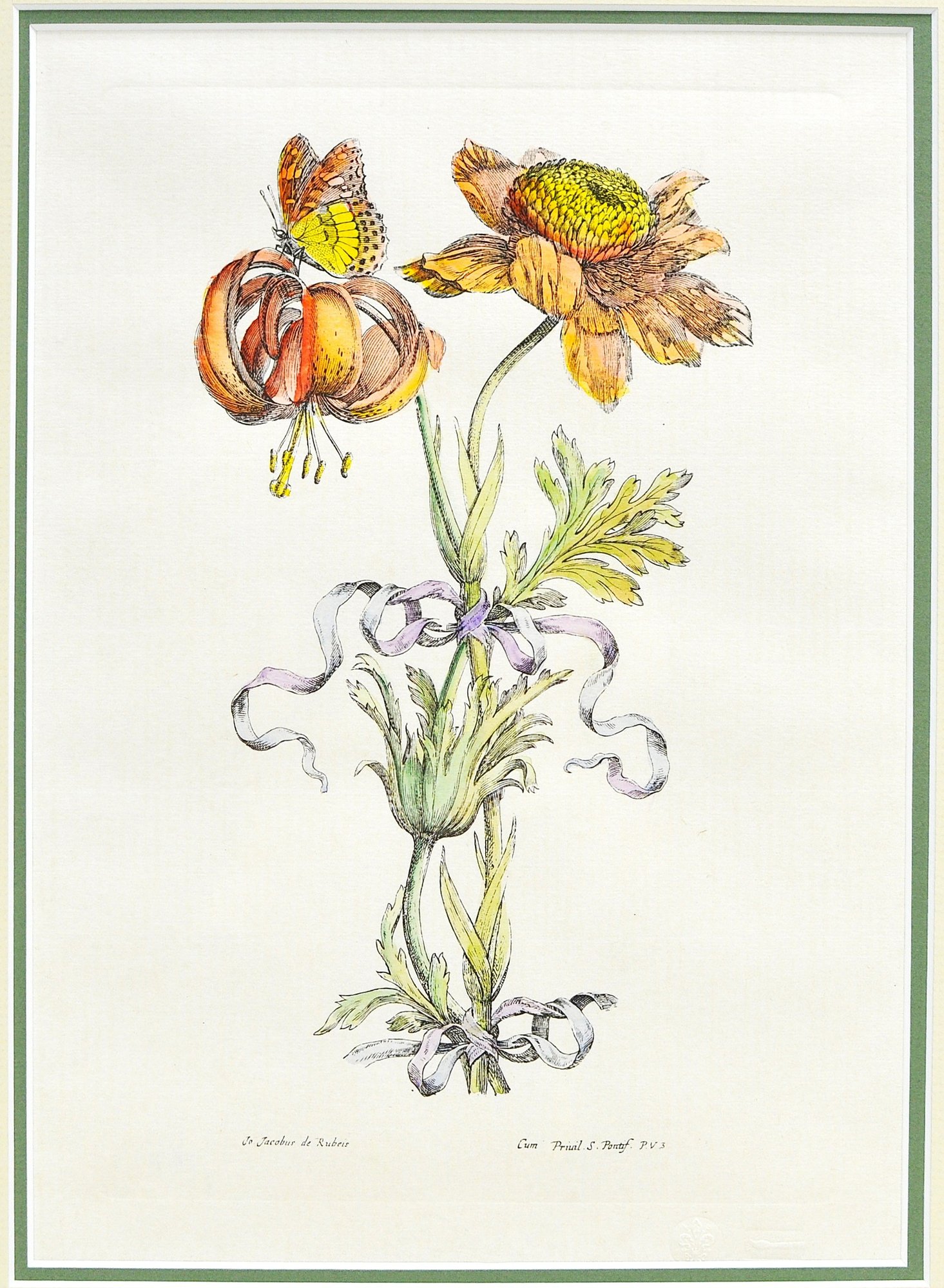 Elegant botanical engraving after Jacobus de Rubens, featuring a finely executed floral study with a butterfly perched atop a stylized bloom. The composition showcases delicate linework enhanced with hand coloring, several embossed seals at lower right.