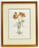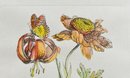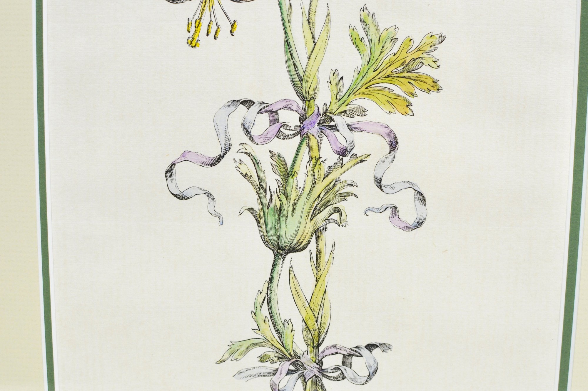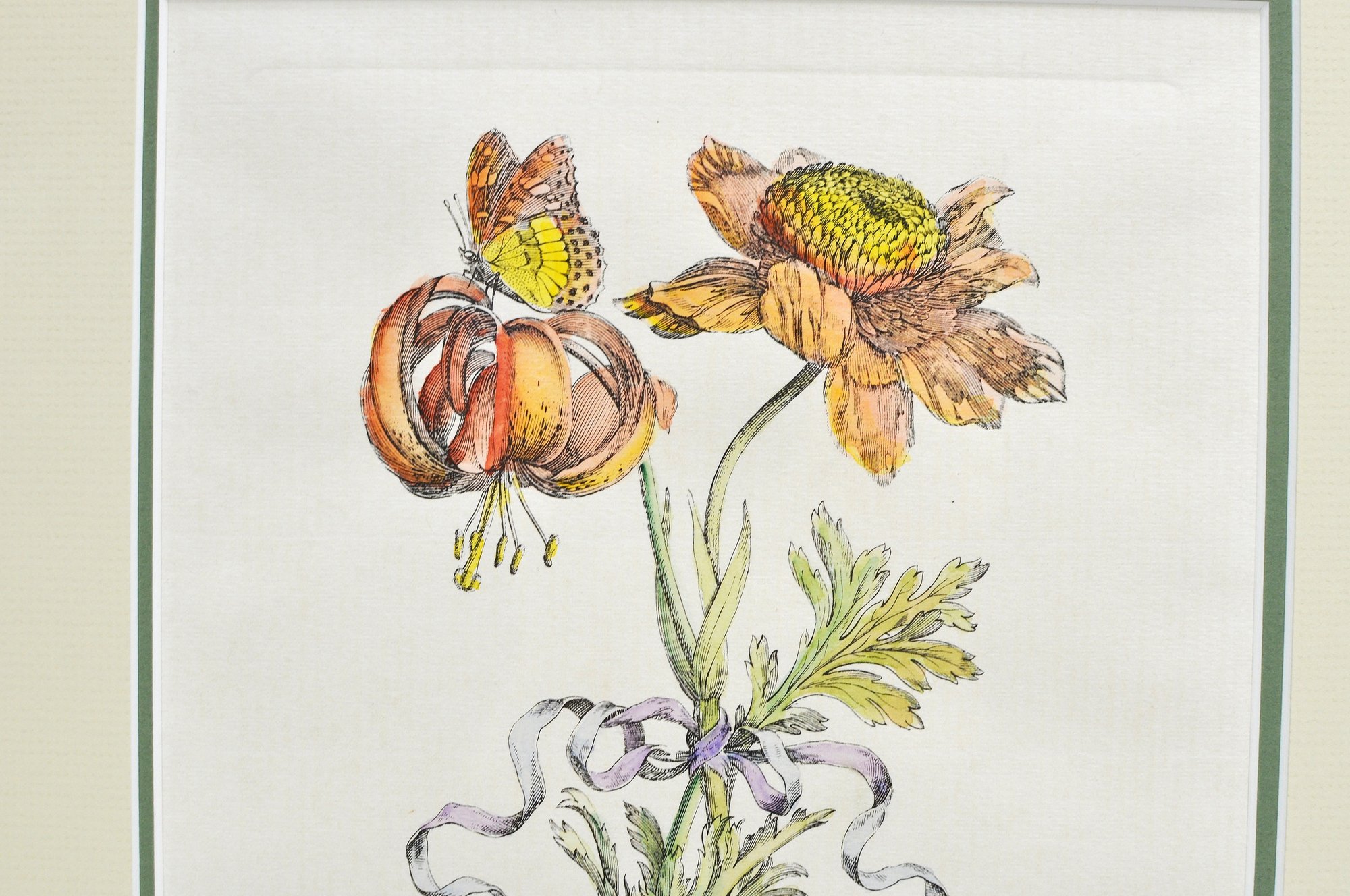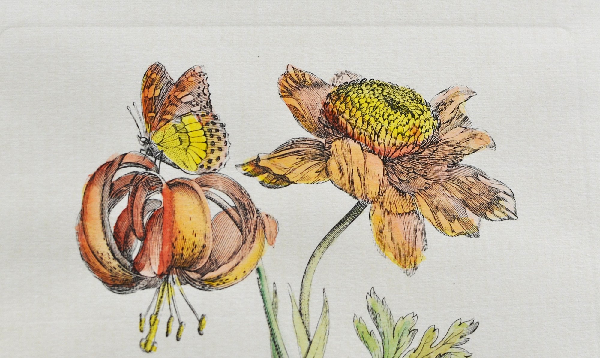 Elegant botanical engraving after Jacobus de Rubens, featuring a finely executed floral study with a butterfly perched atop a stylized bloom. The composition showcases delicate linework enhanced with hand coloring, several embossed seals at lower right.