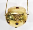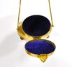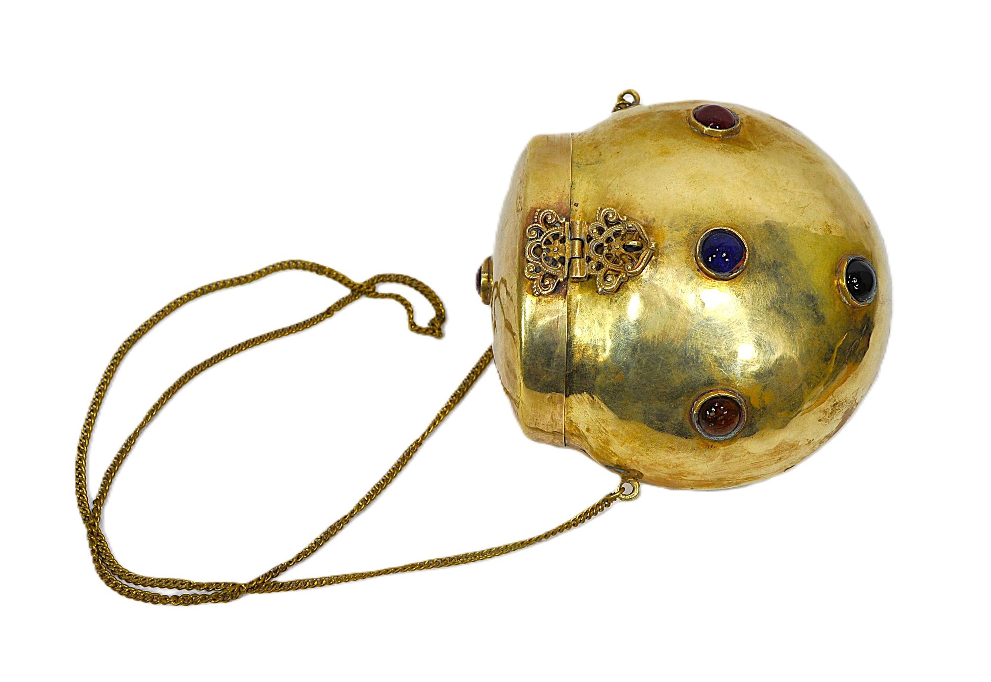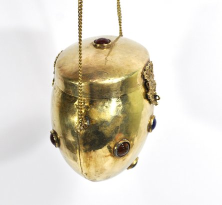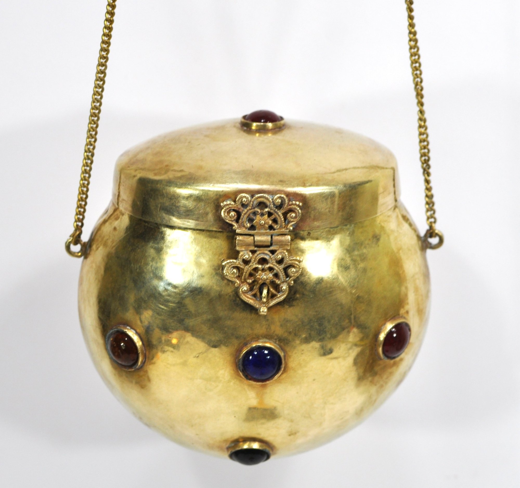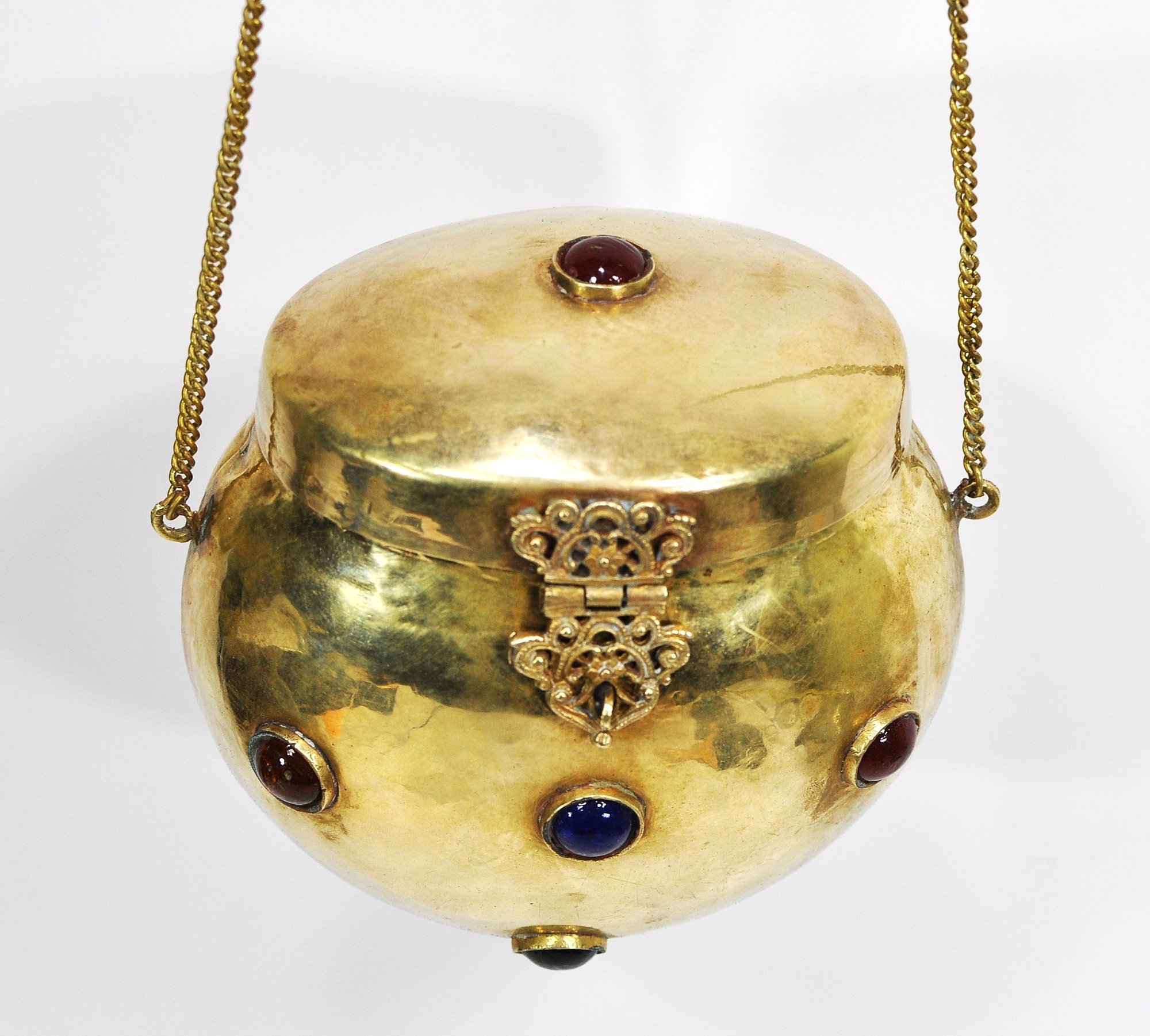 Decorative spherical brass hanging clam box with chain suspension, set with multicolored cabochon-style stones and ornate clasp. Interior lined in deep blue velvet. Likely mid-20th century, designed for jewelry or small treasures. Small bags like this were often called "dance purses" or "vanity cases," designed to hold only the bare essentials—perhaps a lipstick, a key, and a few coins.