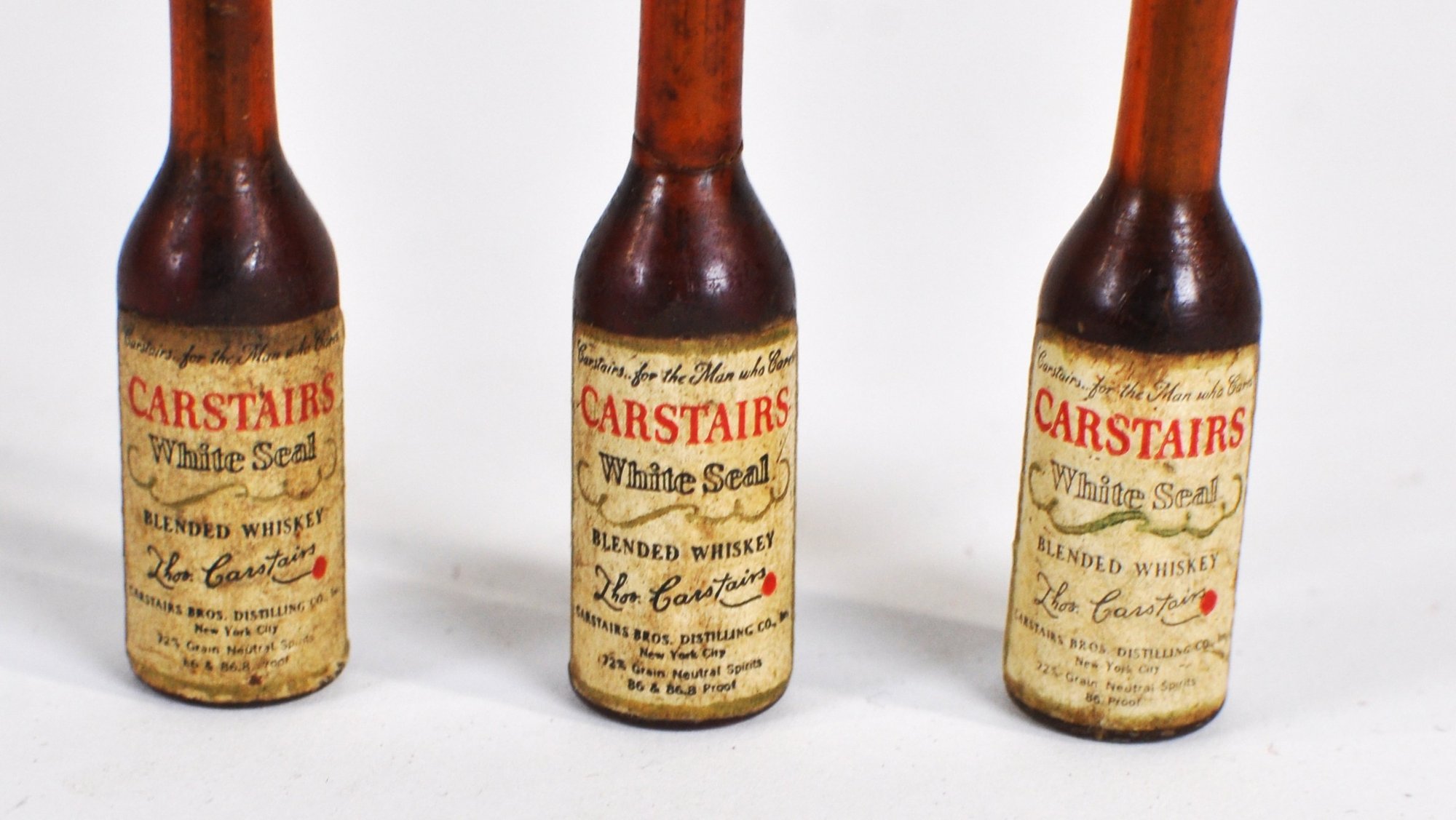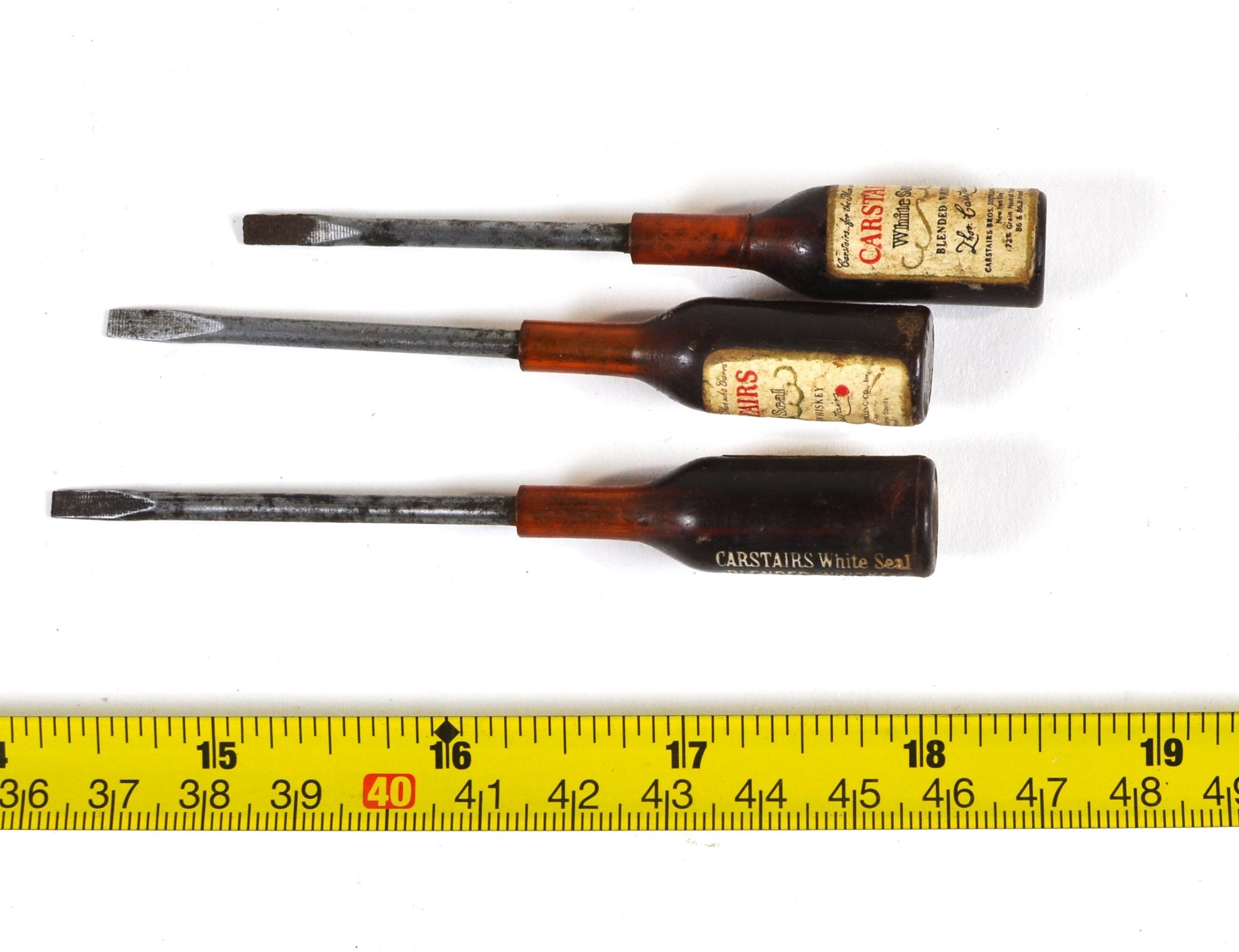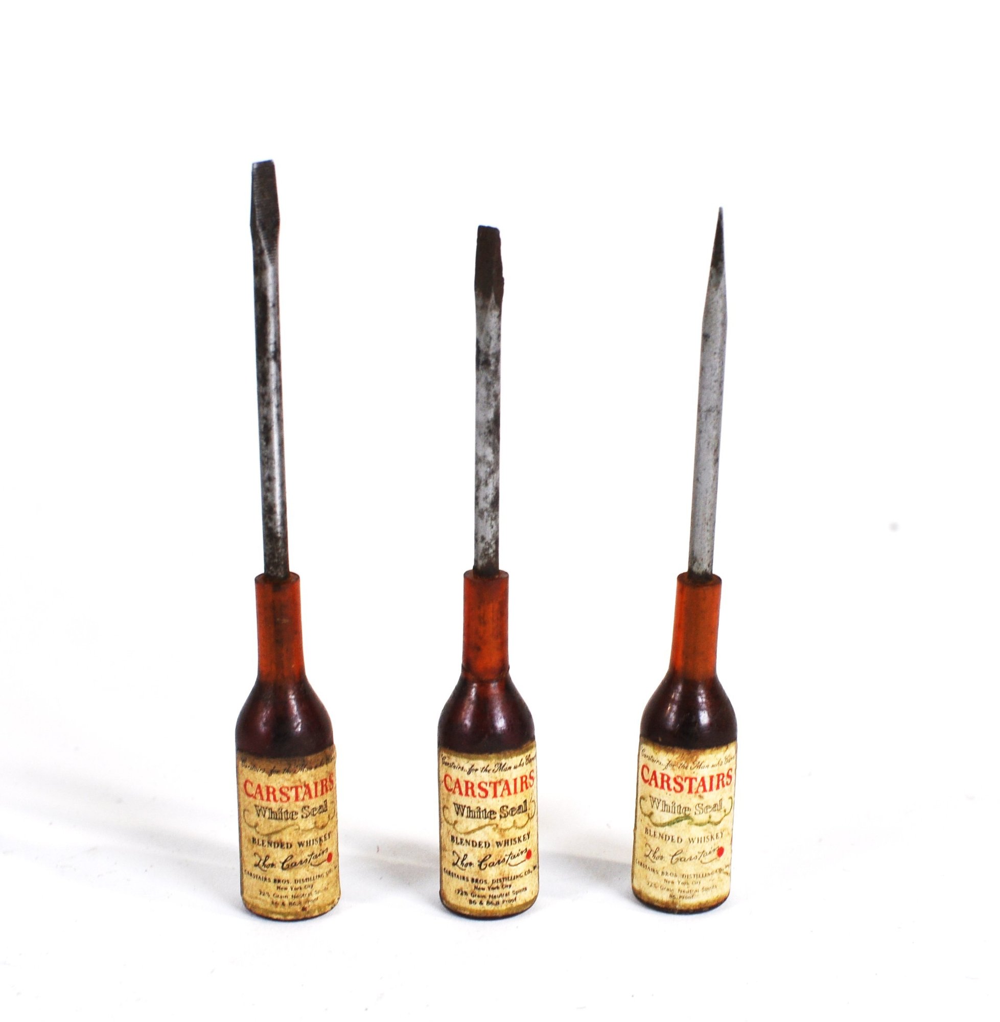 Set of three vintage metal tools with amber-colored handles advertising Carstairs White Seal Blended Whiskey. Each tool features a steel shaft with a flat or pointed working tip and a molded handle wrapped with original Carstairs paper labels.