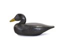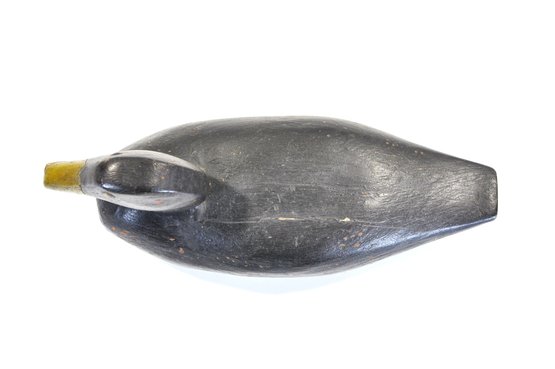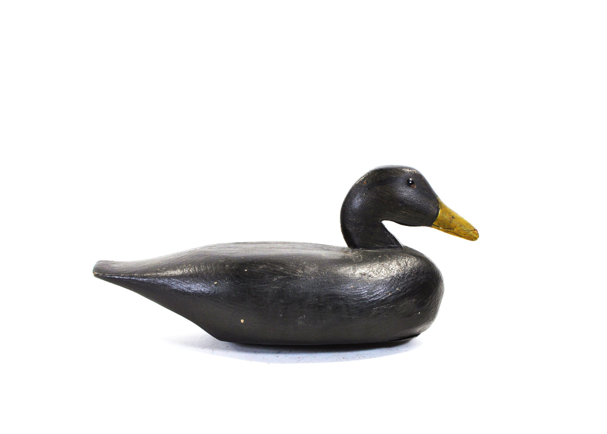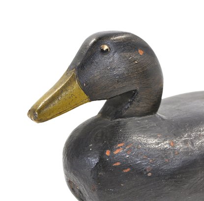 A classic vintage carved wooden duck decoy, featuring a clean, streamlined form with a dark painted body and contrasting yellow bill. The surface shows honest age wear with scattered paint loss and handling marks, lending the piece a desirable, time-earned patina.