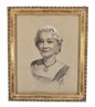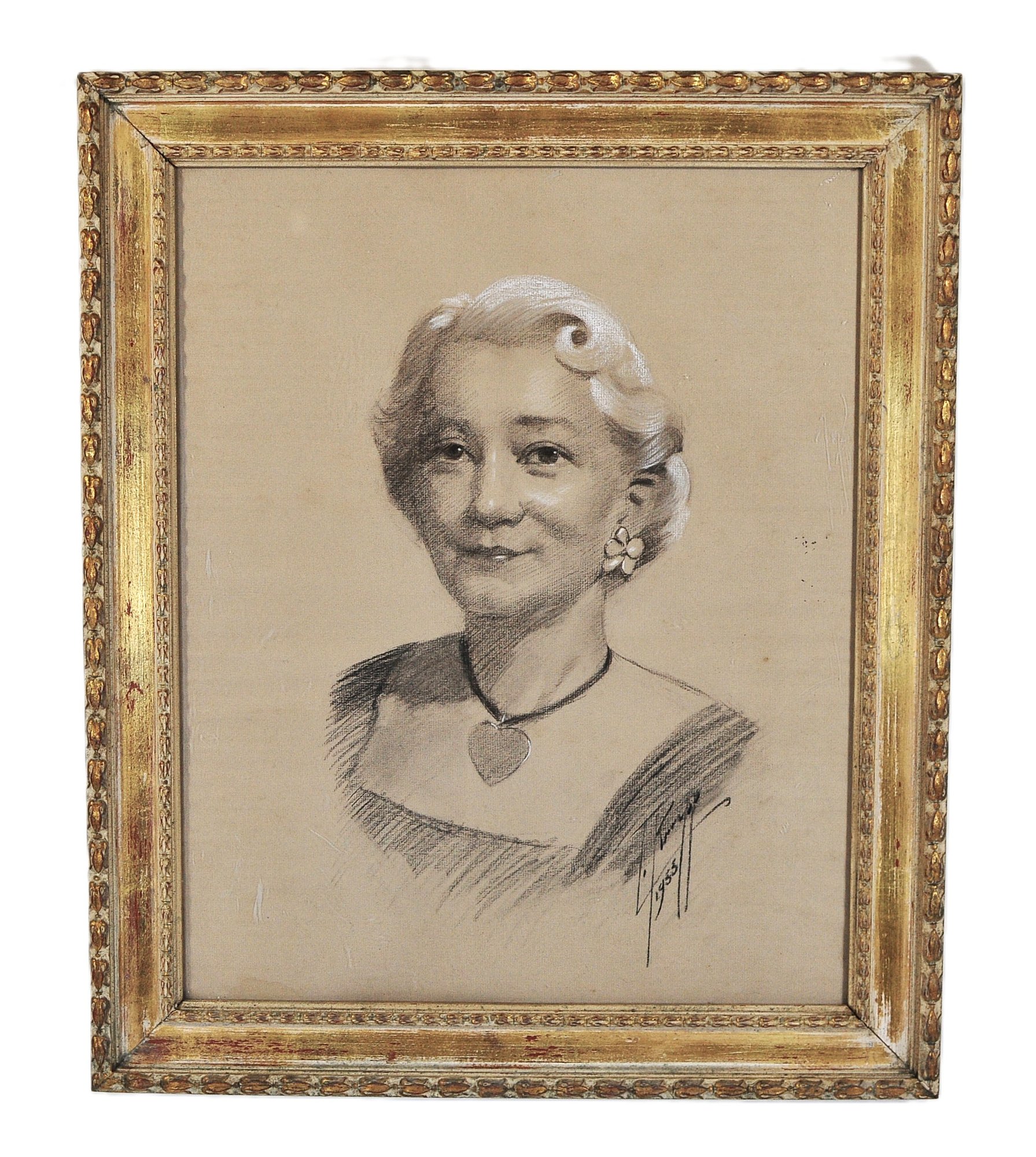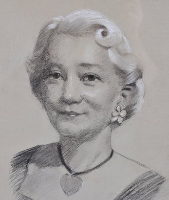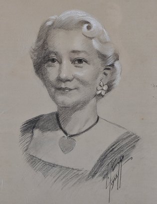 Mid-20th century charcoal portrait depicting an elegant older woman with softly styled hair, wearing floral earrings and a heart-shaped pendant necklace. The artist skillfully renders the subject with delicate shading and fine cross-hatching, creating a lifelike and expressive likeness.