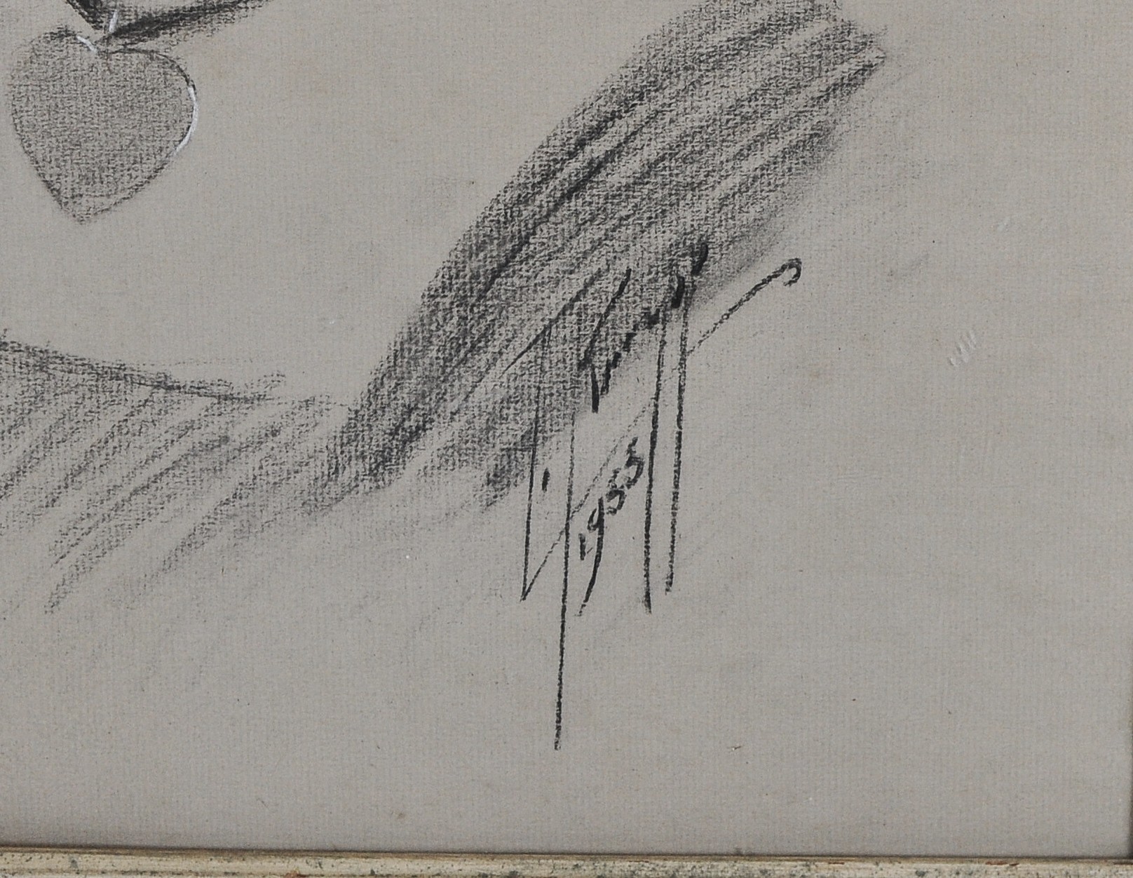The work is signed and dated “1955” in the lower right, though the artist’s name is difficult to clearly decipher. Executed in charcoal (or charcoal pencil) on paper and presented in a decorative gilt frame.