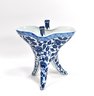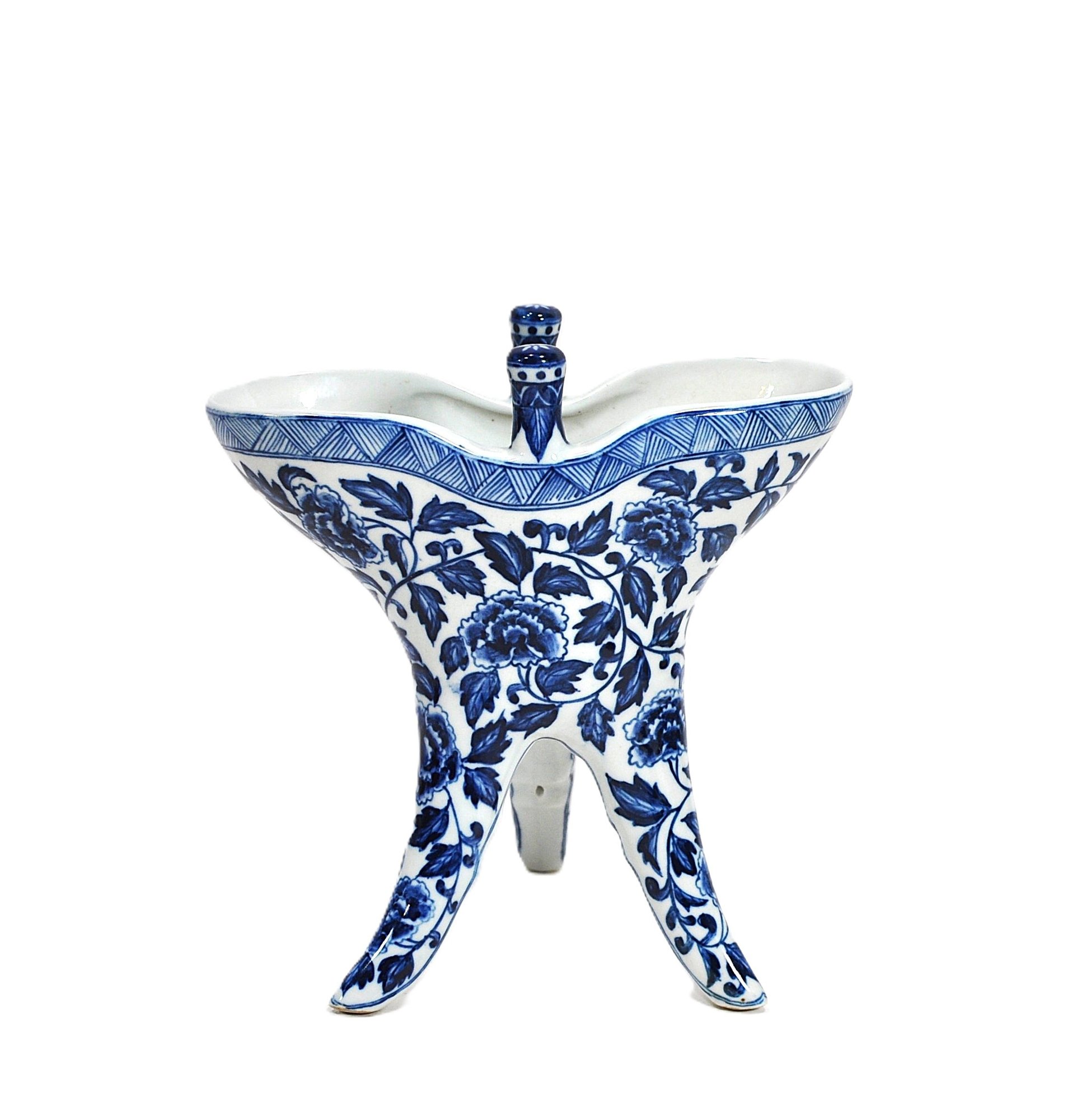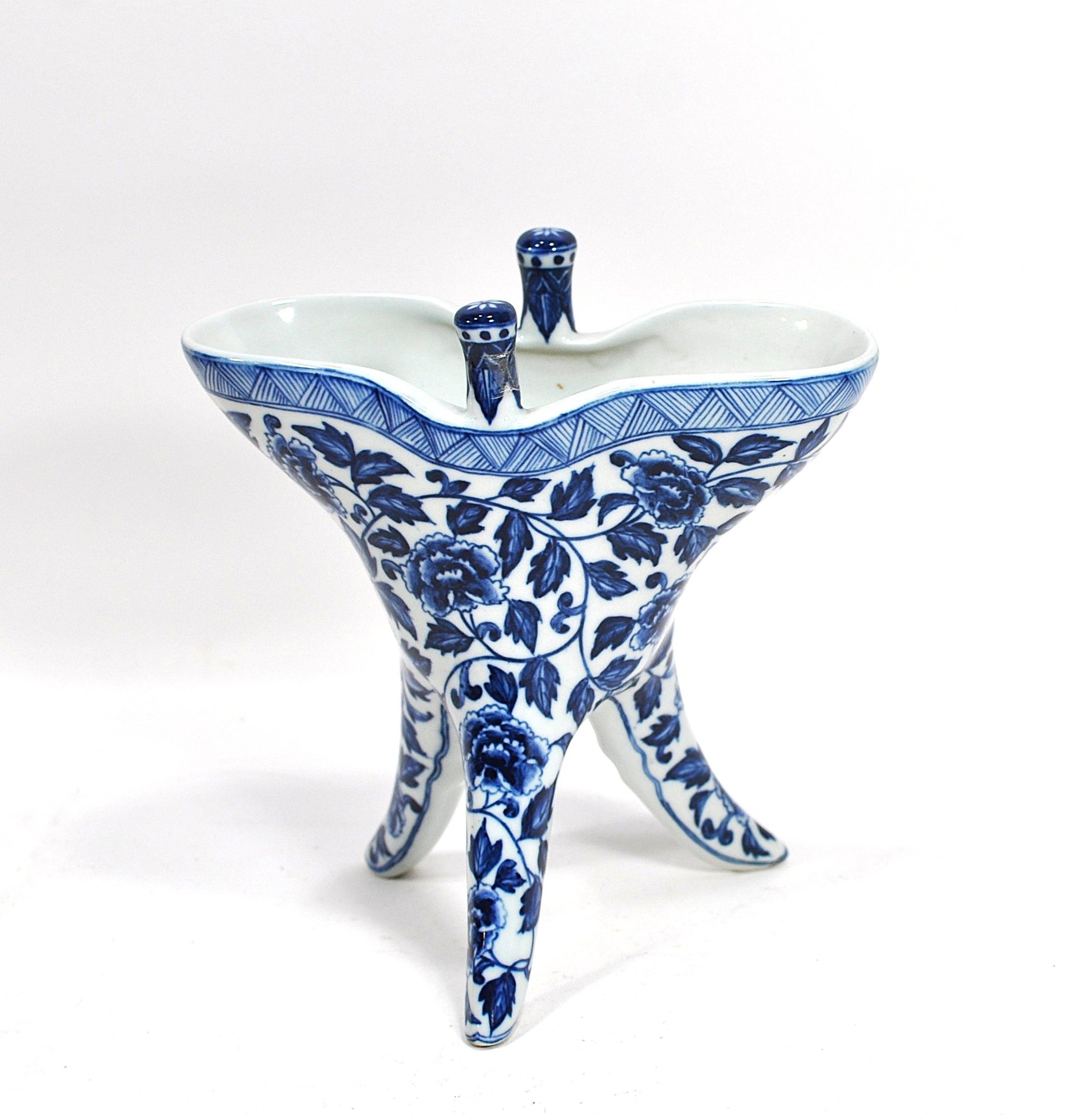 Chinese blue and white porcelain jue, a traditional tripod ritual wine vessel used historically for warming and serving wine in ceremonial contexts. The form features three slender legs, a flared mouth with spouted rim, and upright posts, decorated with scrolling floral motifs and geometric borders.