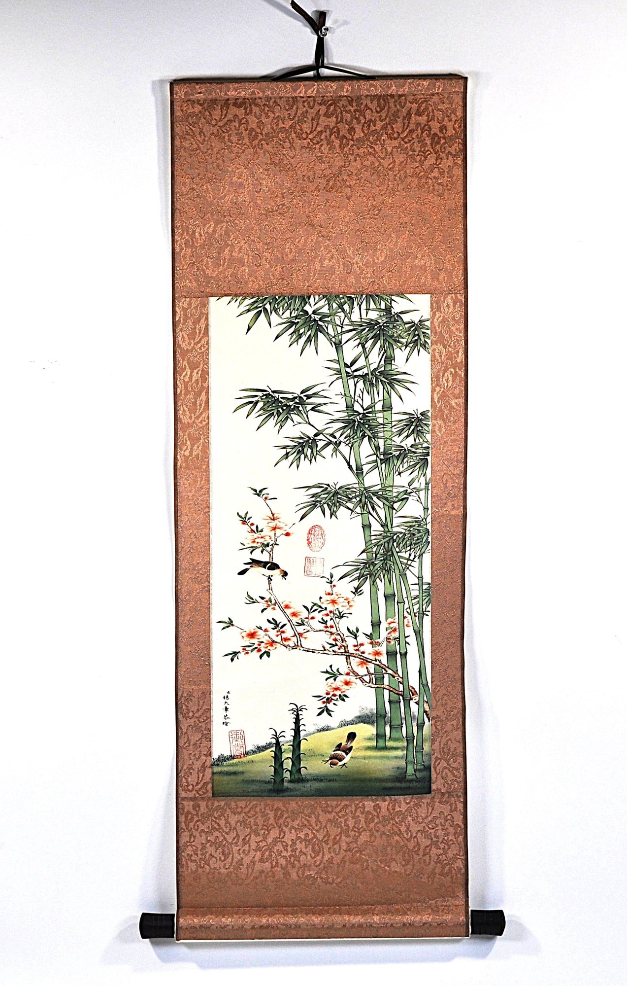 Mounted with brocade silk borders in warm copper tones and complete with wooden rollers and ribbon tie.