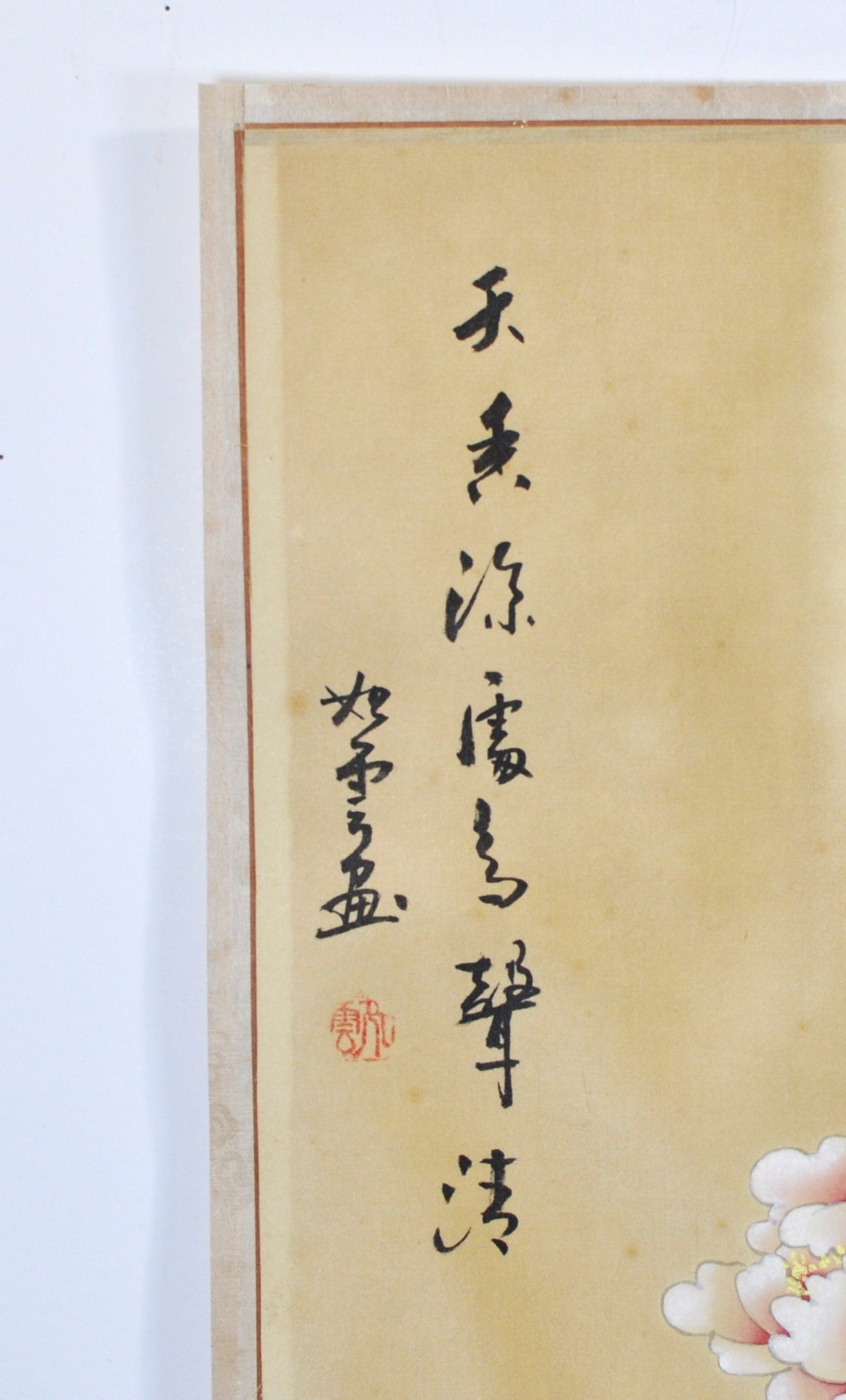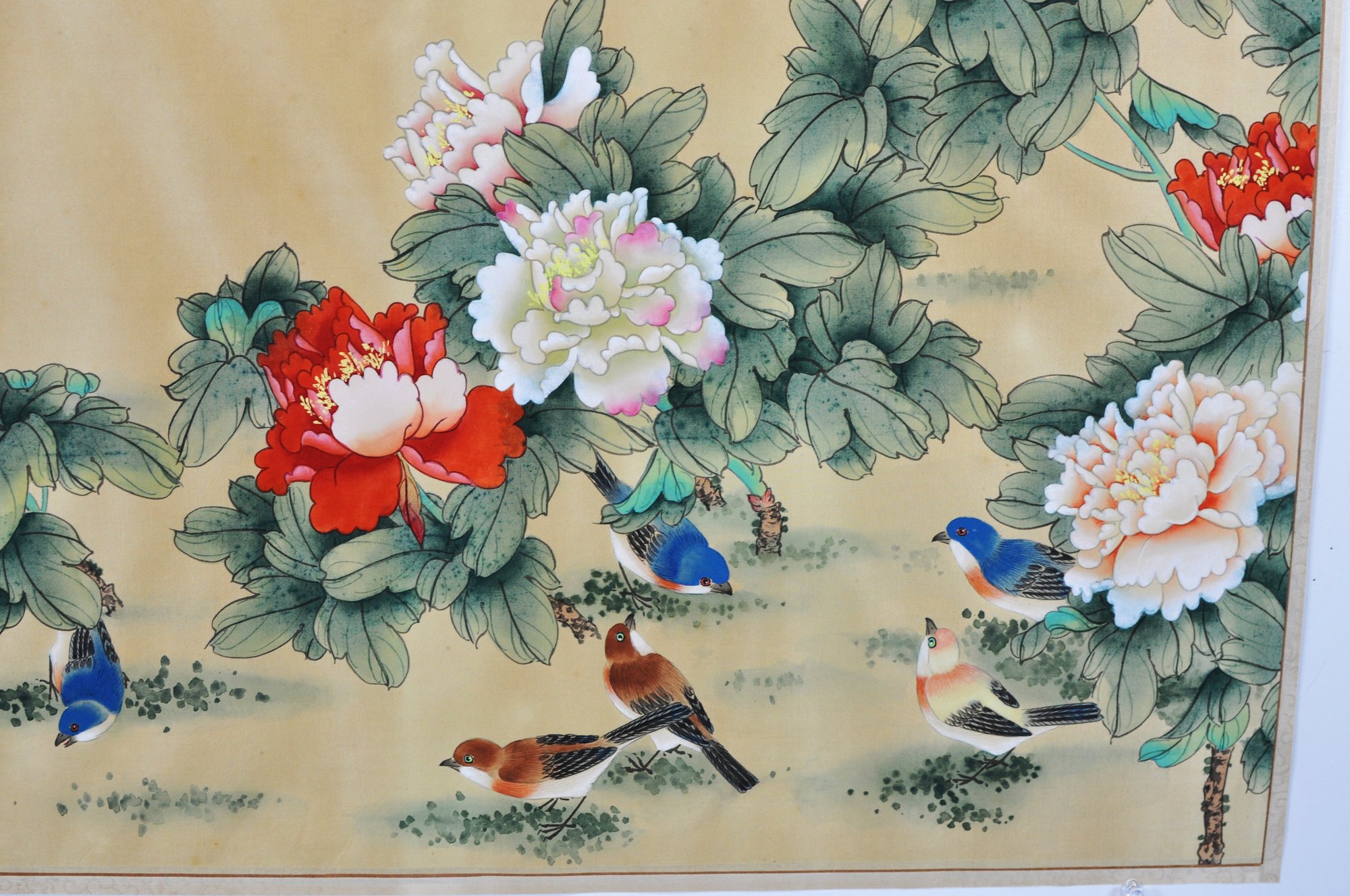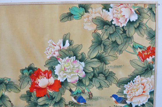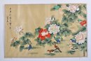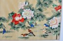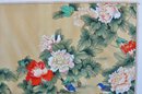 Ink and color on silk depicting blooming peonies with brightly colored songbirds in the traditional gongbi fine-line style. Calligraphic inscription and red artist seal at upper left. Mid–20th century. Unmounted silk panel with age-toning and light creasing.