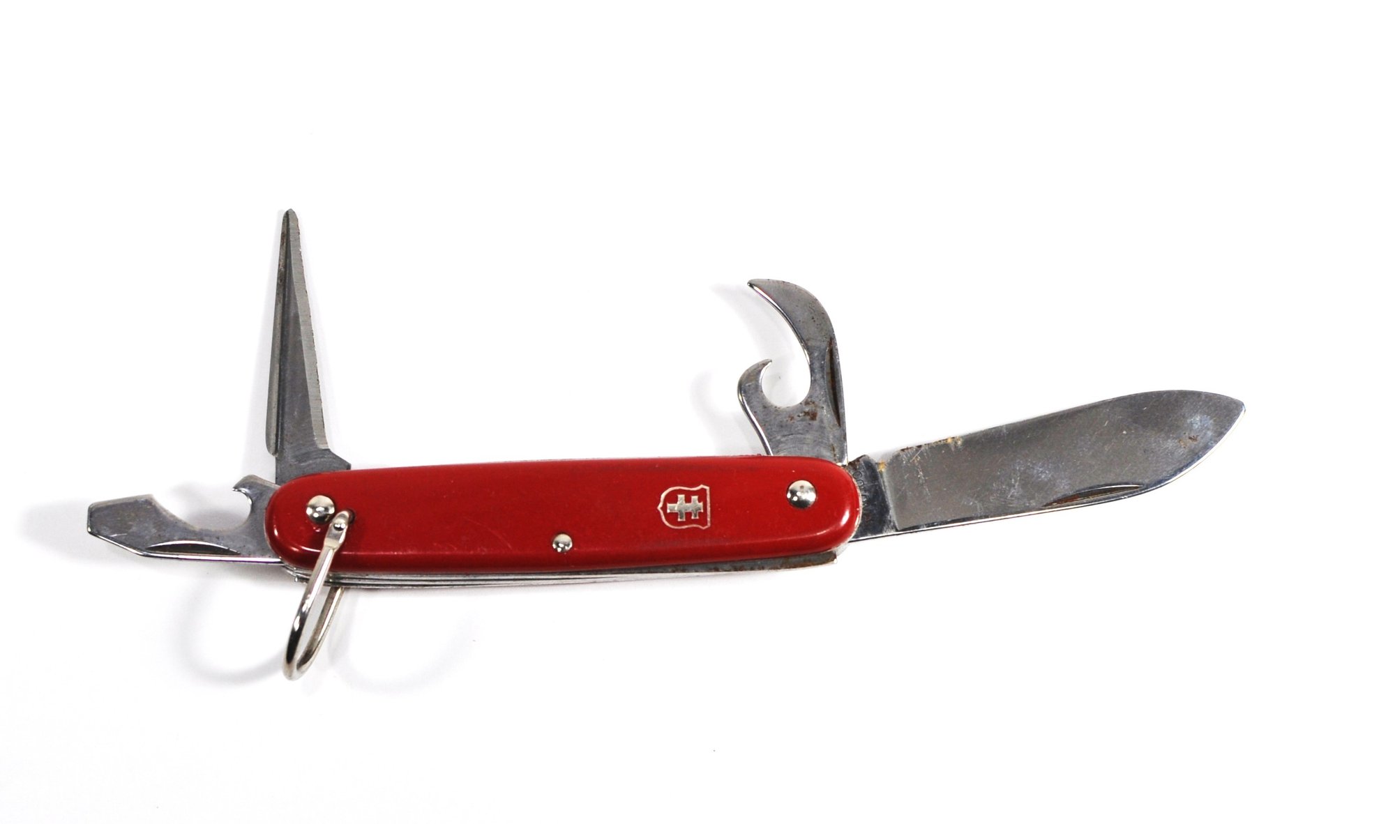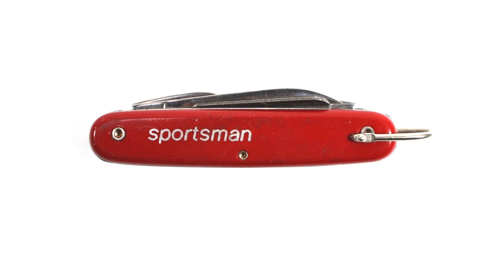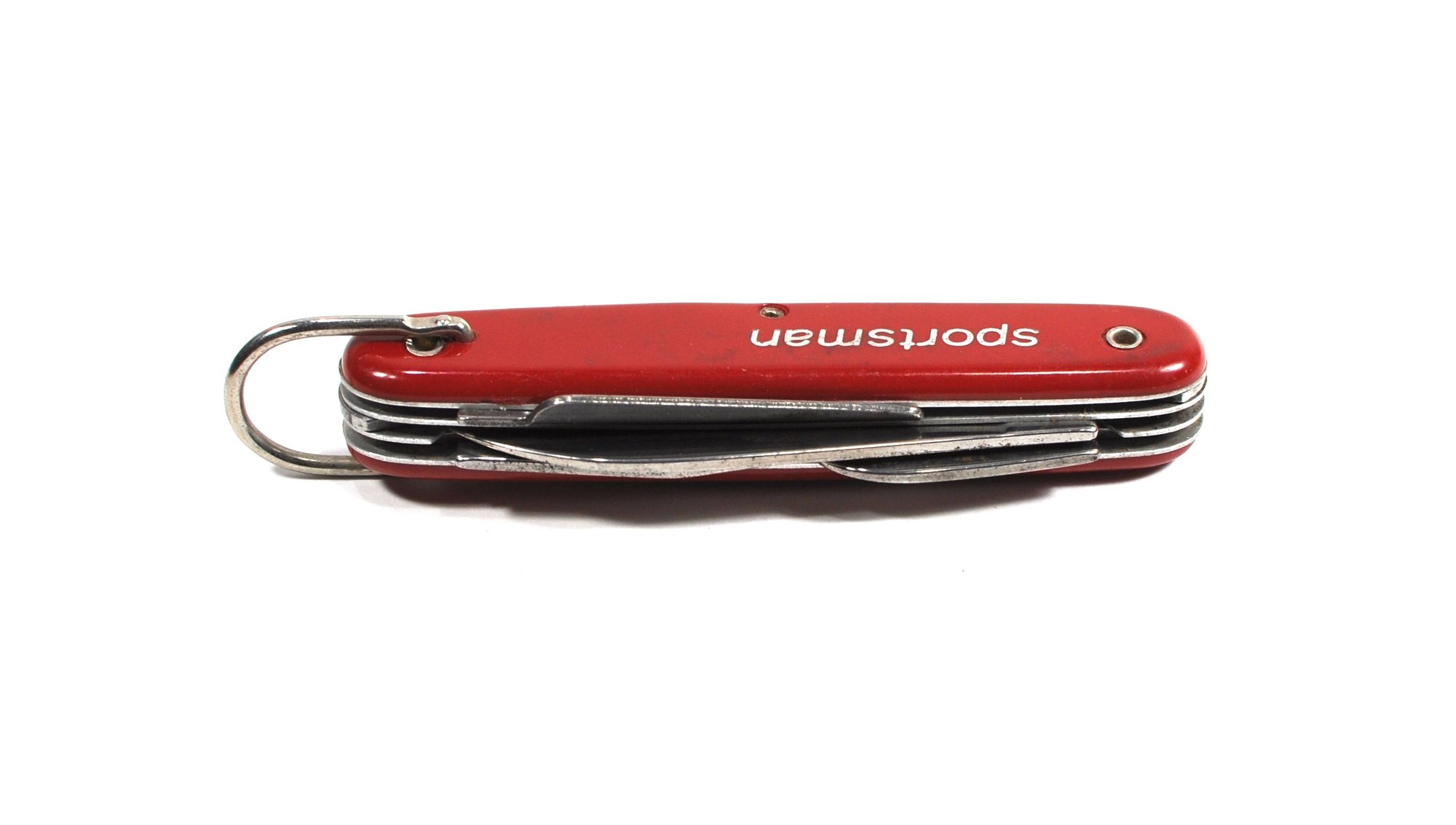 Vintage red Sportsman multi-tool pocket knife featuring a stainless steel blade and multiple fold-out tools.