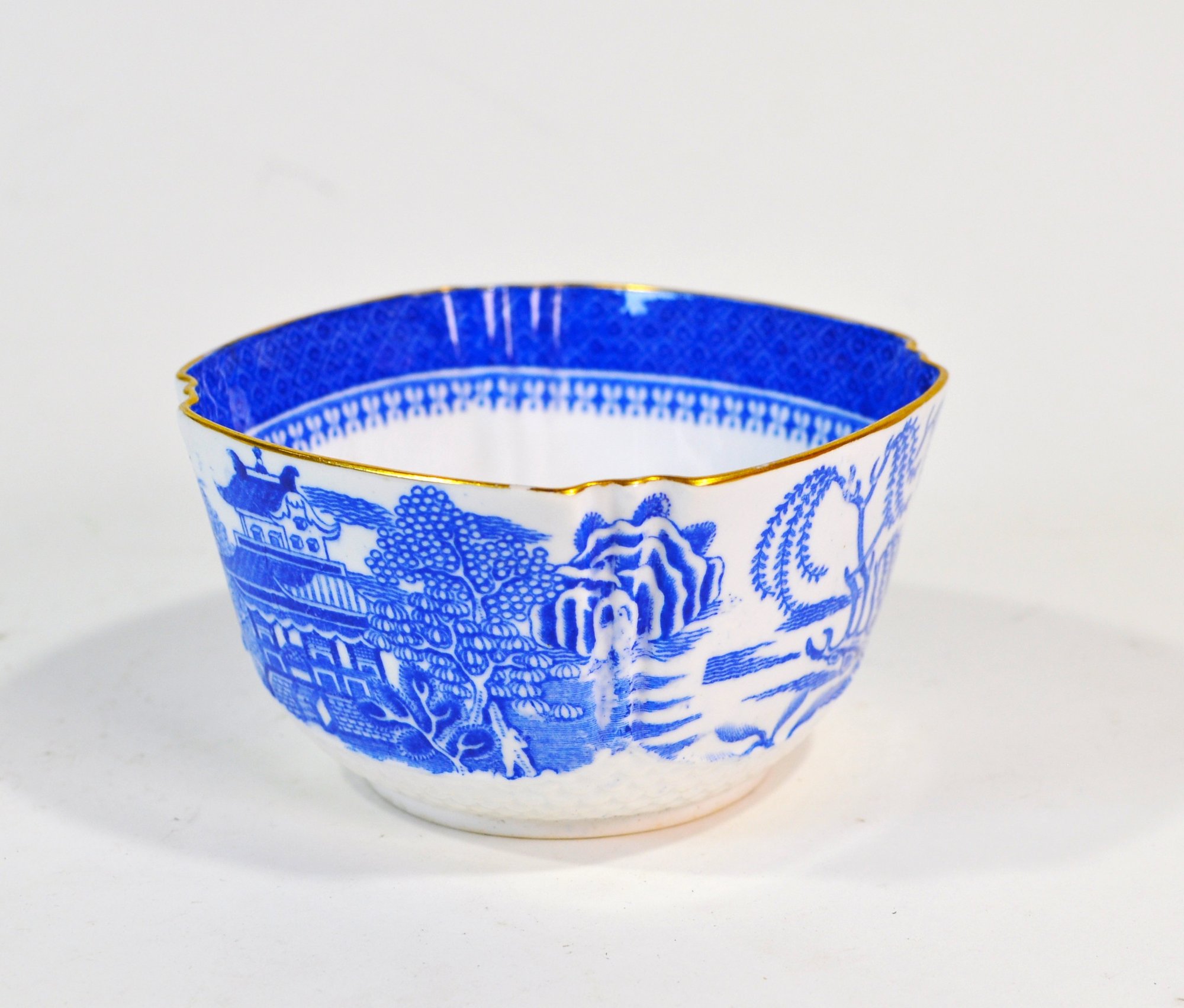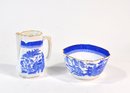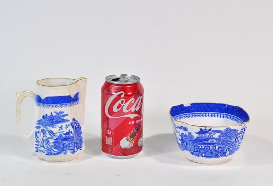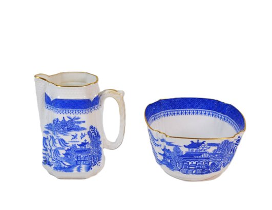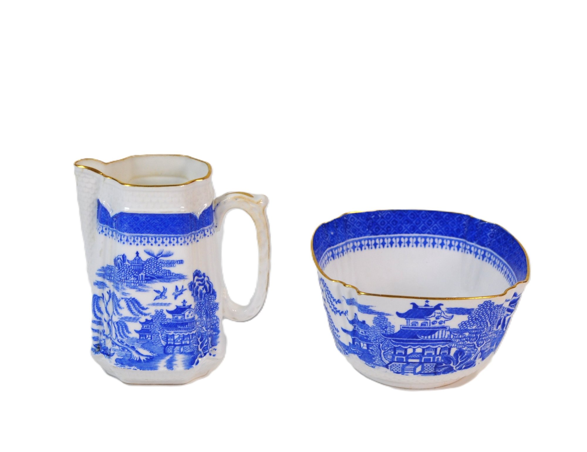 Matching blue and white transferware creamer and sugar bowl featuring a traditional Chinese-style landscape pattern with pavilions, trees, birds, and water scenes. Both pieces are accented with scalloped rims and gilt edging, adding a refined decorative touch.