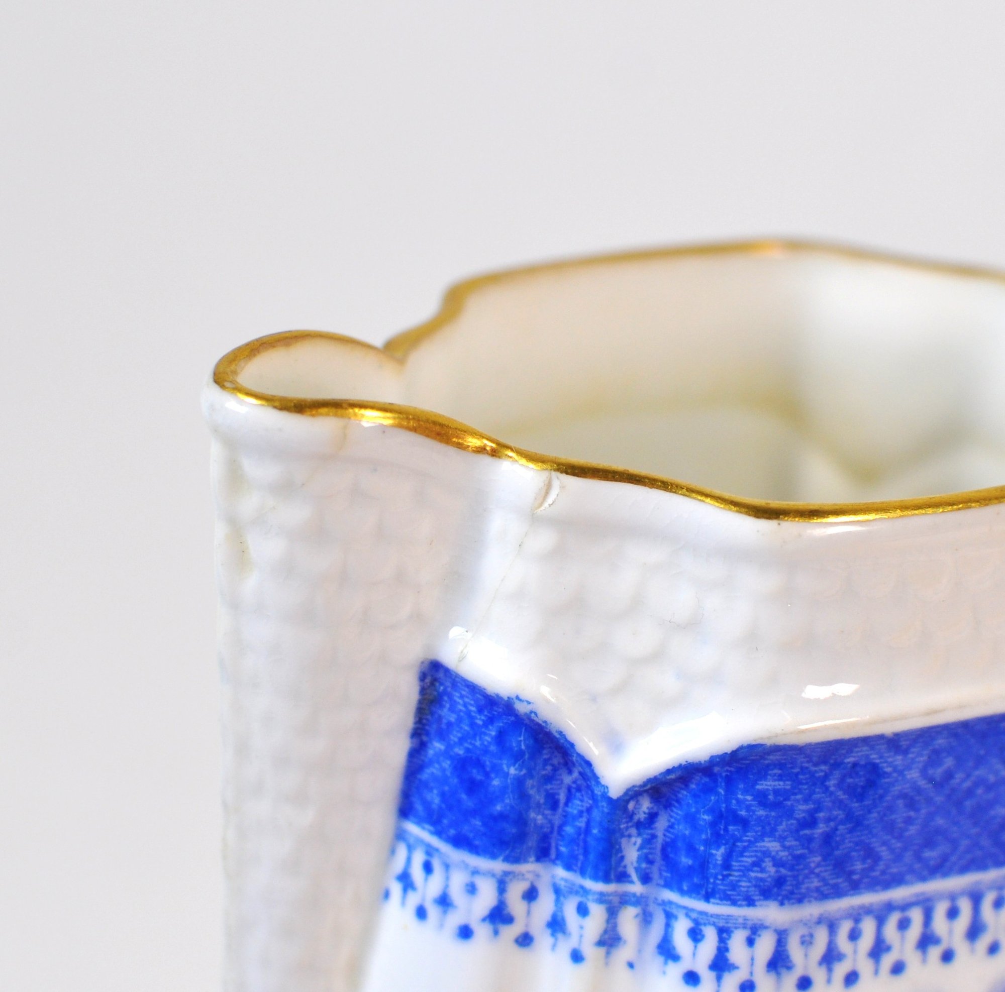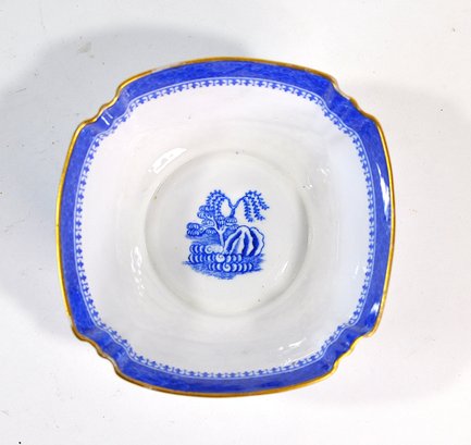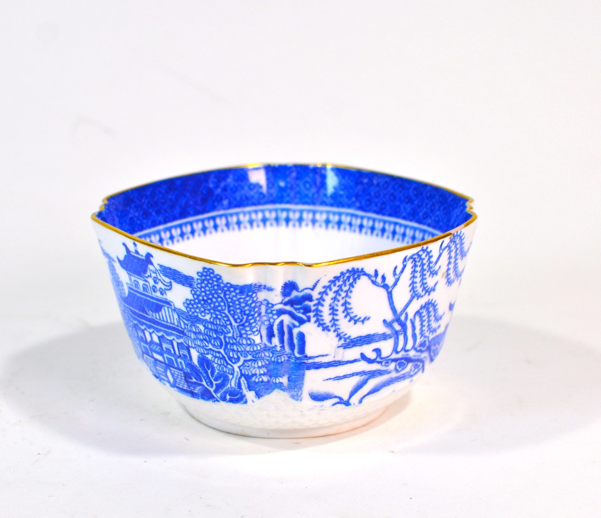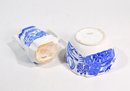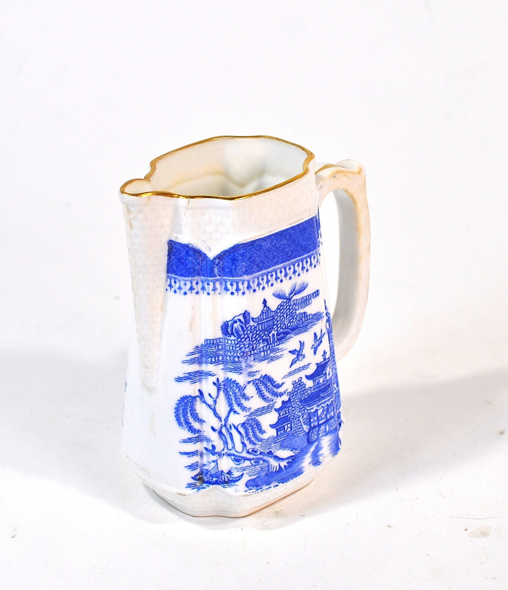 Matching blue and white transferware creamer and sugar bowl featuring a traditional Chinese-style landscape pattern with pavilions, trees, birds, and water scenes. Both pieces are accented with scalloped rims and gilt edging, adding a refined decorative touch.
