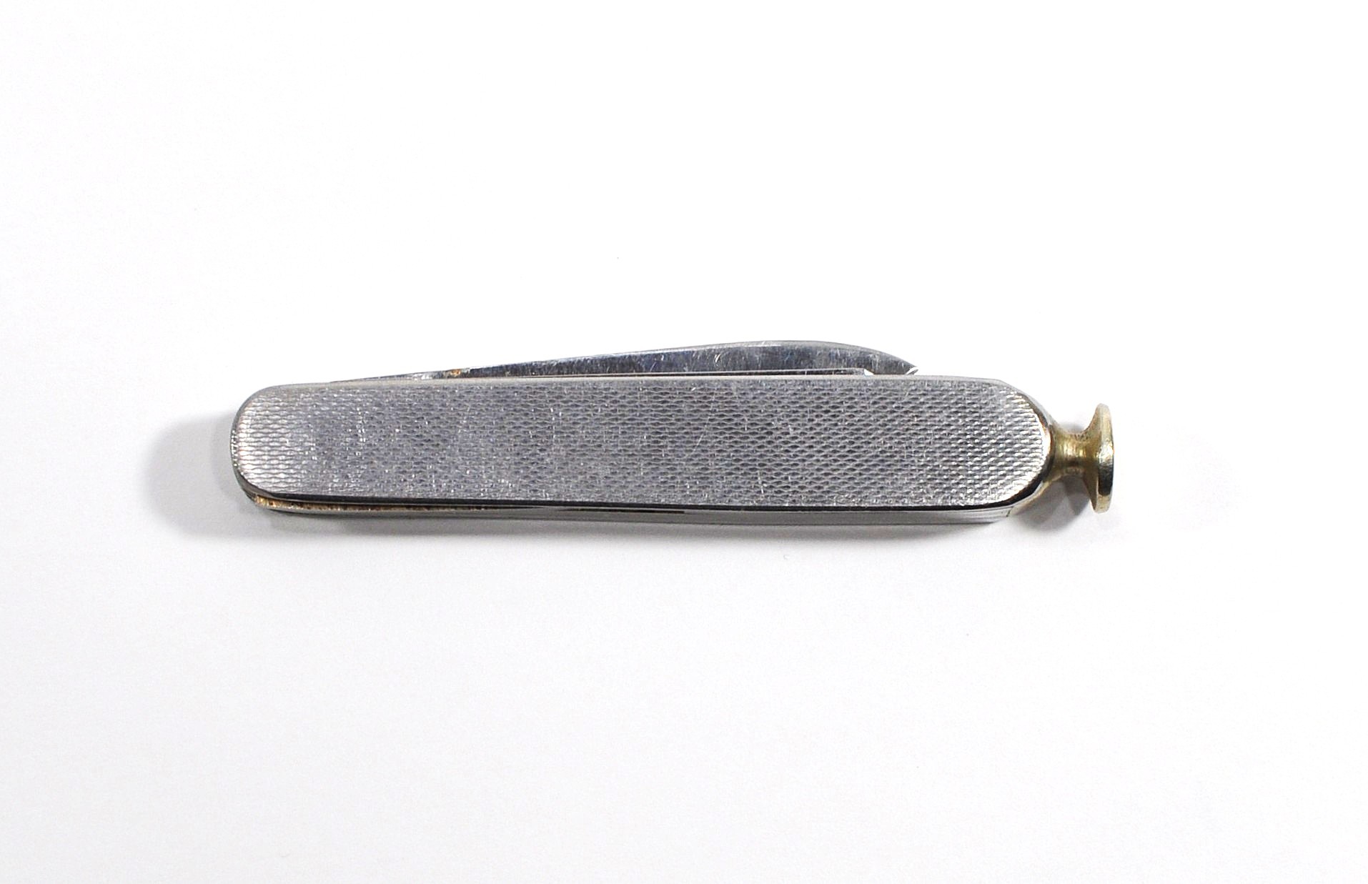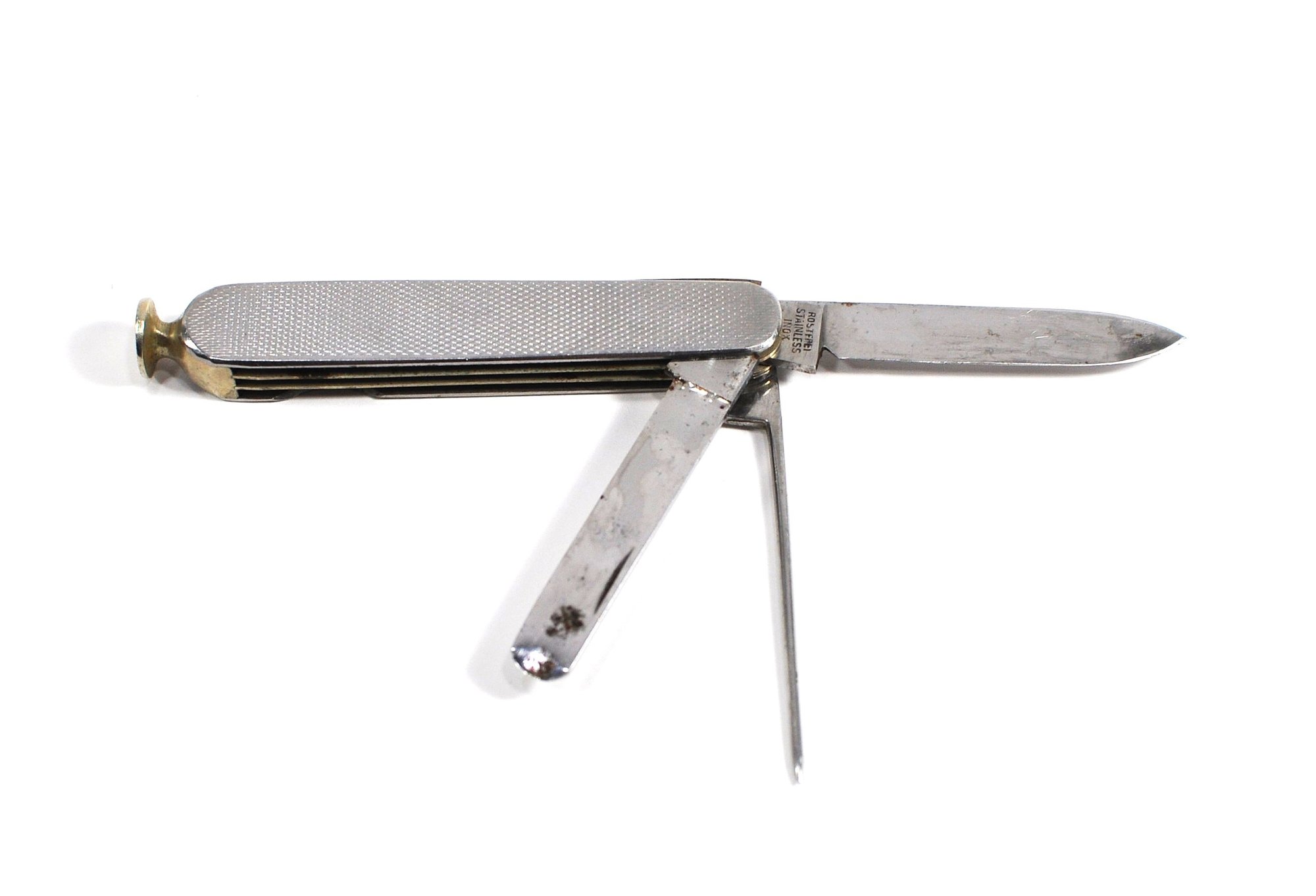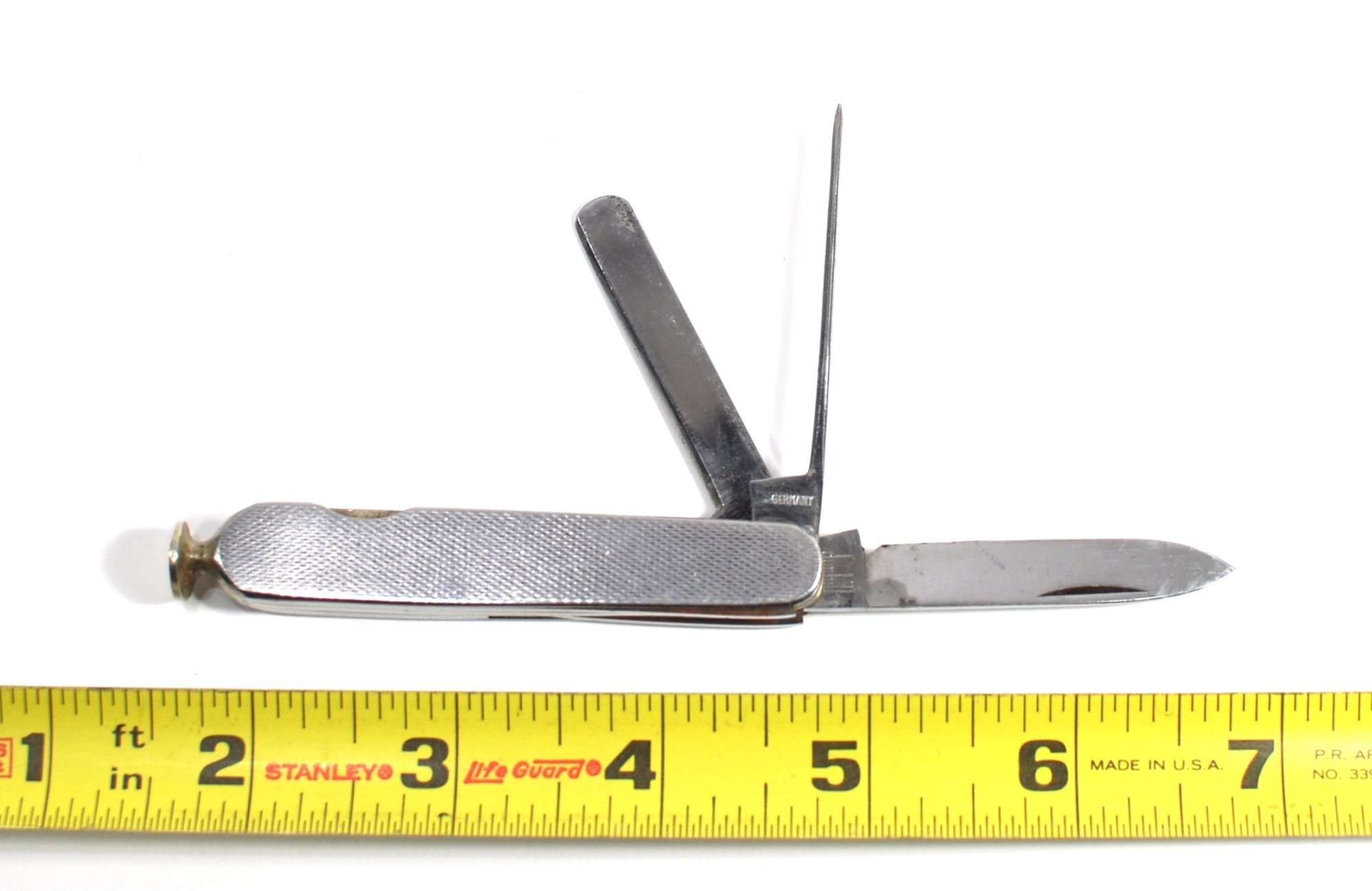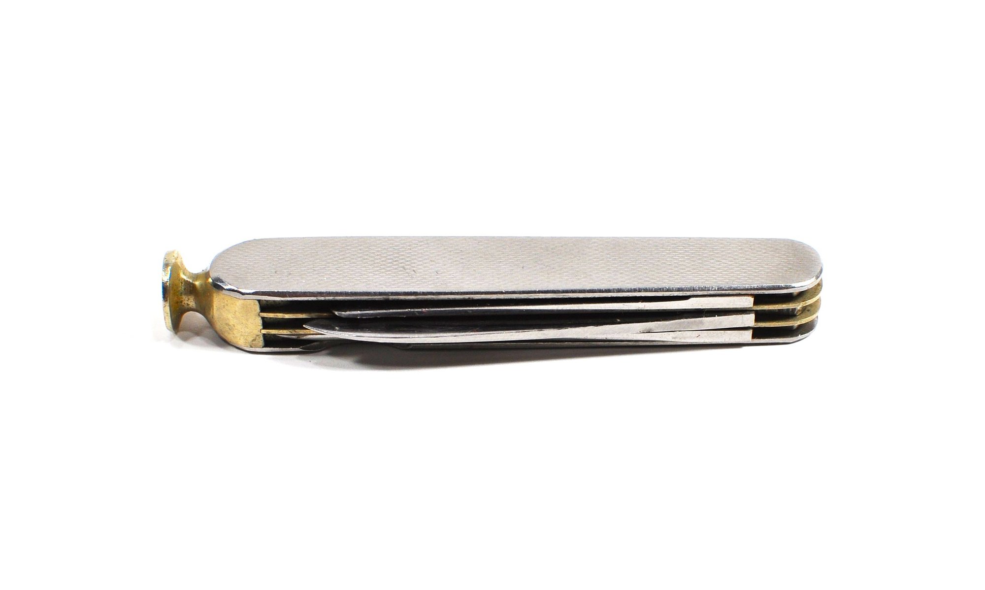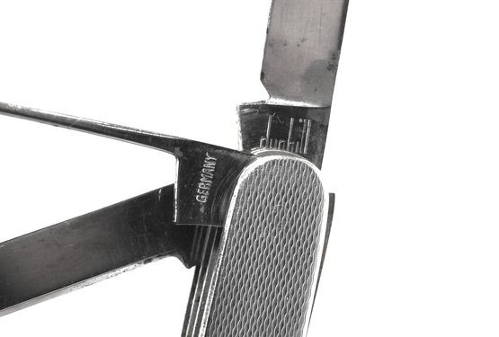 Vintage Dunhill folding pocket knife / multi-tool featuring textured metal handles and multiple stainless steel implements. Marked "Germany".