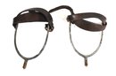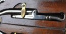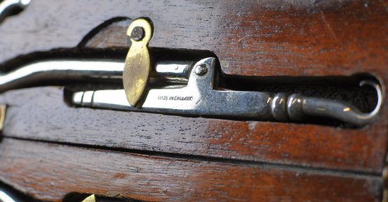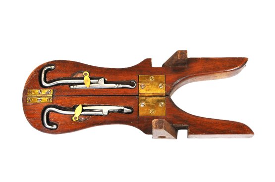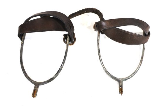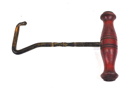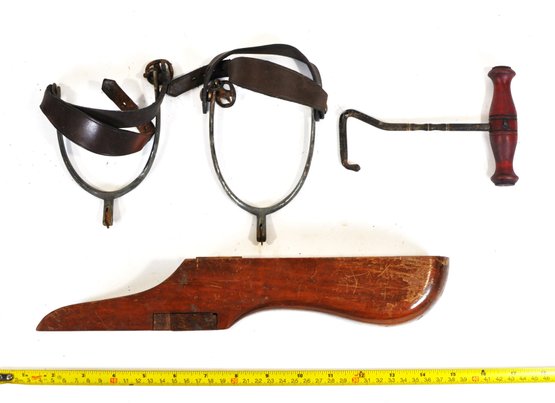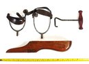 Mixed lot of vintage shoe/boot tools including a hinged wooden boot jack with brass hardware and “Made in England” metal fittings, a wood-handled boot pull hook, and a pair of metal boot stretchers with leather straps. Likely mid-20th century cobbler or riding gear accessories. Showing age wear, scuffs, and rust to metal parts; overall good vintage condition.