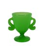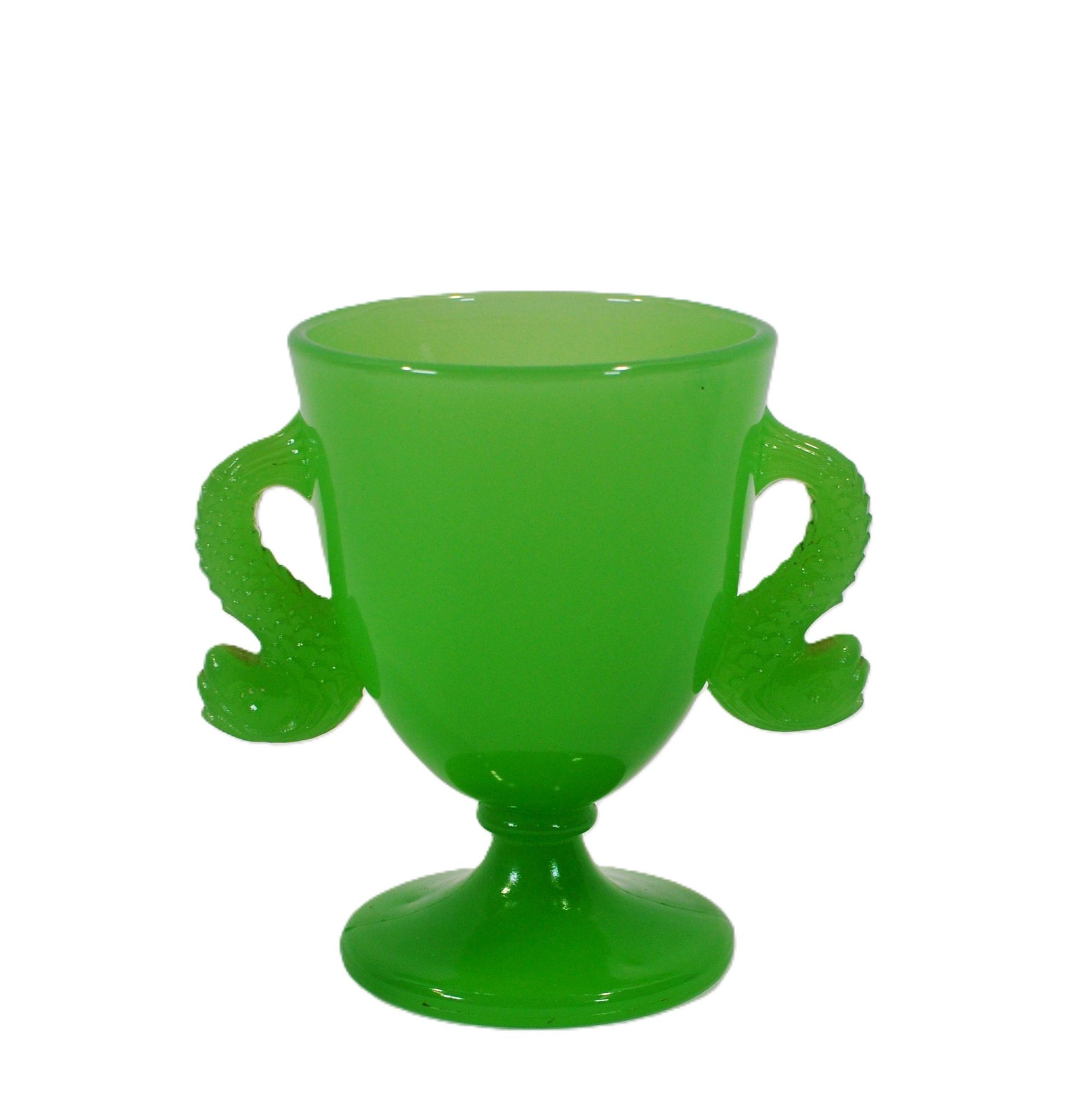 Striking vintage art glass trophy-form vase in a vivid opaque green, featuring two beautifully modeled serpent-shaped handles. Nicely blown with a smooth footed base and clean lines, this piece makes a bold decorative statement.