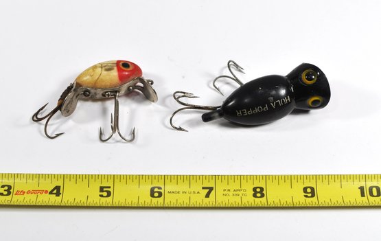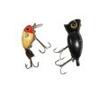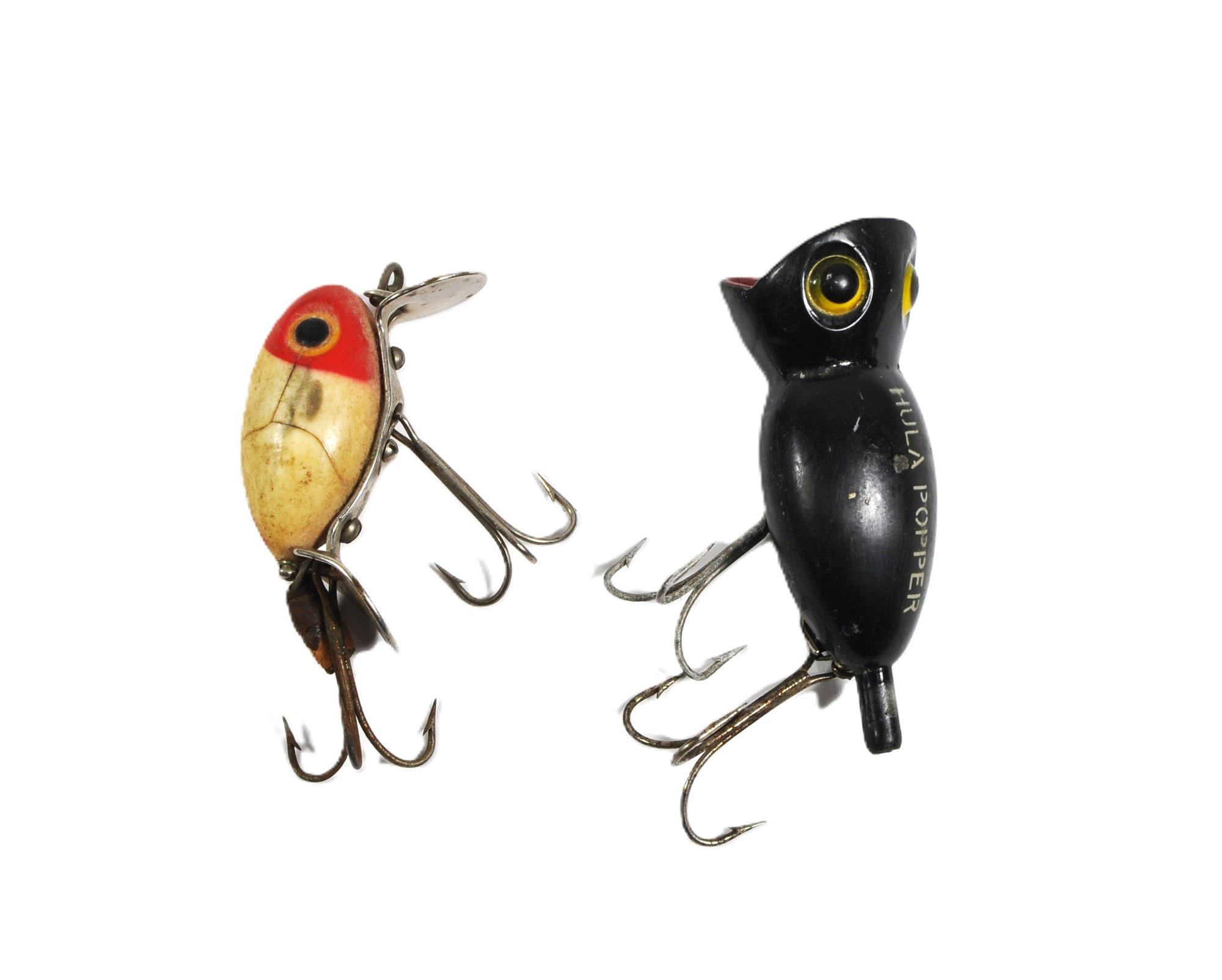 Used fishing lures, including a classic Hula Popper with painted eyes and rubber skirt tail, along with a painted crankbait featuring a red head and metal diving lip. Both are fitted with treble hooks and show honest vintage wear consistent with age and use. A nice grouping for collectors of early tackle or anglers who appreciate old-school lure design. Please see photos for condition and details.