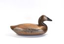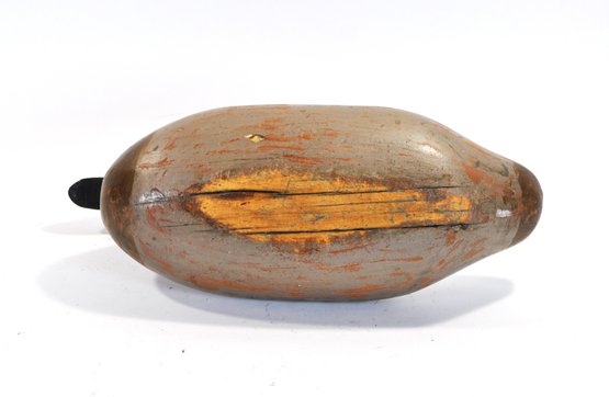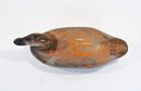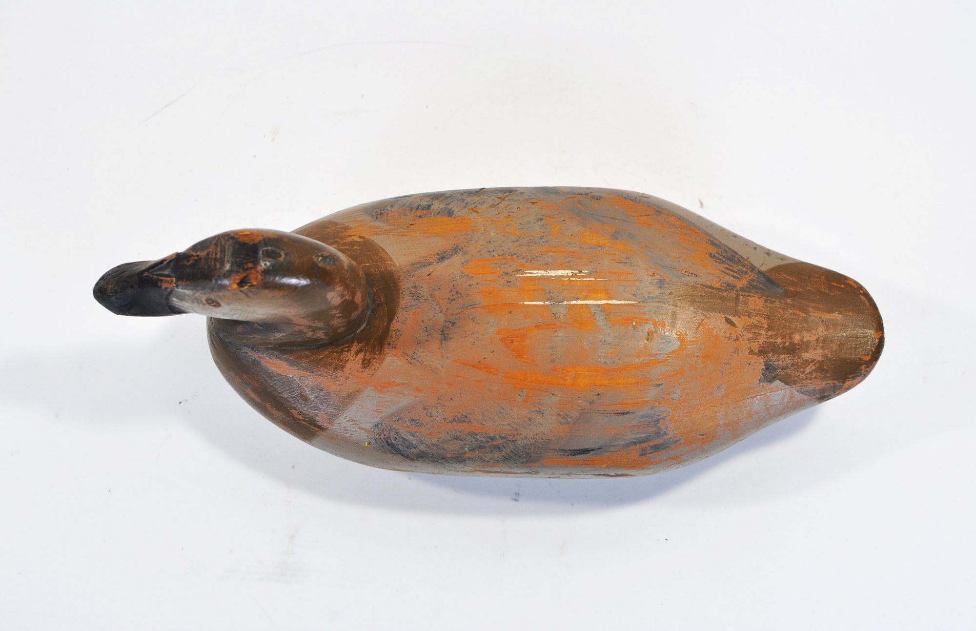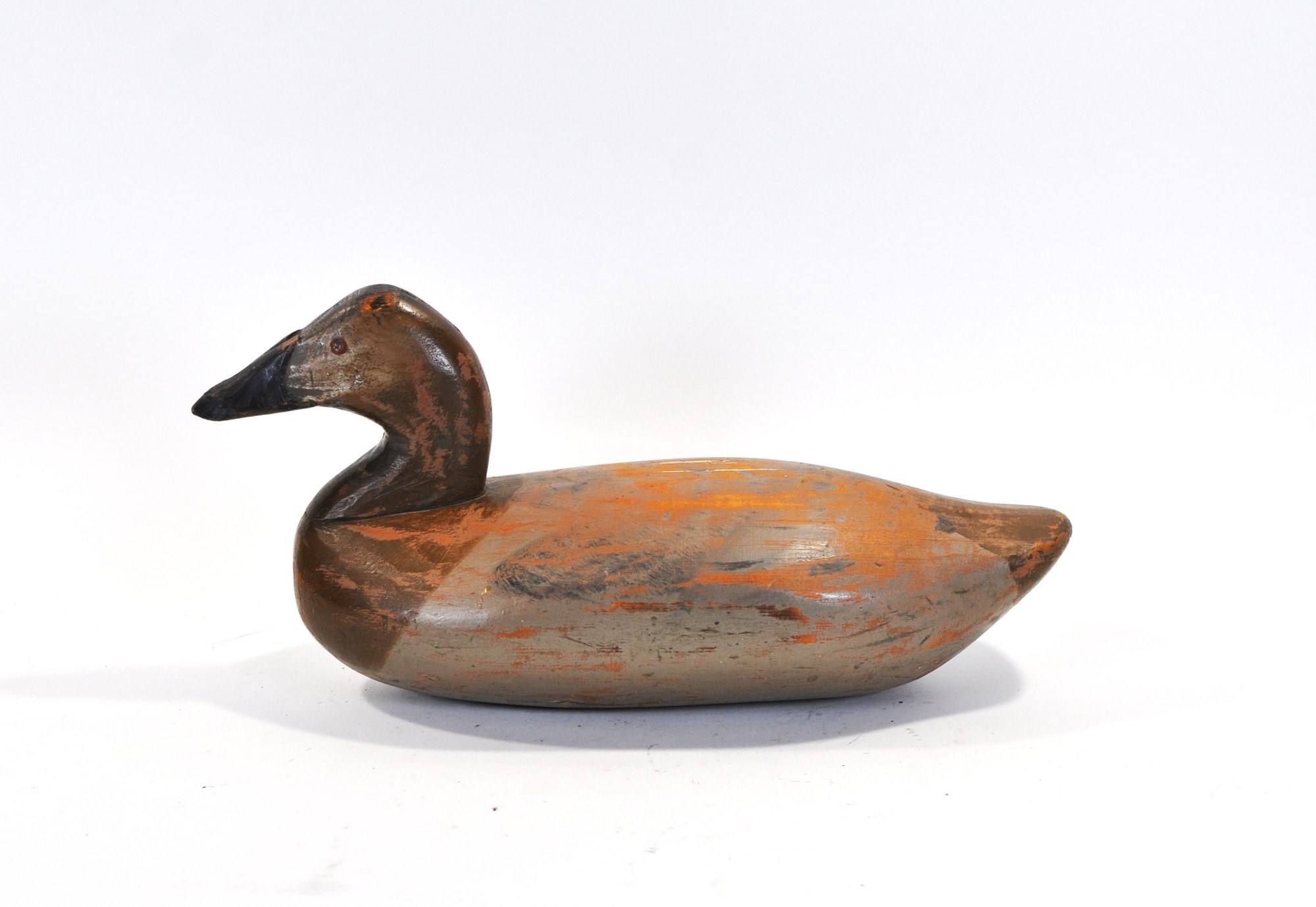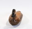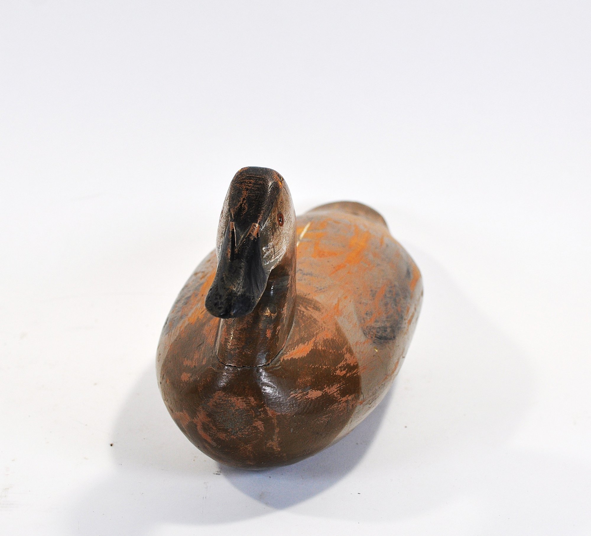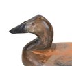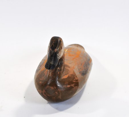 Vintage hand-carved wooden duck hunting decoy featuring a gracefully arched neck and elongated bill. The body displays a warm, weathered paint surface with layered tones of brown, gray, and traces of orange from age and use. The carving has a smooth, rounded form typical of traditional working decoys, with simple painted eyes and a naturalistic profile.