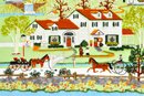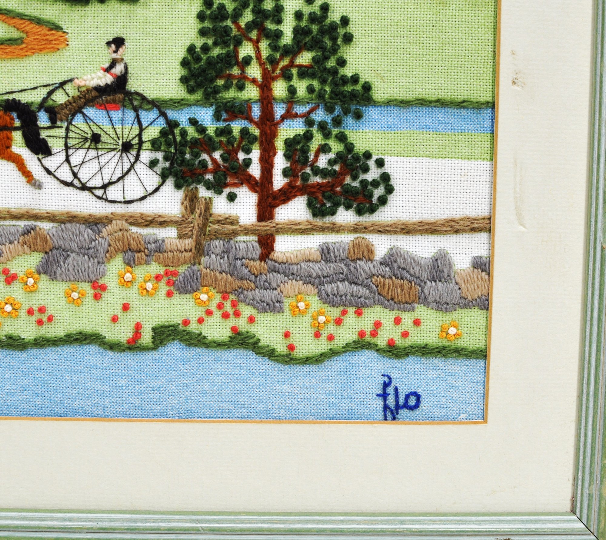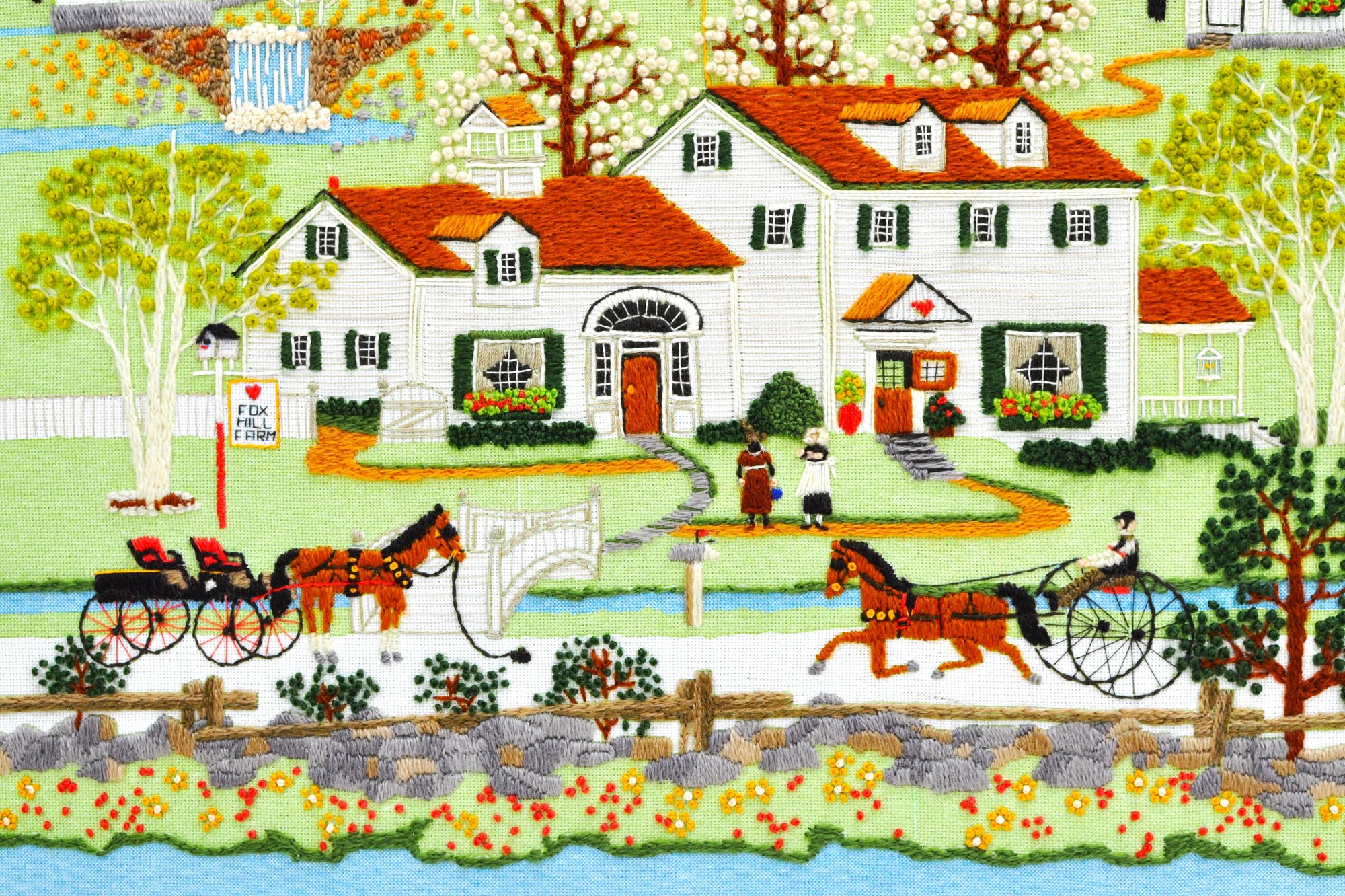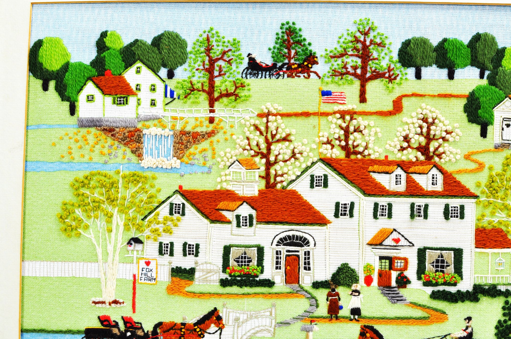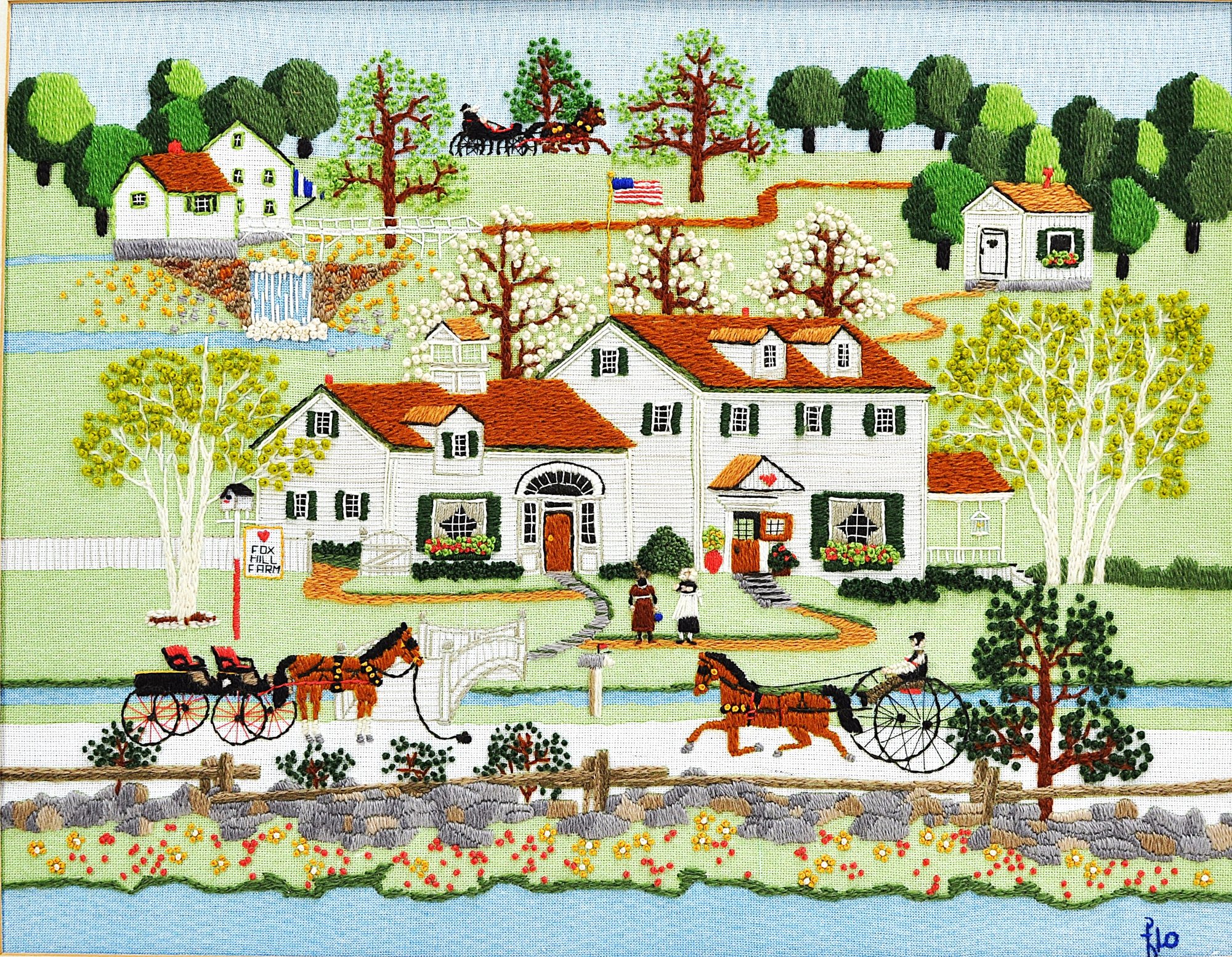 Colorful hand-stitched needlepoint depicting a charming rural “Fox Hill Farm” scene with house, figures, and horse-drawn carriages. Signed “Flo” at lower right. Presented in a painted wood frame with mat.