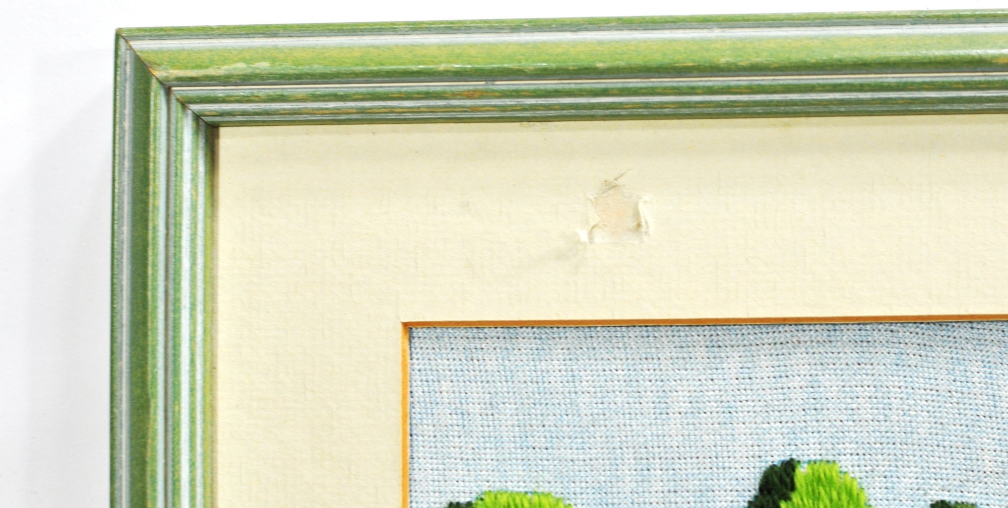 Condition: Good overall; minor mat toning and light frame wear. Needlework remains bright.