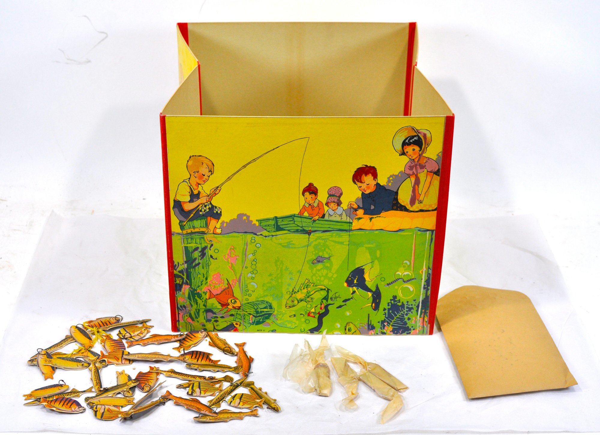 Complete vintage “Go Fishing” magnetic game featuring a brightly illustrated folding box depicting children fishing, along with a set of colorful numbered fish cutouts and magnetic fishing poles.