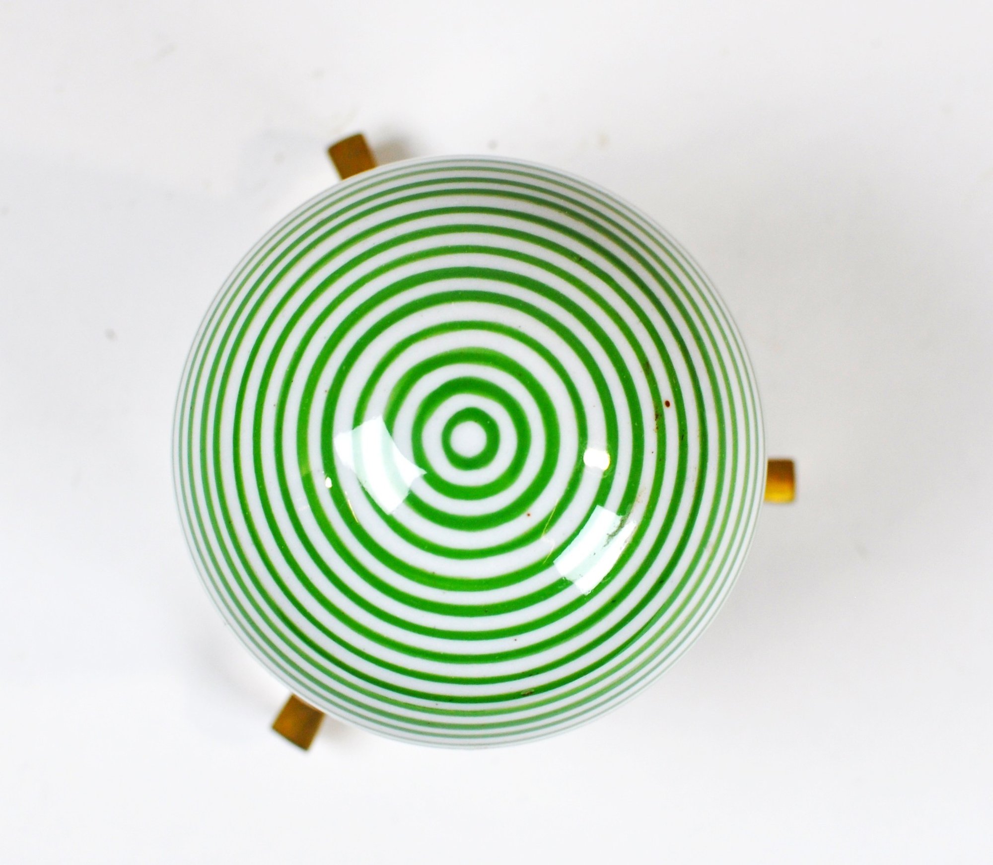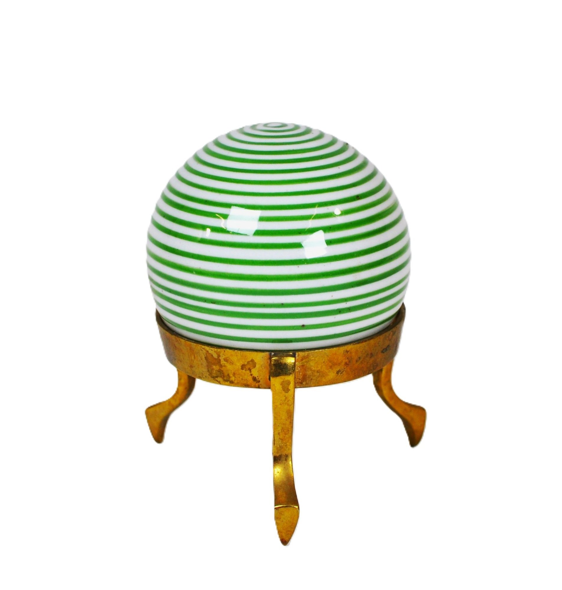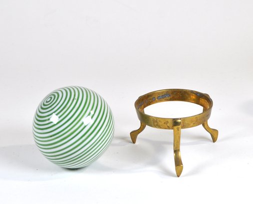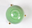 Decorative art glass sphere featuring bold concentric green and white spiral striping, creating a hypnotic optical effect. The glass orb is paired with its original brass tripod stand, showing a warm aged patina consistent with age.