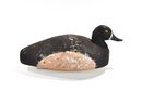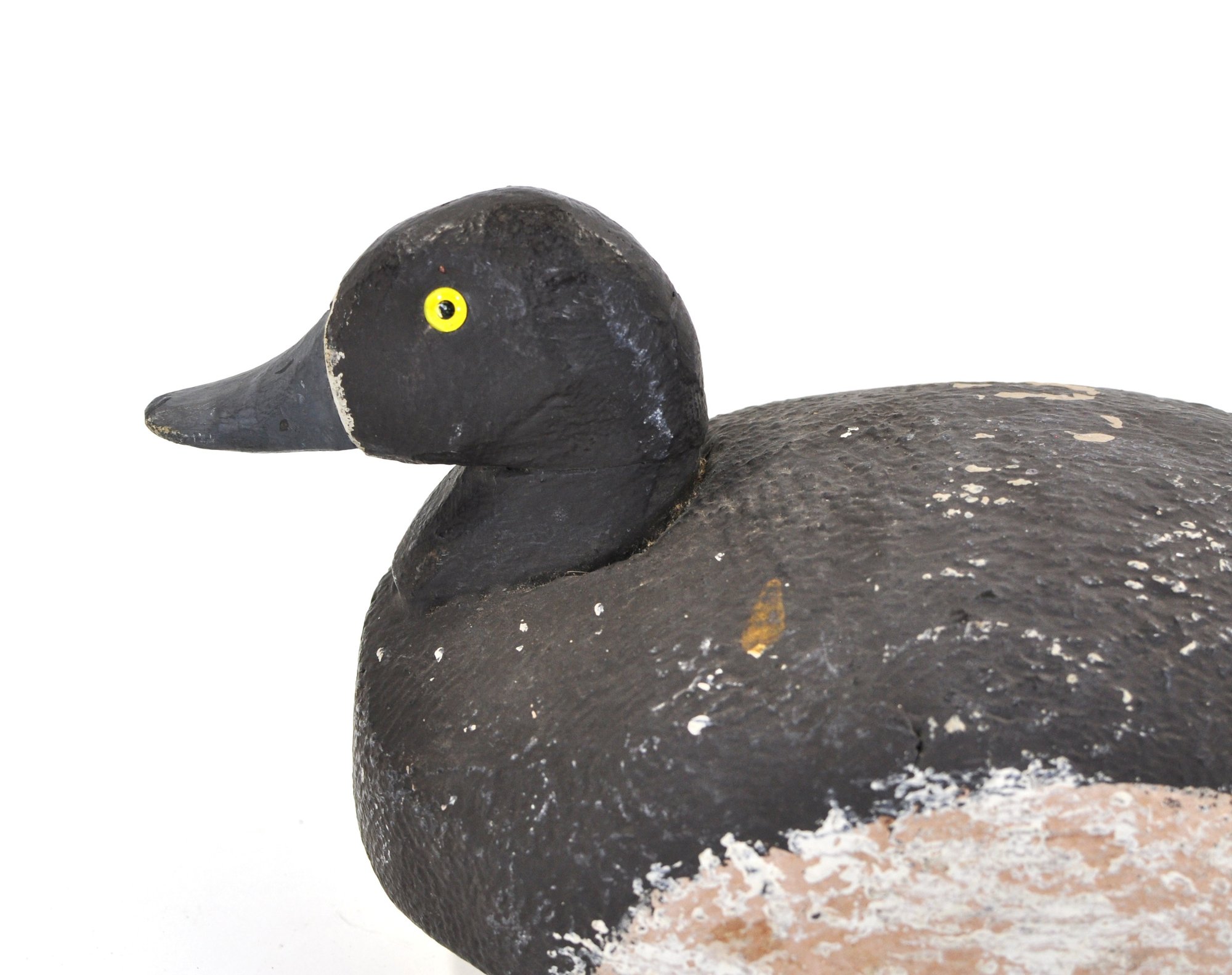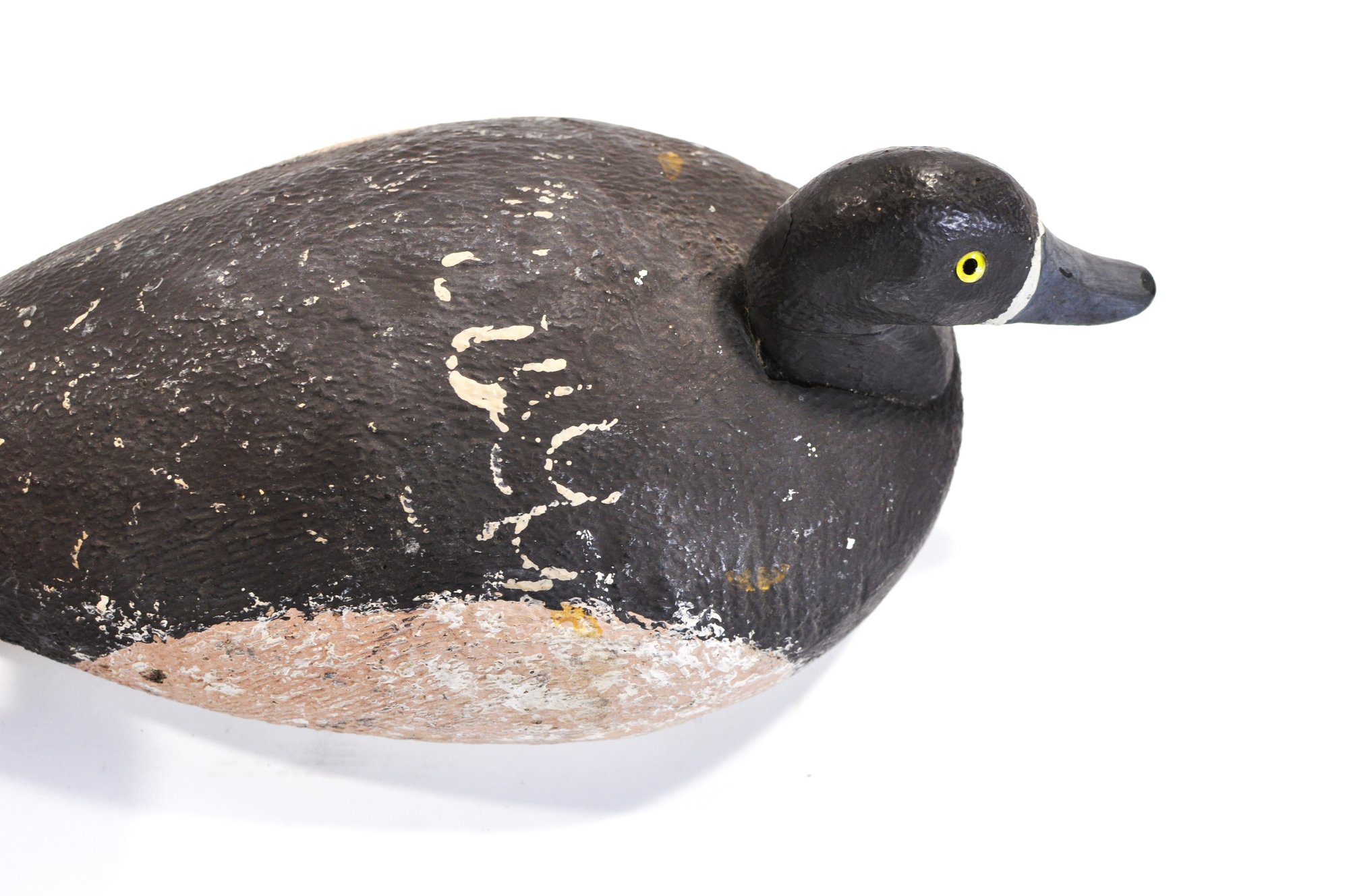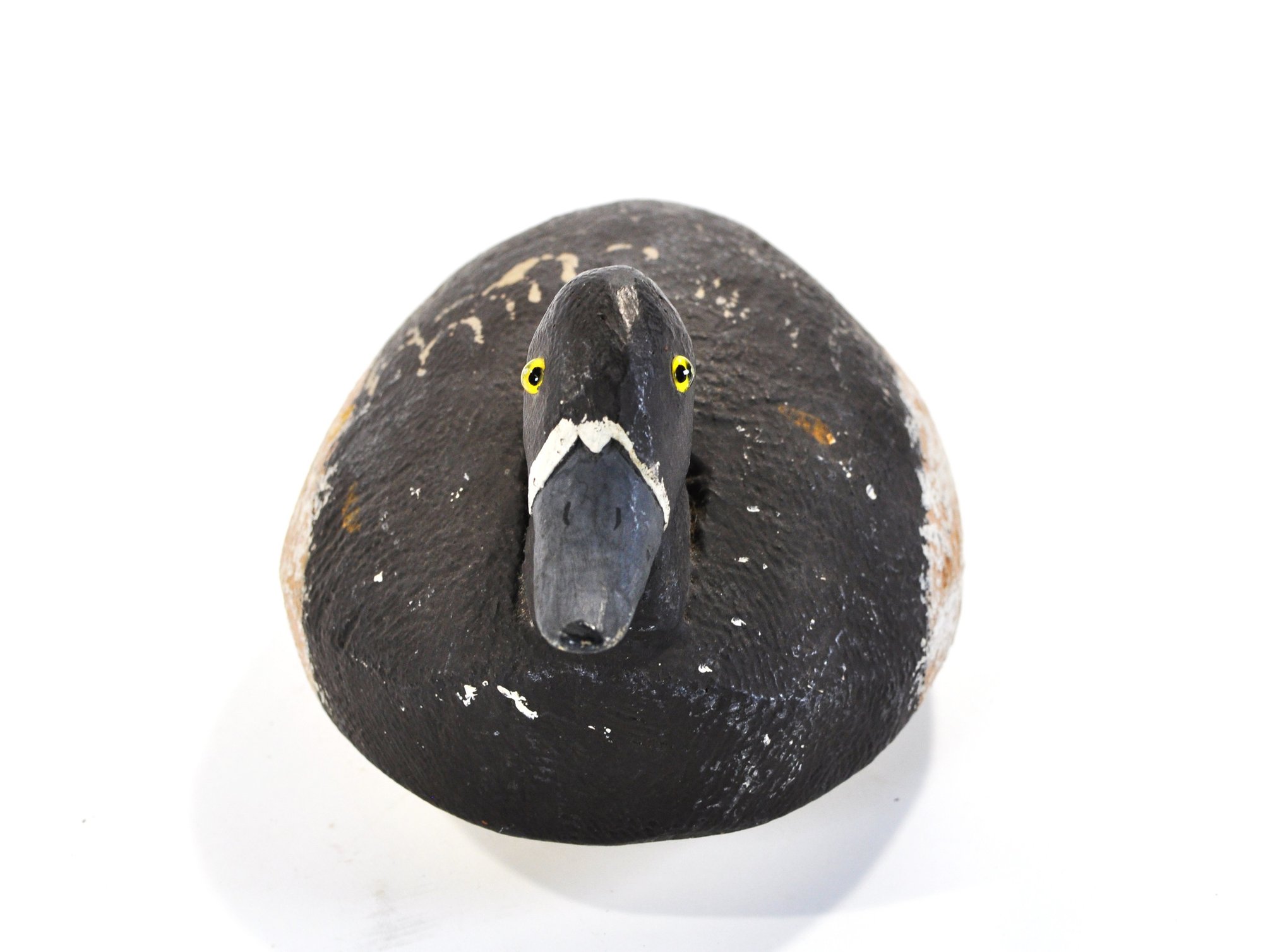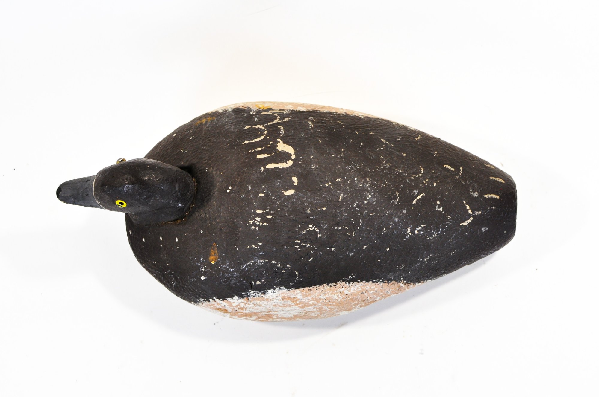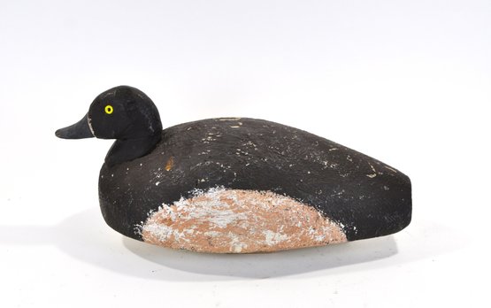 Vintage hand-carved Bluebill (Scaup) duck hunting decoy with a classic low-profile body and rounded head. The decoy is painted in traditional dark tones with a lighter belly and features bright yellow painted eyes and a gray bill. The surface shows textured carving and heavy paint wear from long use.