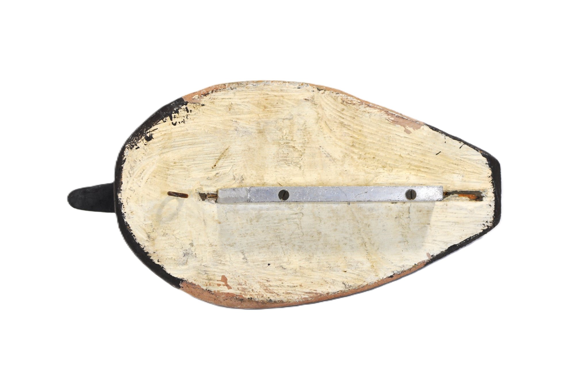 The underside retains its metal keel weight, secured with screws, indicating it was a working field decoy used for water hunting. A solid, well-worn example with strong folk-art character and authentic gunning wear.