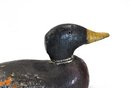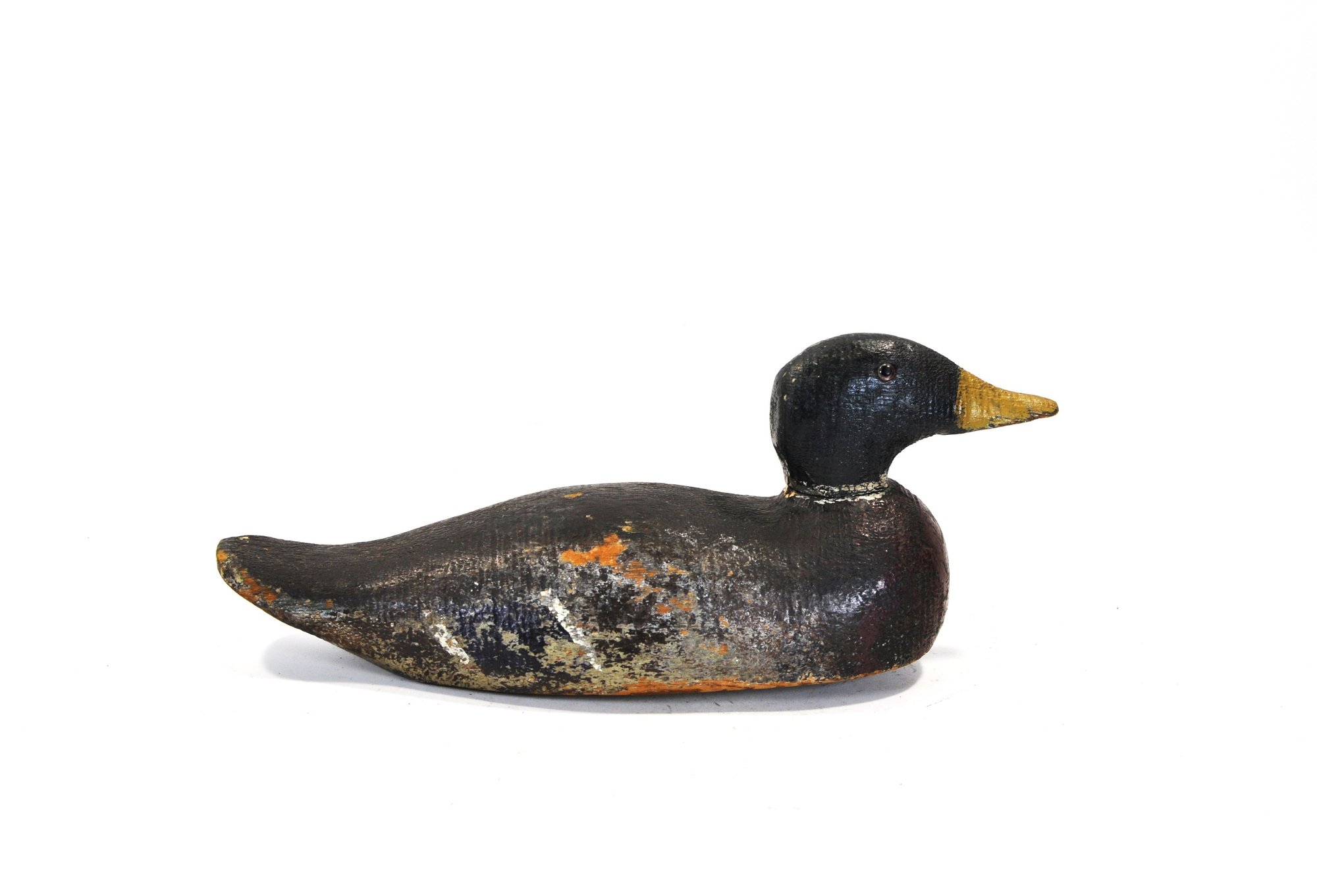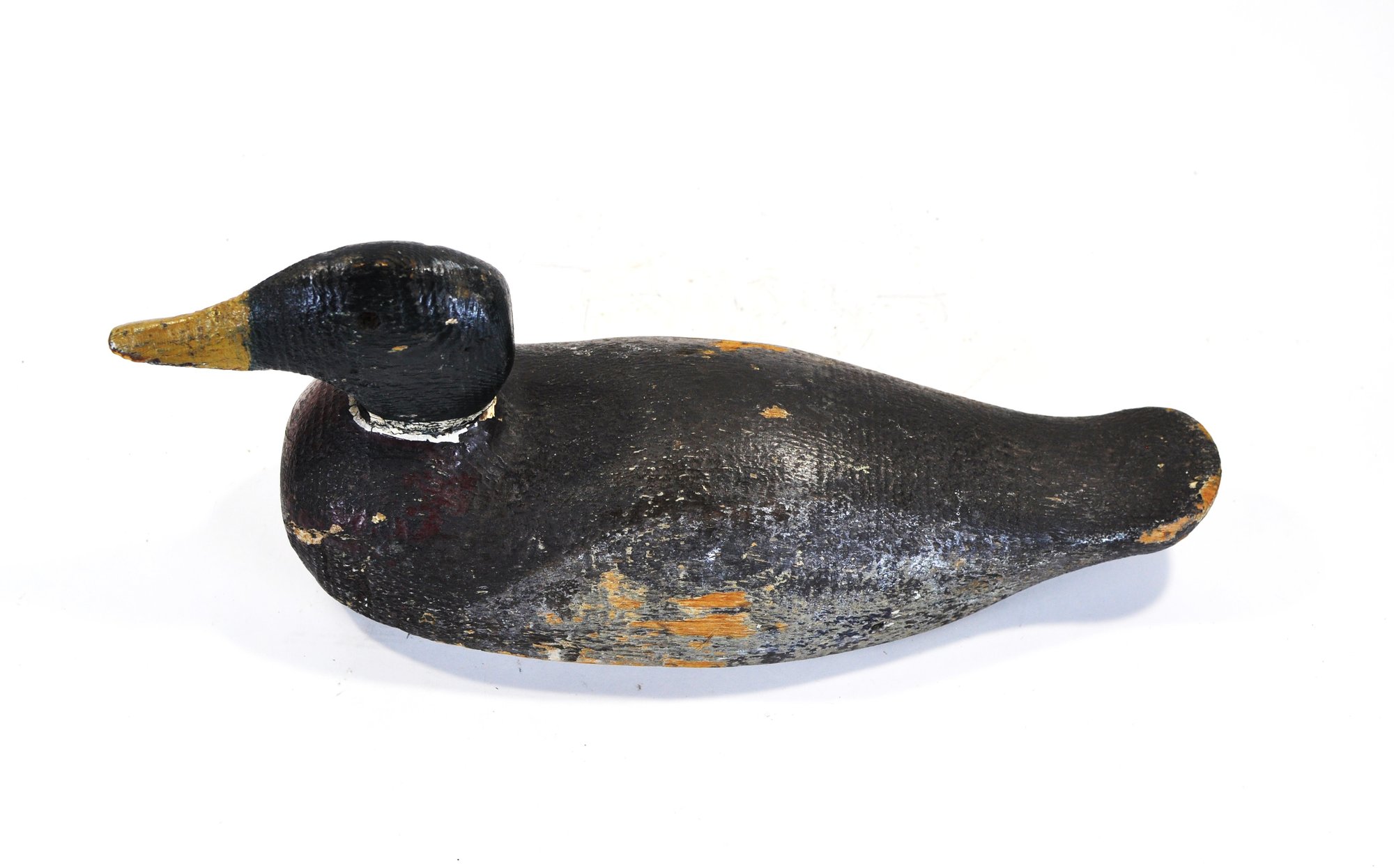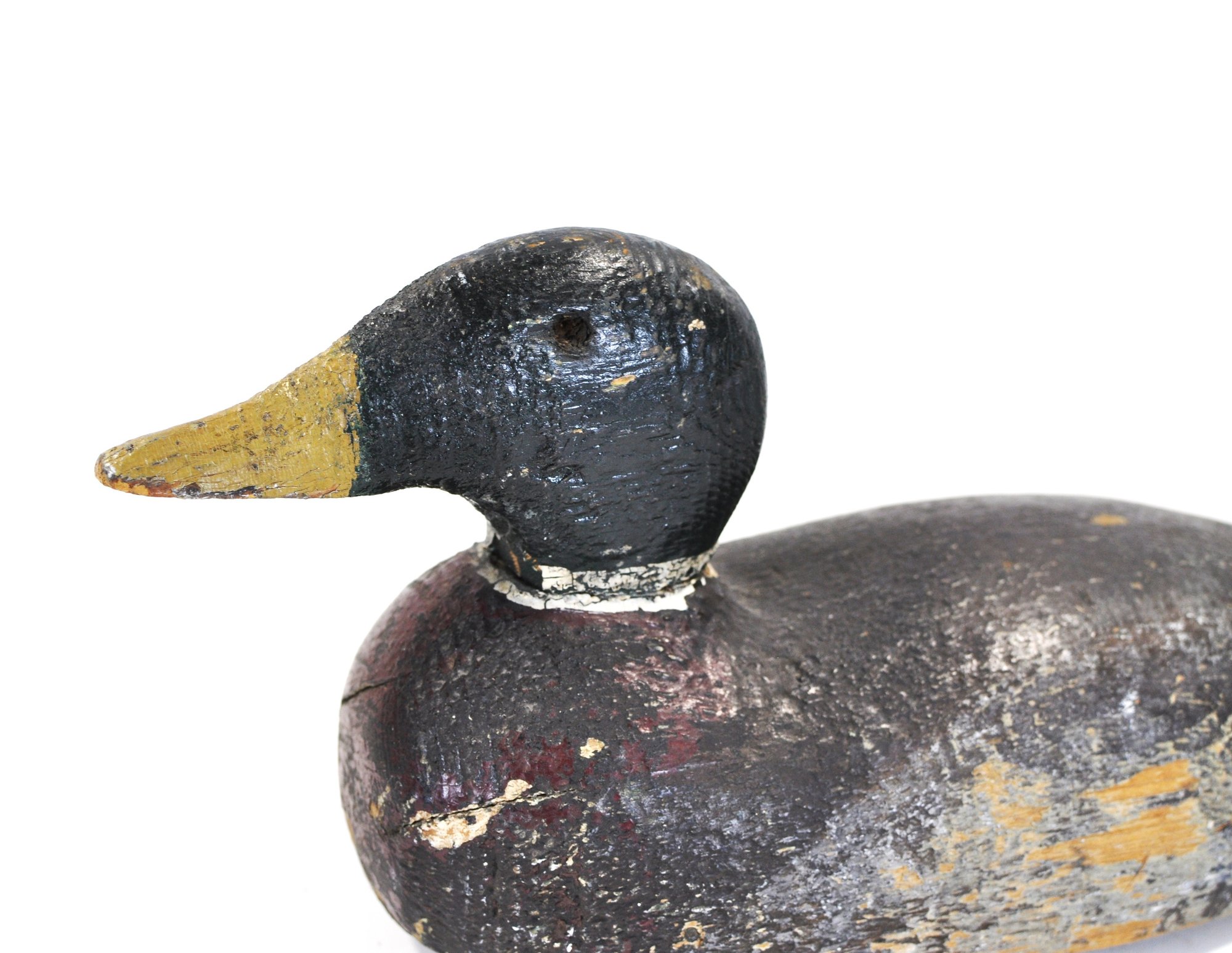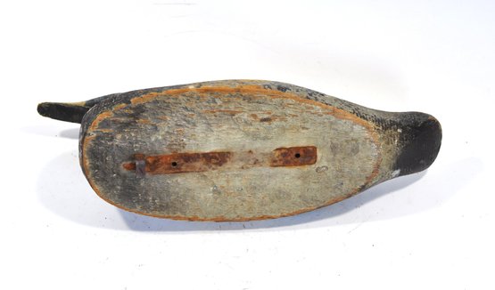 Early hand-carved wooden duck decoy featuring a rounded head, slightly upturned tail, and original dark-painted surface with visible age wear. Retains inset glass eyes and a yellow-painted bill. The body shows layered, weathered paint with areas of loss revealing earlier finishes and wood beneath, giving it strong character. Underside fitted with an old iron strap keel weight, indicating use as a working decoy.
